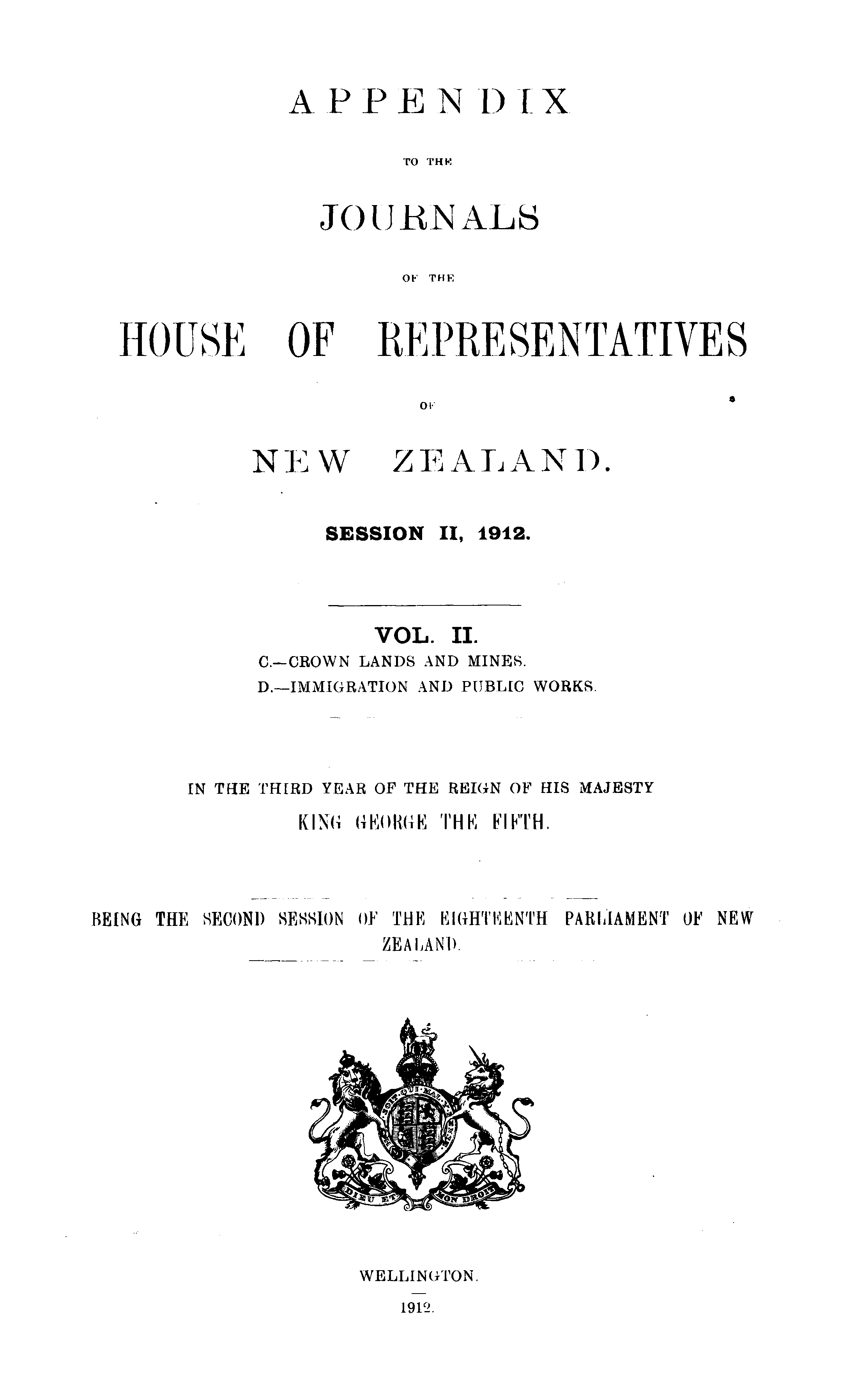 VOL. 11. C—CROWN LANDS AND MINES. D.—IMMIGRATION AND PUBLIC WORKS. IN THE THIRD YEAR OF THE REIGN OF HIS MAJESTY KING GEORGE THE FIFTH. BEING THE SECOND SESSION OF THE EIGHTEENTH PARLIAMENT OF NEW ZEALAND.