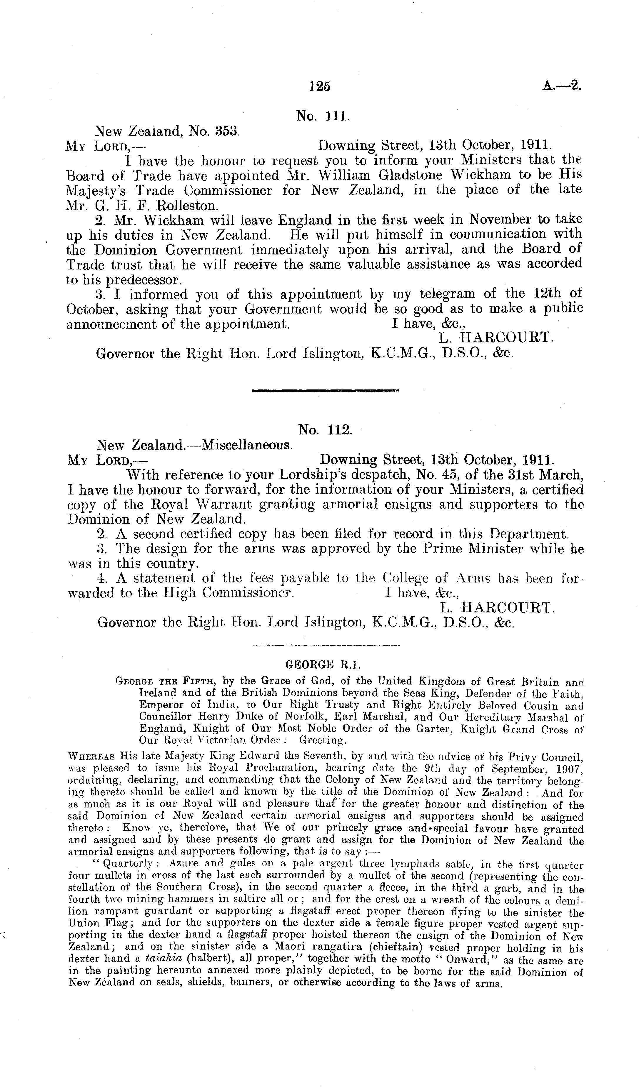 No. 112. New Zealand.—Miscellaneous. My Lord, — Downing Street, 13th October, 1911. With reference to your Lordship's despatch, No. 45, of the 31st March, I have the honour to forward, for the information of your Ministers, a certified copy of the Royal Warrant granting armorial ensigns and supporters to the Dominion of New Zealand. 2. A second certified copy has been filed for record in this Department. 3. The design for the arms was approved by the Prime Minister while he was in this country. ■1. A statement of the fees payable to the College of Anns has been forwarded to the High Commissioner. I have, &c, I, HARCOURT. Governor the Right Hon. Lord Islington, K.C.M.G., D.S.O., &c.