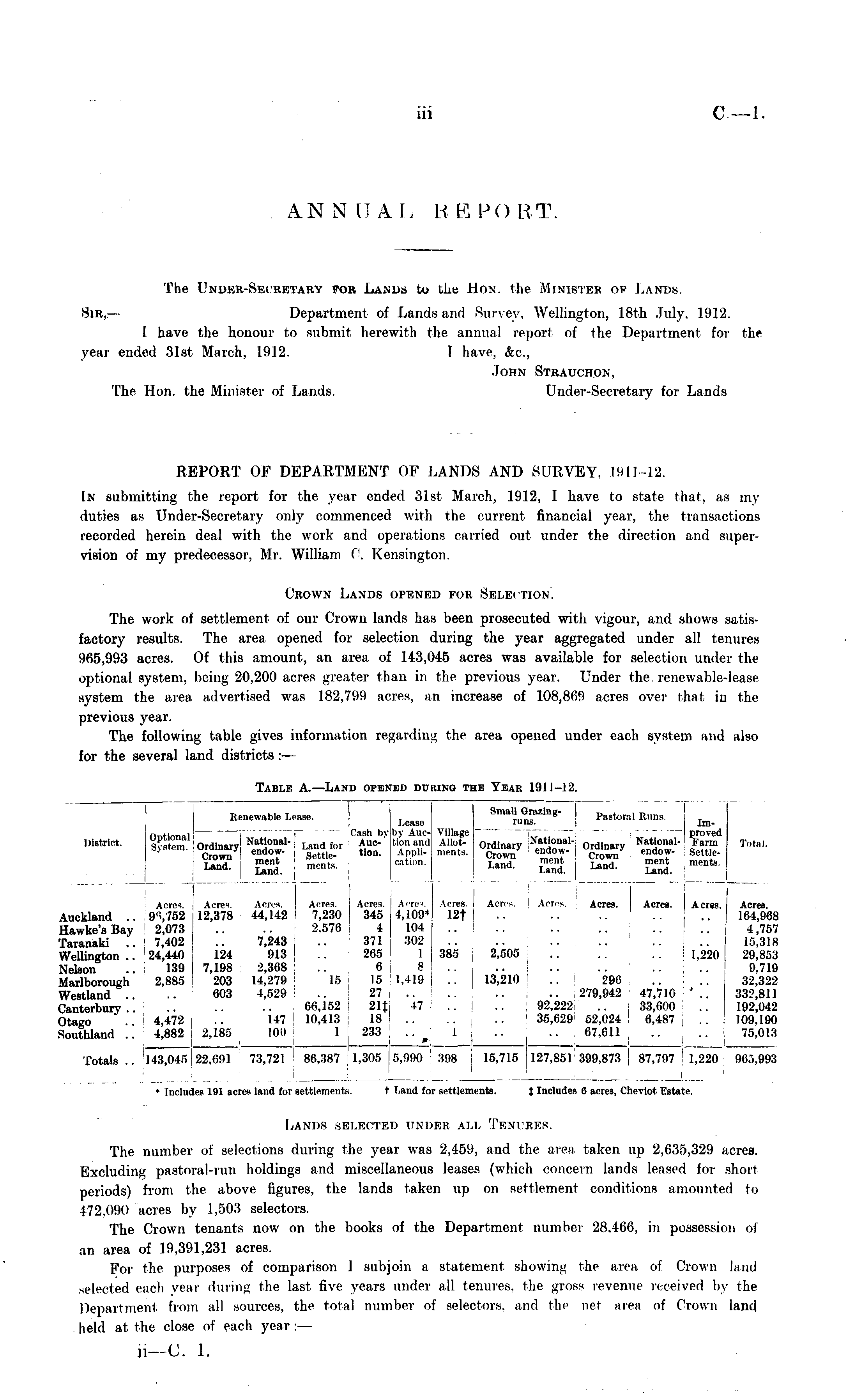 ANNUAL REPORT. The Cndkk-Secretary for Lanus tv the Hon. the Minister of Lands. Bir, : — Department of Lands and Survey, Wellington, 18th July. 1912. I have the honour to submit herewith the annual report of the Department foi the year ended 31st March, 1912. I have. &c, • IOHN StRAUCHON, The Hon. the Minister of Lands. I'nder-Secretary for Lands REPORT OF DEPARTMENT OF LANDS AND SURVEY. 1911-12. In submitting bhe report for the year ended 31st March, 1912, I have to state that, as mv duties as (Inder-Secretary only commenced with the current financial year, the transactions recorded herein deal with the work and operations carried out under the direction and supervision of my predecessor, Mr. William 0. Kensington. Crown Lands opened pob Selection. The work of settlement of our Crown lands has been prosecuted with vigour, and shows satisfactory results. The area opened for selection during the year aggregated under all tenures 965,993 acres. Of this amount, an area of 143,045 acres was available for selection under the optional system, being 20,200 acres greater than in the previous year. Under the renewable-lease system the area advertised was 182,799 acres, an increase of 108,869 acres over that in the previous year. The following table gives information regarding the area opened under each system and also for the several land districts: —