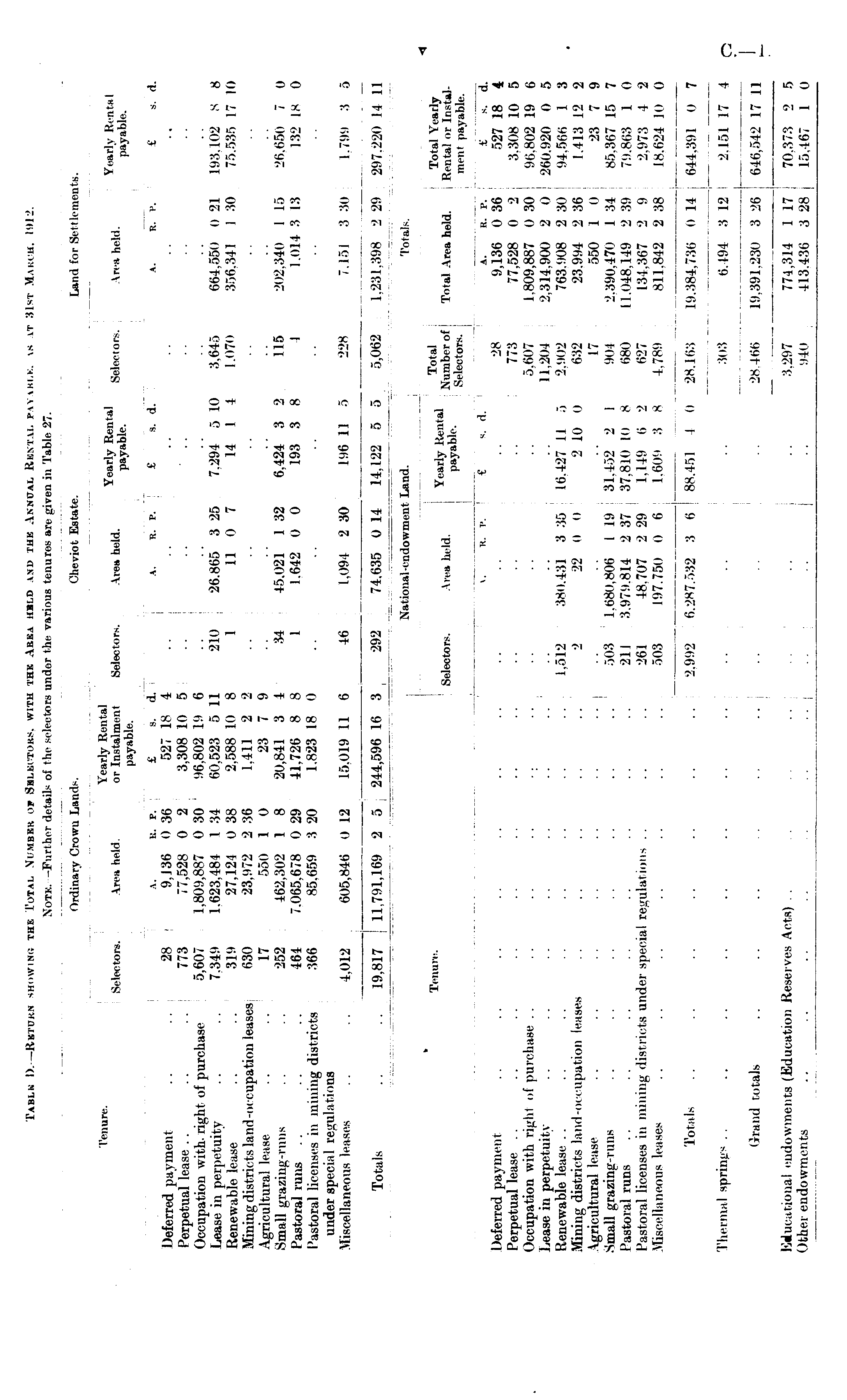Table D.-Return showing the Total Number of Selectors, with the Area held and the Annual Rental payable, as at 31st Marc h, 1912.