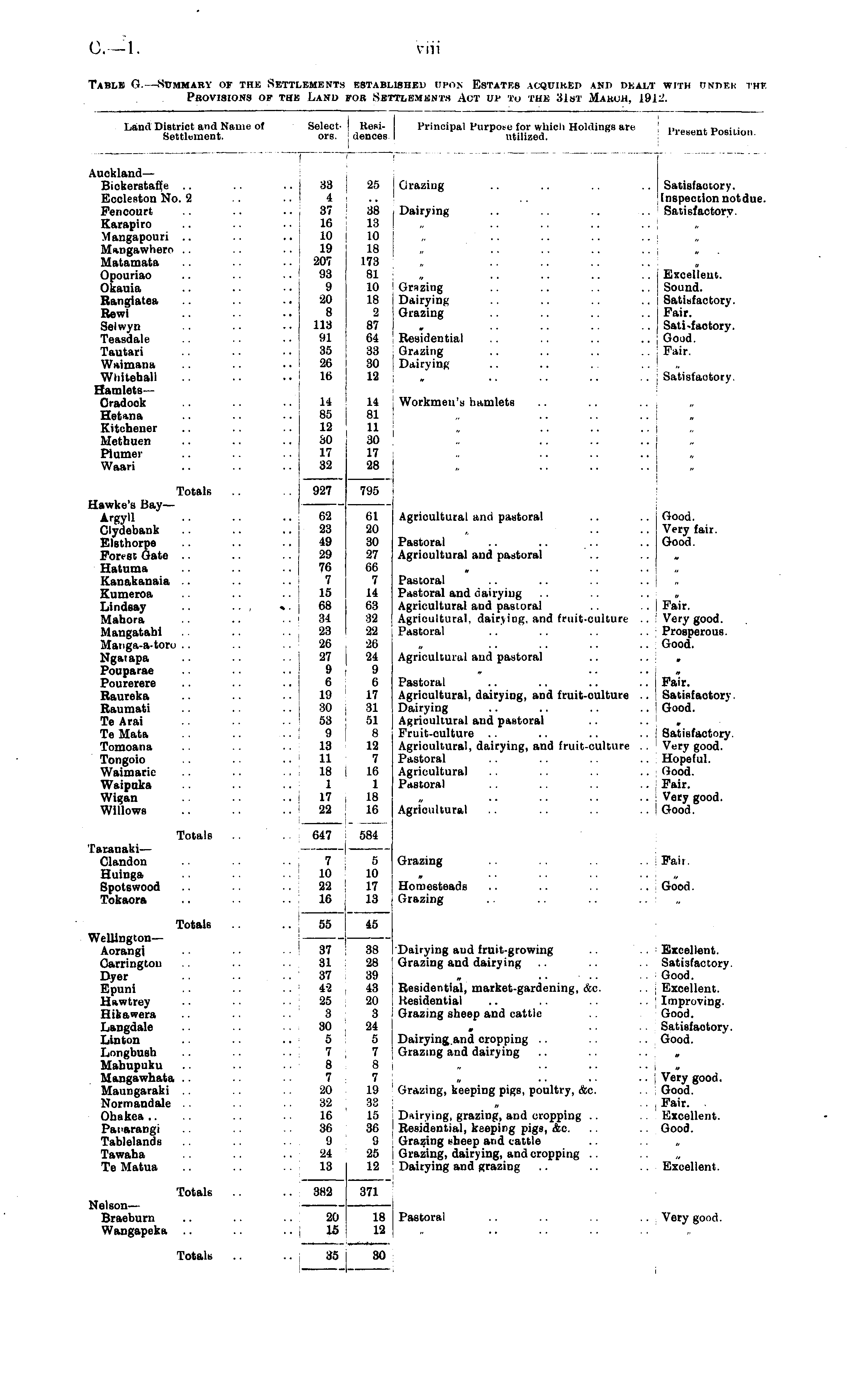 Land District and Nome of Select- I Settlement. ors. ] Selectors. I Residences I Residences I Principal Puirpose tar which Holdings arc , ,,.,. M , ut p ogilion . i I I J Auckland— Biokerstafie .. .. I 33 j Ecoleston No. 2 4 Pencourt .. .37 Karapiro .. .. 16 j Mangapouri .. .. 10 Mangawhern .. 19 Matamata .. 207 Opouriao .. .. .. 93 Okauia .. . ■ • • 9 Rangiatea .. ■ • 20 Rewi .. 8 Selwyn .. •• 113 Teasdale .. 91 Tautari .. • ■ 35 Waimana .. .. 26 Whitehall .. .. 16 Hamlets — Cradook .. 14 Hetana .. - - - ■ 85 Kitchener .. .. .. 12 Methuen .. .. 80 Plumer 17 Waari .. .. 32 38 4 37 16 10 19 207 93 9 20 8 113 91 35 26 16 25 38 13 10 18 173 81 10 18 2 87 64 33 30 12 14 81 11 30 17 28 25 38 13 I 10 : 18 173 81 10 18 2 87 64 33 \ 30 I 12 Grazing .. .. .. .. Satisfactory. Inspection notdue. Dairying .. .. .. .. Satisfactory. . Excellent. Grazing .. .. .. .. j Sound. Dairying .. .. .. Satisfactory. Grazing .. j Fair. .. Sati-faotory. Residential .. .. .. Good. Grazing .. .. .. Pair. Dairying .. .. .. .. ! .. ; Satisfactory. 14 85 12 30 17 32 14 81 11 30 17 28 Workmen's hamlets „ 927 . Totals .. 927 795 795 Hawke's Bay— Argyll .. .. .. 62 Clydebank .. ..23 Elsthorpe .. .. .. 49 Portst Gate .. .. 29 Hatuma .. 76 Kanakanaia .. 7 Kumeroa .. 15 Lindsay .• ■. , »• 68 Mahora .. 34 Mangatabi 23 Manga-a-toru .. 26 Ngatapa 27 Pouparae .. 9 Pourerere .. .. 6 Raureka .. .. .. 19 Raumati .. 30 Te Arai 53 ! Te Mata .. 9 Tomoana .. 13 Tongoio .. 11 Waimarie 18 i Waipuka .. 1 Wigan .. ..17 Willows .. .. ..22 62 23 49 29 76 7 15 68 34 23 26 27 9 6 19 30 j 53 ! 13 11 18 j 1 17 22 61 20 30 27 66 7 14 63 32 22 26 24 9 6 17 31 51 8 12 7 i 16 1 18 16 61 20 30 27 66 7 14 63 32 22 26 24 9 6 17 31 51 8 12 7 i 16 1 18 16 Agricultural and pastoral .. .. Good. ,. .... Very fair. Pastoral .. Good. Agricultural aud pastoral Pastoral Pastoral and dairying Agricultural aud pastoral .. Pair. Agricultural, dairying, and fruit-culture Very good. Pastoral .. Prosperous. .. Good. Agricultural and pastoral .. « Pastoral .. .. .. .. Pair. Agricultural, dairying, and fruit-culture Satisfactory Dairying .. .. .. Good. Agricultural aud pastoral .. , Fruit-culture .. .. .. Satisfactory. Agricultural, dairying, and fruit-culture .. Very good. Pastoral .. Hopeful. Agricultural .. Good. Pastoral Fair. Very good. Agricultural .. .. .. .. 'Good. Totals 647 584 584 Taranaki— Clandon 7 Huinga .. 10 Spotswood .. ■. 33 Tokaora .. 16 5 10 17 | 13 ■ 5 10 17 13 Grazing Fail. Homesteads .. .. Good. Grazing Totals .. 55 Wellington— Aorangi .. • • 37 Carrington 31 Dyer .. 37 Epuni 42 , Hawtrey .. 25 Hikawera 3 Langdale 30 Linton .. .. 5 Longbush 7 Mahupuku .. • ■ 8 Mangawhata .. 7 Maungaraki 20 Normandale 32 Ohakea .. 16 Panarangi 36 Tablelands .. 9 Tawaha 24 Te Matua .. 13 45 | 38 I 28 j 39 j 43 20 3 24 5 7 8 7 19 33 j 15 36 9 25 12 Dairying aud fruit-growing .. Excellent. Grazing and dairying .. Satisfactory. .. Good. Residential, market-gardening, &c. .. Excellent. Residential .. .. Improving. Grazing sheep and cattle .. Good. , .... Satisfactory. Dairying and cropping .. Good. Grazing and dairying .. „ Very good. Grazing, keeping pigs, poultry, <fec. Good. Fair. Dairying, grazing, and cropping .. Excellent. Residential, keeping pigs, &c. .. Good. Grazing nheep and cattle Grazing, dairying, and cropping .. „ Dairying and grazing .. Excellent. Totals 382 371 Nelson— Braeburn .. .. 20 Wangapeka .. 15 18 12 18 12 Pastoral .. .. .. Very good. Totals .. 35 30 30
