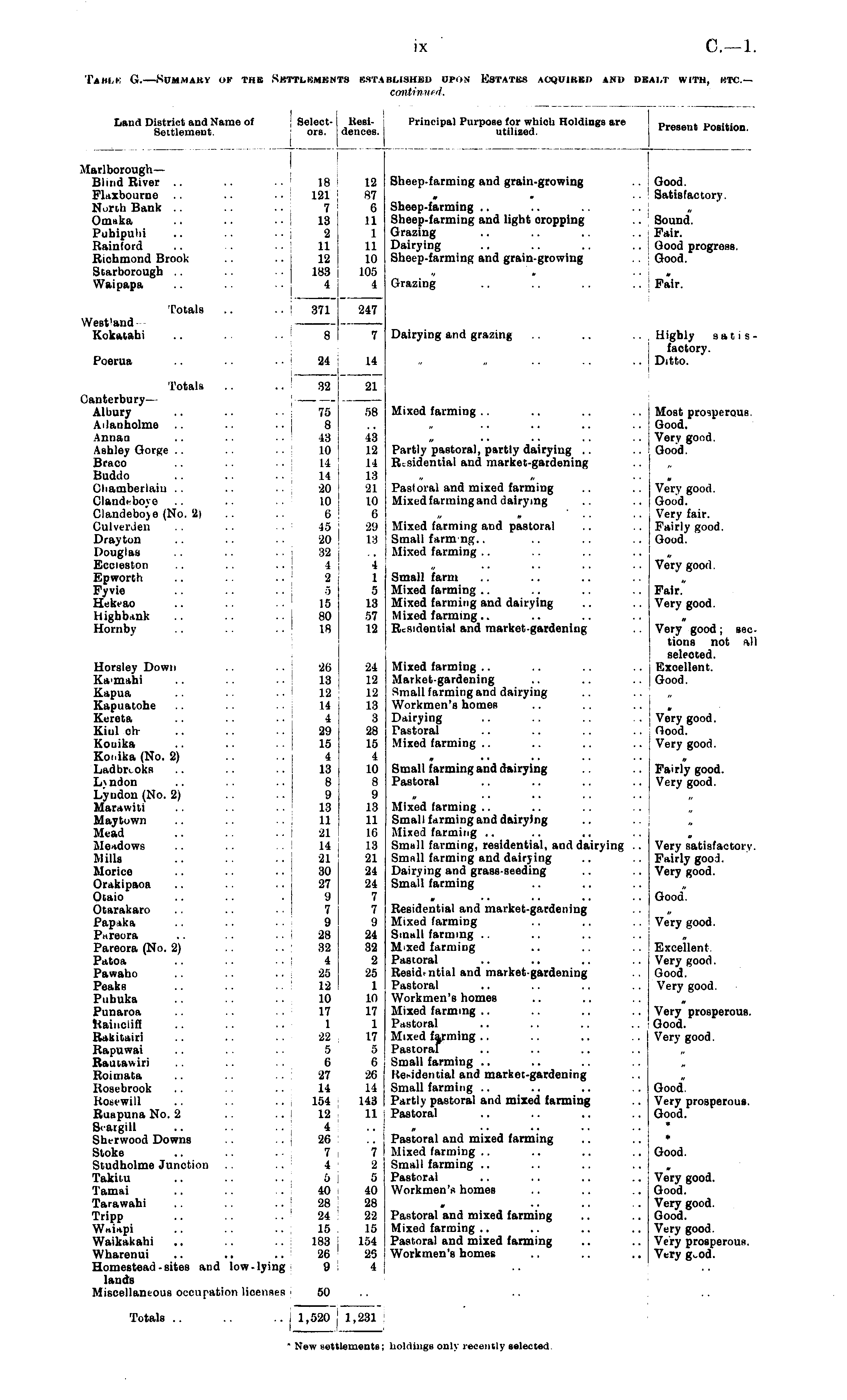 I I Laud District and Name of Select- Kesi- Pri Settlement orB. dences. Marl borough— Blind River .. .. 18 12 Sheep Flaxbourne .. 121 87 North Bank .. .. 7 6 Sheep Onmka .. .. •• 13 11 Sheep Pubipuhi .. . ■ 2 1 Grazii Rainford .. .. 11 11 Dairy: Richmond Brook .. 12 10 Sheep Starborough .. 183 105 Waipapa 4 4 Grazii Totals .. 371 247 Principal which Holdings are j pre8ent Position '! Sheep-farming and grain-growing .. : Good. » . . . Satisfactory. Sheep-farming .. .. .. .. j Sheep-farming and light oropping .. Sound. Grazing .. .. .. .. Fair. Dairying .. .. .. Good progress. Sheep-farming and grain-growing . . Good. Grazing .. .. ., Fair. vVest'and Kokatahi 8 7 Dairy Dairying and grazing .. .. ..Highly satisfactory. .. Ditto. | Poerua .. ■• 24 14 Totals .. 32 21 Canterbury— Albury .. .. 75 58 Mixed Ailanholme .. ■■ 8 Annan .. 43 43 Ashley Gorge .. 10 12 Partly Braco .. 14 14 R.sidi Buddo .. .. .. 14 13 Chamberlain .. .. .. 20 21 Pasfo: Clandr-boye .. .. 10 10 Mixed Clandebo'ye (No. 2) .. 6 6 CulverJen .. 45 29 Mixed Drayton .. .. 20 13 Small Douglas .. .. .. 32 .. Mixed Eccieston .. .. .. 4 4 Epworth .. .. .. 2 1 Small Fyvie .. .. 5 5 Mixed Hekeao .. 15 13 Mixed Highbrink .. .. .. 80 57 Mixed Hornby .. .. 18 12 R^sidi Mixed farming .. .. .. .. Most prosperous. .. Good. .. Very good. Partly pastoral, partly dairying .. .. i Good. Residential and market-gardening Pasloral and mixed farming .. .. Very good. Mixed farming and dairying .. .. Good. „ ■ .. Very fair. Mixed farming and pastoral .. Fairly good. Small farm ng.. .. .. Good. Mixed farming .. .. .. .. , .. Very good Small farm Mixed farming .. .. .. .. Fair. Mixed farming and dairying .. .. Very good. Mixed farming.. .. .. .. „ Residential and market-gardening .. Very good ; sections not all selected. Mixed farming .. .. .. j Excellent. Market-gardening .. .. .. Good. Small farming and dairying Workmen's homes .. .. .. , Dairying .. .. .. .. Very good. Tastoral .. .. .. .. flood. Mixed farming .. .. .. .. Very good. Horsley Down .. 26 24 Mixed Kaimahi .. 13 12 Marki Kapua .. .. 12 12 Small Kapuatohe .. 14 13 Work! Kereta .. 4 3 Dairy Kiul ch .. .. 29 28 Tasto: Kouika .. 15 15 Mixed Konika (No. 2) .. 4 4 Ladwxoks .. .. 13 10 Small Lindon .. .. 8 8 Pasto Lyndon (No. 2) .. .. 9 9 Marawiti .. .. 13 13 Mixed Maytown .. .. 11 11 Small Mead .. .. .. 21 16 Mixed Meadows .. 14 13 Small Mills .. .. 21 21 Small Morice .. .. 30 24 Dairy Orakipaoa .. .. .. 27 24 Small Otaio .. . 9 7 Otarakaro .. .. 7 7 Residi Papaka .. .. . . 9 9 Mixed Pureora .. .. .. 28 24 Small Pareora (No. 2) .. 32 32 Mxed Patoa .. .. .. 4 2 Pastoi Pawaho .. .. .. 25 25 Resid. Peaks .. 12 1 Pasto: Puhuka .. 10 10 Worki Punaroa .. .. 17 17 Mixed Raincliff .. .. .. 1 1 Pastoi Rakitairi .. 22 17 Mixed Rapuwai .. 5 5 Pastoi Rautawiri .. .. 6 6 Small Roimata .. 27 26 Reridi Rosebrook .. 14 14 Small Rosewill .. 154 143 Partly Ruapuna No. 2 .. .. 12 11 Pastoi S.-argill .. .. .. 4 Sherwood Downs .. 26 .. Pastoi Stoke .. . • 7 7 Mixed Studholme Junction 4 2 Small Takitu .. .. .. 6 5 Pastni Tamai .. .. 40 40 Worki Tarawahi .. 28 28 Tripp .. .. 24 22 Pastoi Waiapi 15 15 Mixed Waikakahi .. 183 154 Pastoi Wharenui .. .. .. 26 26 Worki Homestead - sites and low-lying 9 4 lands Miscellaneous occupation licenses 50 Small farming and dairying .. .. Fairly good. Pastoral .. .. .. .. Very good. Mixed farming .. .. .. .. j Small farming and dairying .. Mixed farming .. Small farming, residential, and dairying .. Very satisfactory. Small farming and dairying .. .. Fairly good. Dairying and grass-seeding .. .. Very good. Small farming .. Good. Residential and market-gardening .. „ Mixed farming .. .. .. Very good. Small farming Mxed farming .. .. .. Excellent Pastoral .. .. .. .. Very good. Residrntial and market-gardening Good. Pastoral .. .. .. .. Very good. Workmen's homes .. .. .. „ Mixed farming .. .. .. .. Very prosperous. Pastoral .. .. .. .. ; Good. Mixed farming .. .. .. .. I Very good. Pastoral .. .. .. Small farming .. Residential and market-gardening Small farming .. .. .. .. Good. Partly pastoral and mixed farming .. Very prosperous. Pastoral .. .. .. .. Good. Pastoral and mixed farming .. .. * Mixed farming .. .. .. .. Good. Small farming Pastoral .. .. .. .. Very good. Workmen's homes .. .. .. Good. » .. .. .. Very good. Pastoral and mixed farming .. .. Good. Mixed farming .. .. .. .. Very good. Pastoral and mixed farming .. .. Very prosperous. Workmen's homes .. .. .. Very g„od. Totals .. .. 1,520 j 1,231 * New settlements; holdini holdings only recently selected