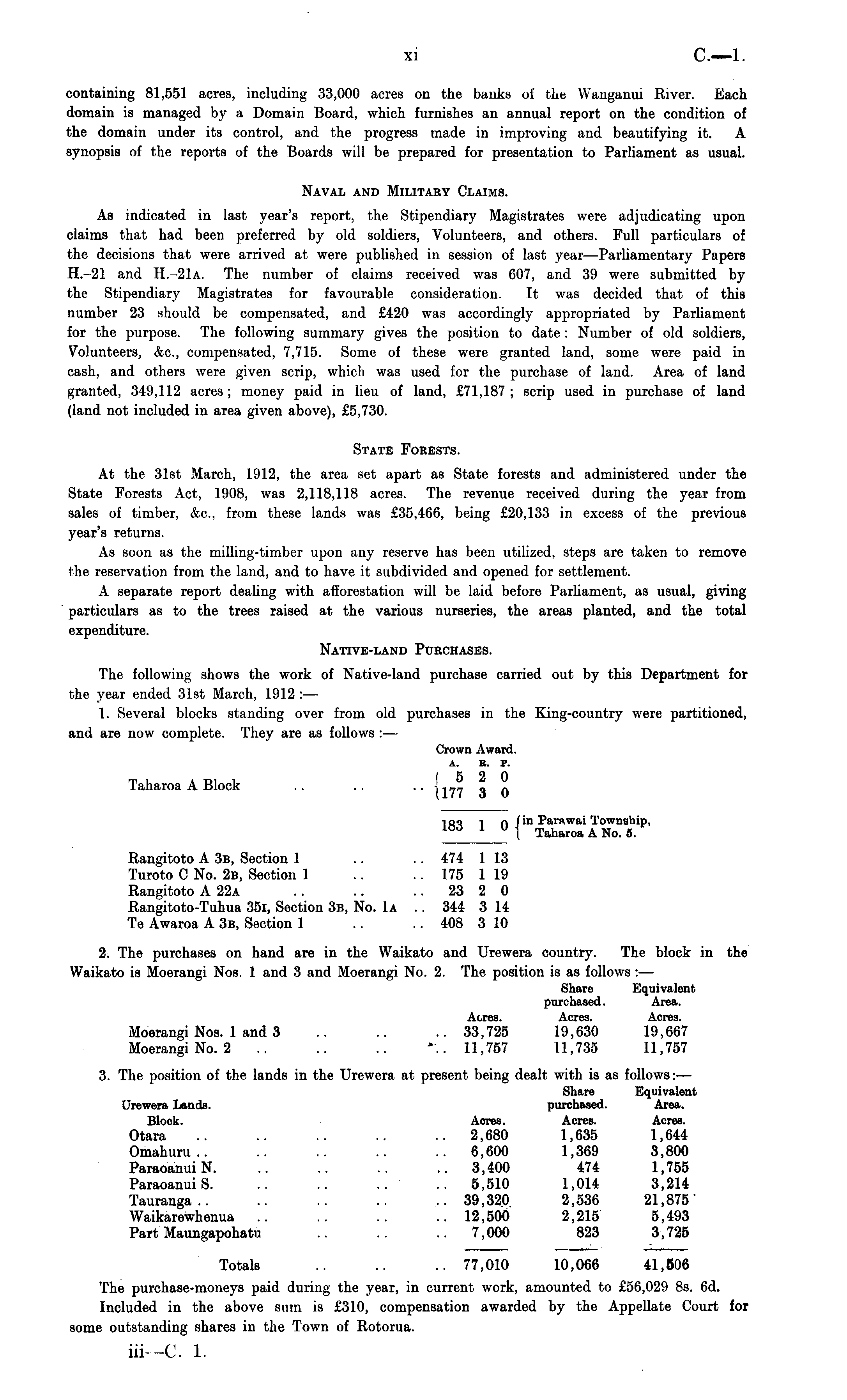 containing 81,551 acres, including 33,000 acres on the banks of the Wanganui Eiver. Each domain is managed by a Domain Board, which furnishes an annual report on the condition of the domain under its control, and the progress made in improving and beautifying it. A synopsis of the reports of the Boards will be prepared for presentation to Parliament as usual. Naval and Military Claims. As indicated in last year's report, the Stipendiary Magistrates were adjudicating upon claims that had been preferred by old soldiers, Volunteers, and others. Full particulars of the decisions that were arrived at were published in session of last year—Parliamentary Papers H.-21 and H.-21a. The number of claims received was 607, and 39 were submitted by the Stipendiary Magistrates for favourable consideration. It was decided that of this number 23 should be compensated, and £420 was accordingly appropriated by Parliament for the purpose. The following summary gives the position to date : Number of old soldiers, Volunteers, &c, compensated, 7,715. Some of these were granted land, some were paid in cash, and others were given scrip, which was used for the purchase of land. Area of land granted, 349,112 acres; money paid in lieu of land, £71,187; scrip used in purchase of land (land not included in area given above), £5,730. State Forests. At the 31st March, 1912, the area set apart as State forests and administered under the State Forests Act, 1908, was 2,118,118 acres. The revenue received during the year from sales of timber, &c, from these lands was £35,466, being £20,133 in excess of the previous year's returns. As soon as the milling-timber upon any reserve has been utilized, steps are taken to remove the reservation from the land, and to have it subdivided and opened for settlement. A separate report dealing with afforestation will be laid before Parliament, as usual, giving particulars as to the trees raised at the various nurseries, the areas planted, and the total expenditure. Native-land Purchases. The following shows the work of Native-land purchase carried out by this Department for the year ended 31st March, 1912 : — 1. Several blocks standing over from old purchases in the King-country were partitioned, and are now complete. They are as follows : — Crown Award. a. r. p. Taharoa A Block 1177 3 0 iQQ i n fin Parawai Townsbip, ia<j l ° I Taharoa A No. 5. Eangitoto A 3b, Section 1 .. .. 474 113 Turoto C No. 2b, Section 1 .. .. 175 119 Rangitoto A 22a .. .. 23 2 0 Rangitoto-Tuhua 35i, Section 3b, No. Iα .. 344 314 Te Awaroa A 3b, Section 1 .. .. 408 3 10 2. The purchases on hand are in the Waikato and Urewera country. The block in the Waikato is Moerangi Nos. 1 and 3 and Moerangi No. 2. The position is as follows : — Share Equivalent purchased. Area. Acres. Acres. Acres. Moerangi Nos. 1 and 3 33,725 19,630 19,667 Moerangi No. 2 .. .. .. *.. 11,757 11,735 11,757 3. The position of the lands in the Urewera at present being dealt with is as follows: — Share Equivalent Urewera Lands. purchased. Area. Block. ■ Aores. Acres. Acres. Otara .. .. .. .. .. 2,680 1,635 1,644 Omahuru.. .. .. .. .. 6,600 1,369 3,800 ParaoanuiN. .. .. .. ..3,400 474 1,755 ParaoanuiS. .. .. .. .. 5,510 1,014 3,214 Tauranga.. .. .. .. .. 39,320 2,536 21,875' Waikarewhenua .. .. .. .. 12,500 2,215 5,493 Part Maungapohatu .. .. ..7,000 823 3,725 Totals .. .. .. 77,010 10,066 41,506 The purchase-moneys paid during the year, in current work, amounted to £56,029 Bs. 6d. Included in the above sum is £310, compensation awarded by the Appellate Court for some outstanding shares in the Town of Rotorua.