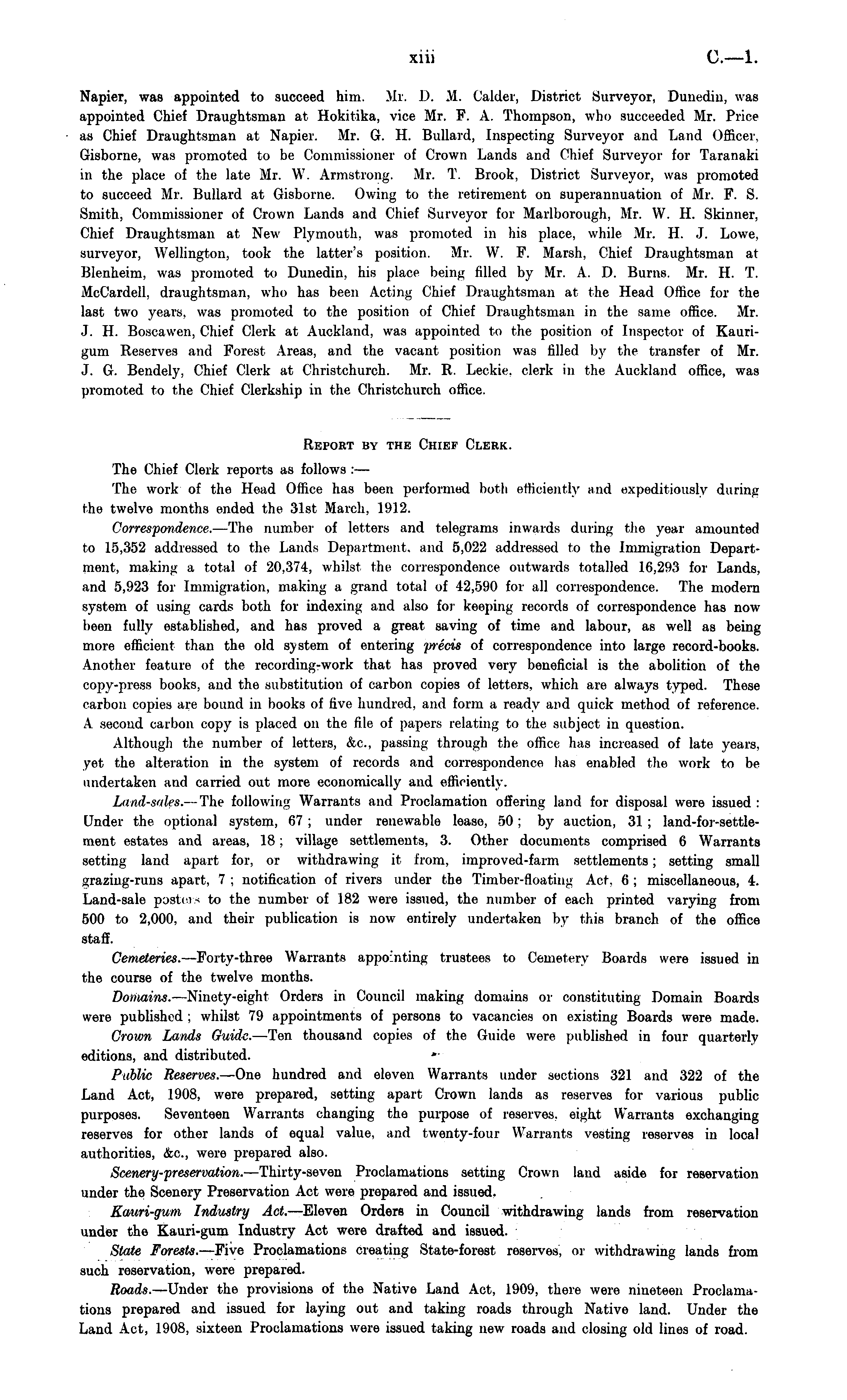 Report by the Chief Clerk. The Chief Clerk reports as follows : — The work of the Head Office has been performed both efficiently and expeditiously during the twelve months ended the 31st March, 1912. Correspondence.- —The number of letters and telegrams inwards during the year amounted to 15,352 addressed to the Lands Department, and 5,022 addressed ro the Immigration Department, making a total of 20,374, whilst the correspondence outwards totalled 16,293 for Lands, and 5,923 for Immigration, making a grand total of 42,590 for all correspondence. The modern system of using cards both for indexing and also for keeping records of correspondence has now been fully established, and has proved a great saving of time and labour, as well as being more efficient than the old system of entering precis of correspondence into large record-books. Another feature of the recording-work that has proved very beneficial is the abolition of the copy-press books, and the substitution of carbon copies of letters, which are always typed. These carbon copies are bound in books of five hundred, and form a ready and quick method of reference. A second carbon copy is placed on the file of papers relating to the subject in question. Although the number of letters, &c, passing through the office has increased of late years, yet the alteration in the system of records and correspondence lias enabled the work to be undertaken and carried out more economically and efficiently. Land-sales. — The following Warrants and Proclamation offering land for disposal were issued : Under the optional system, 67 ; under renewable lease, 50; by auction, 31 ; land-for-settle-ment estates and areas, 18; village settlements, 3. Other documents comprised 6 Warrants setting land apart for, or withdrawing it from, improved-farm settlements; setting small graziug-runs apart, 7 ; notification of rivers under the Timber-floating Act. 6 ; miscellaneous, 4. Land-sale posters to the number of 182 were issued, the number of each printed varying from 500 to 2,000, and their publication is now entirely undertaken by this branch of the office staff. Cemeteries. —Forty-three Warrants appointing trustees to Cemetery Boards were issued in the course of the twelve months. Domains. —Ninety-eight Orders in Council making domains or constituting Domain Boards were published ; whilst 79 appointments of persons to vacancies on existing Boards were made. Crown Lands Guide. —Ten thousand copies of the Guide were published in four quarterly editions, and distributed. Public Reserves. —One hundred and eleven Warrants under sections 321 and 322 of the Land Act, 1908, were prepared, setting apart Crown lands as reserves for various public purposes. Seventeen Warrants changing the purpose of reserves, eight Warrants exchanging reserves for other lands of equal value, and twenty-four Warrants vesting reserves in local authorities, &c, were prepared also. Scenery-preservation. —Thirty-seven Proclamations setting Crown land aside for reservation under the Scenery Preservation Act were prepared and issued. Kauri-gum Industry Act. —Eleven Orders in Council withdrawing lands from reservation under the Kauri-gum Industry Act were drafted and issued. State Forests. —Five Proclamations creating State-forest reserves, or withdrawing lands from such reservation, were prepared. Roads. —Under the provisions of the Native Land Act, 1909, there were nineteen Proclamations prepared and issued for laying out and taking roads through Native land. Under the Land Act, 1908, sixteen Proclamations were issued taking new roads and closing old lines of road.
