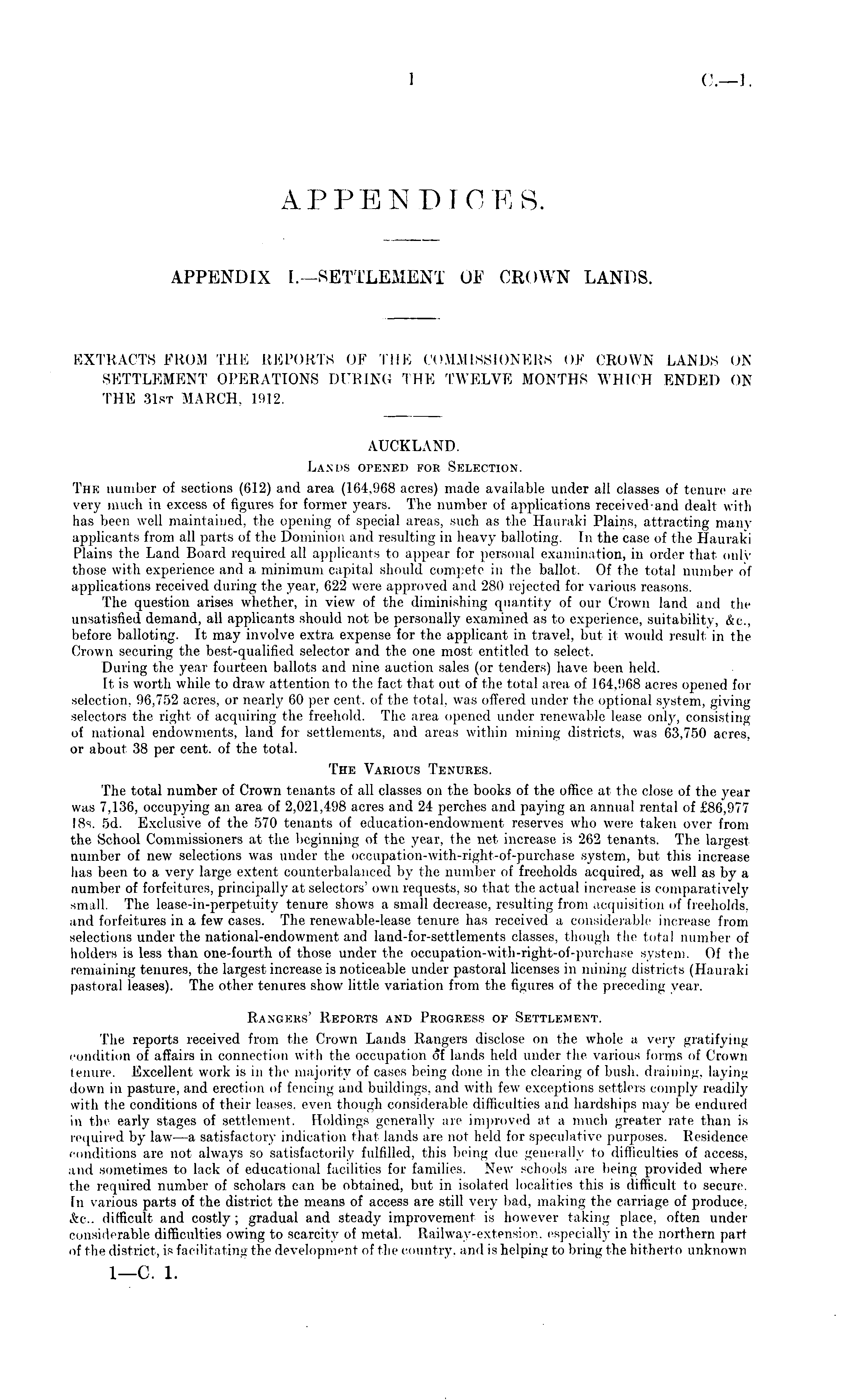 APPENDICES. APPENDIX I.—SETTLExAIENT OF CROWN LANDS.