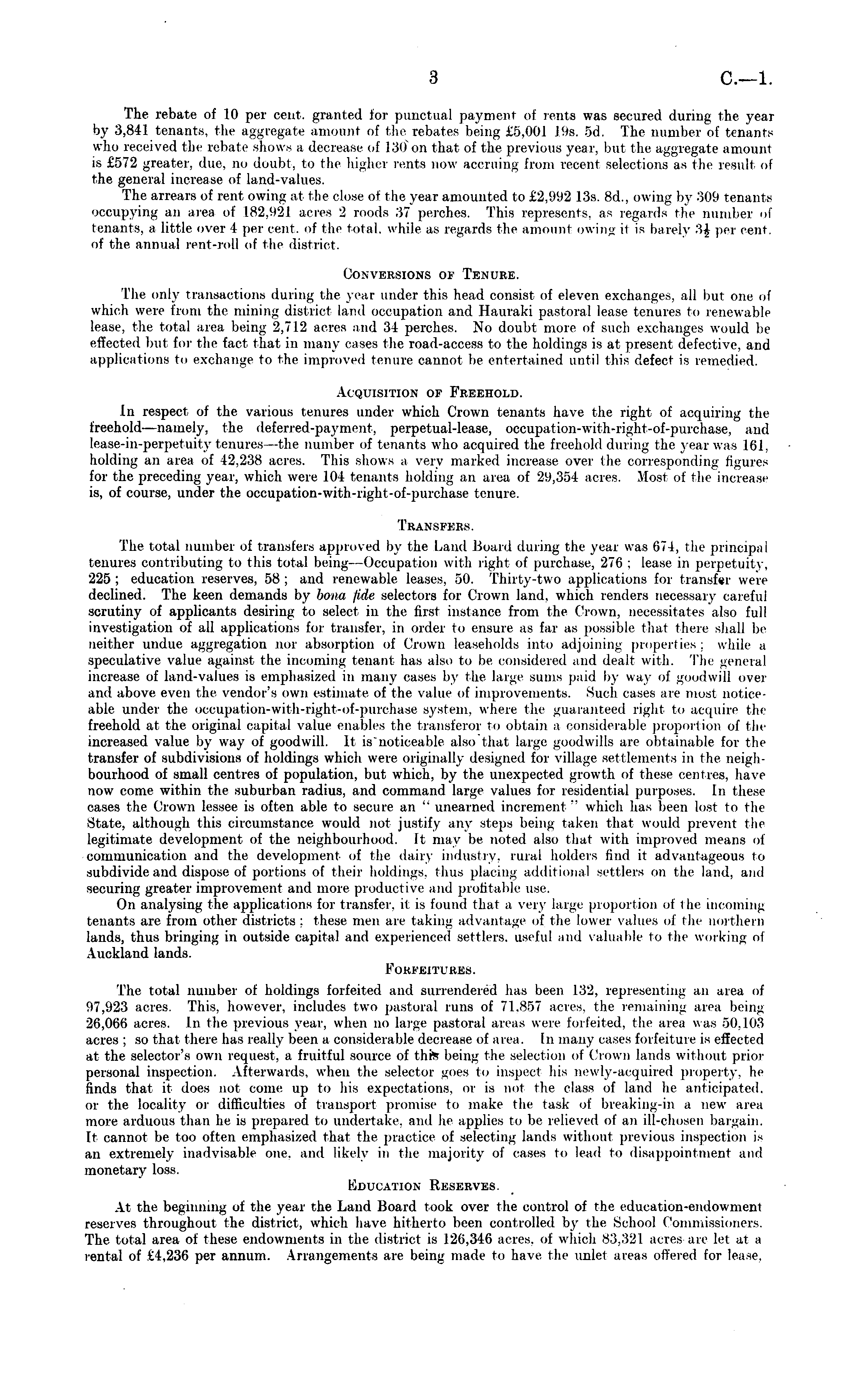 The rebate of 10 per cent, granted for punctual payment of rents was secured during the year by 3,841 tenants, the aggregate amount of the rebates being £5,001 19s. sd. The number of tenants who received the rebate shows a decrease of L3CTon that of the previous year, but the aggregate amouni is £572 greater, due, no doubt, to the higher rents now accruing from recent selections as the result oi the general increase of land-values. The arrears of rent owing at the close of the year amounted to £2,992 13s. Bd., owing by 309 tenants occupying an area of 182,92] acres 2 roods 37 perches. This represents, as regards the number of tenants, ;i little over I per cent, of the total, while as regards the amount owing it is barely per cent. of the annual rent-roll of the district. Conversions of Tenure. The only transactions during the year under this head consist of eleven exchanges, all but one of which were from the mining district land occupation and Hauraki pastoral lease tenures to renewable lease, the total area being 2,712 acres and 34- perches. No doubt more of such exchanges would be effected but for the fact that in many cases the road-access to the holdings is at present defective, and applications to exchange to the improved tenure cannot be entertained until this defect is remedied. Acquisition of Freehold. In respect of the various tenures under which Crown tenants have the right of acquiring the freehold—namely, the deferred-payment, perpetual-lease, occupation-with-right-of-purchase, and lease-in-perpetuity tenures —the number of tenants who acquired the freehold during the year was 161, holding an area of 42,238 acres. This shows a very marked increase over the corresponding figures for the preceding year, which were 104 tenants holding an area of 29,354 acres. Most of the increase is, of course, under the occupation-with-right-of-purchase tenure. Transfers. The total number of transfers approved by the Land Board during i be veur was (iT i, I be principal tenures contributing to this total being—Occupation with right of purchase, 276 : lease in perpetuity, 225; education reserves, 58; and renewable leases. 50. Thirty-two applications for transfer were declined. The keen demands by bona fide selectors for Crown land, which renders necessary careful scrutiny of applicants desiring to select in the first instance from the Crown, necessitates also full investigation of all applications tor transfer, in order u> ensure as far as possible that there shall be neither undue aggregation nor absorption of frown leaseholds into adjoining properties; while a speculative value against the incoming tenant has also to lie considered and dealt with. The general increase of land-values is emphasized in many cases by the large sums paid l>v way of goodwill over and above even the vendor's own estimate of the value of improvements. Such cases are most noticeable under the occupation-with-right-of-purchase system, where the guaranteed right to acquire the freehold at the original capital value enables the transferor to obtain a considerable proportion of the increased value by way of goodwill. It is'noticeable also that large goodwills are obtainable for the transfer of subdivisions of holdings which were originally designed for village settlements in the neighbourhood of small centres of population, but which, by the unexpected growth of these centres, have now come within the suburban radius, and command large values for residential purposes. In bhese cases the Crown lessee is often able to secure an " unearned increment " which has been lost to the State, although this circumstance would not justify any steps being taken that would prevent the legitimate development of the neighbourhood. It may be noted also that with improved means of communication and the development of the dairy industry, rural holders find it advantageous to subdivide and dispose of portions of their holdings, thus placing additional settlers on the land, and securing greater improvement and more productive and profitable use. On analysing the applications for transfer, it is found that a very large proportion of I he incoming tenants are from other districts; these men are taking advantage of the lower values of the northern lands, thus bringing in outside capital and experienced settlers, useful and valuable to the working of Auckland lands. Forfeitures. The total number of holdings forfeited and surrendered has been 132, representing an area of 97,923 acres. This, however, includes two pastoral runs of 71.857 acres, the remaining area being 26,066 acres. In the previous year, when no large pastoral areas were forfeited, the area was 50,103 acres ; so that there has really been a considerable decrease of area. In many cases forfeiture is effected at the selector's own request, a fruitful source of this being the selection of Crown lands without prior personal inspection. Afterwards, when the selector goes to inspect his newly-acquired property, he finds that it does not come up to his expectations, or is not the class of land he anticipated. or the Locality or difficulties of transport promise to make the task of breaking-in a new area more arduous than he is prepared to undertake, and he applies to be relieved of an ill-chosen bargain. It cannot be too often emphasized that the practice of selecting lands without previous inspection is an extremely inadvisable one. and likely in the majority of cases to lead to disappointment and monetary loss. Kducation Reserves. At the beginning of the year the Land Hoard took over the control of the education-endowment reserves throughout the district. which have hitherto been controlled by the School Commissioners. The total area of these endowments in the district is 126,34(5 acres, of which 83,321 acres are let at a rental of £4,236 per annum. Arrangements are being made to have the unlet areas offered for lease.