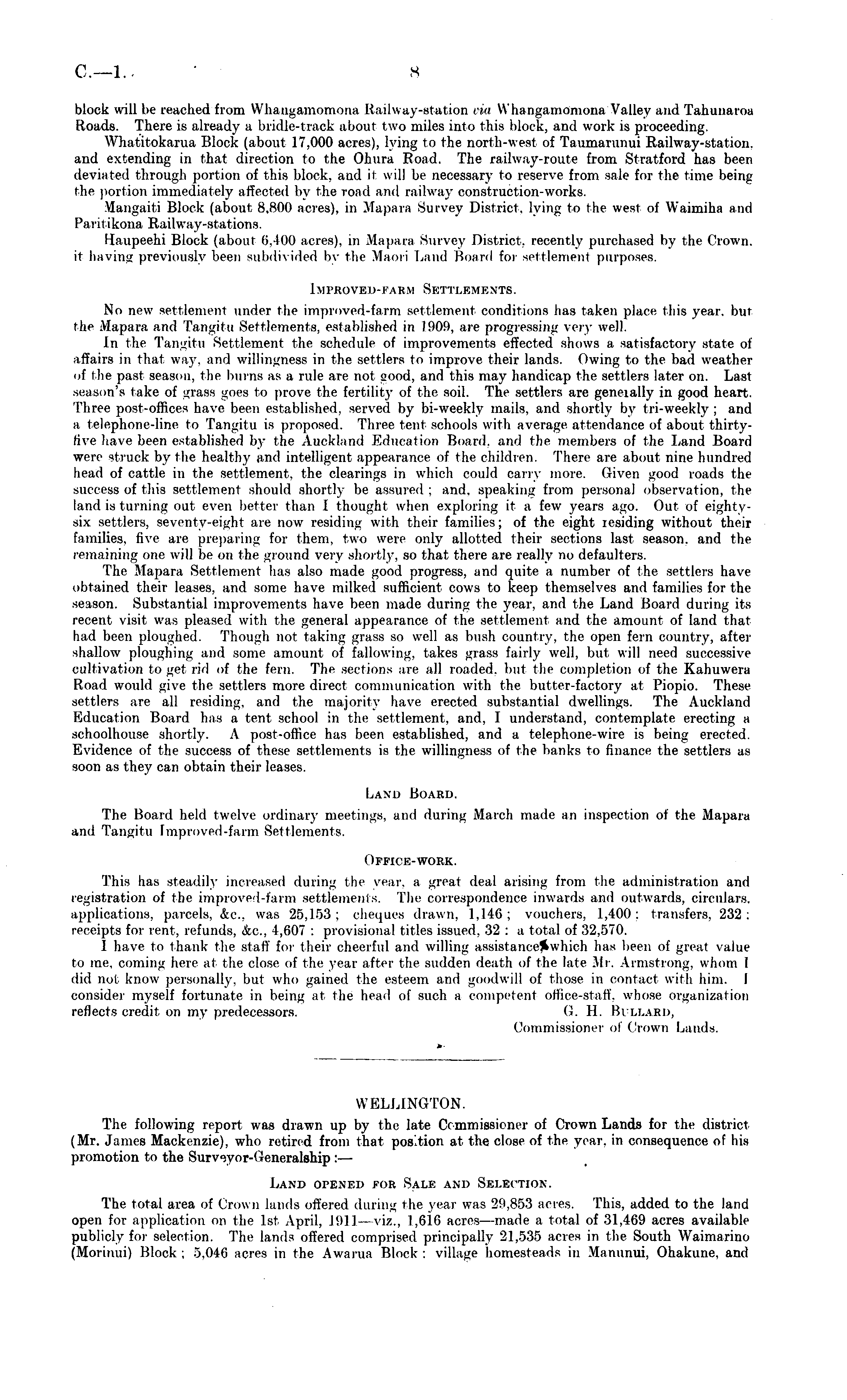 WELLINGTON. The following report was drawn up by the late Commissioner of Crown Lands for the district (Mr. James Mackenzie), who retired from that position at the close of the year, in consequence of his promotion to the Surveyor-Generalship :— Land opened fob Sale and Selection. The total area of Crown lands offered during the yeai was 29,863 acres. This, added to the land open for application on the Ist April, 19] 1 \i/.. 1,616 acres —made a total of 31,469 acres available publicly for selection. The lands offered comprised principally 21,535 acres in the South Waimarino (Morinui) Block; 5.046 acres in the Awarua Block: village homesteads in Manunui, Ohakune, and
