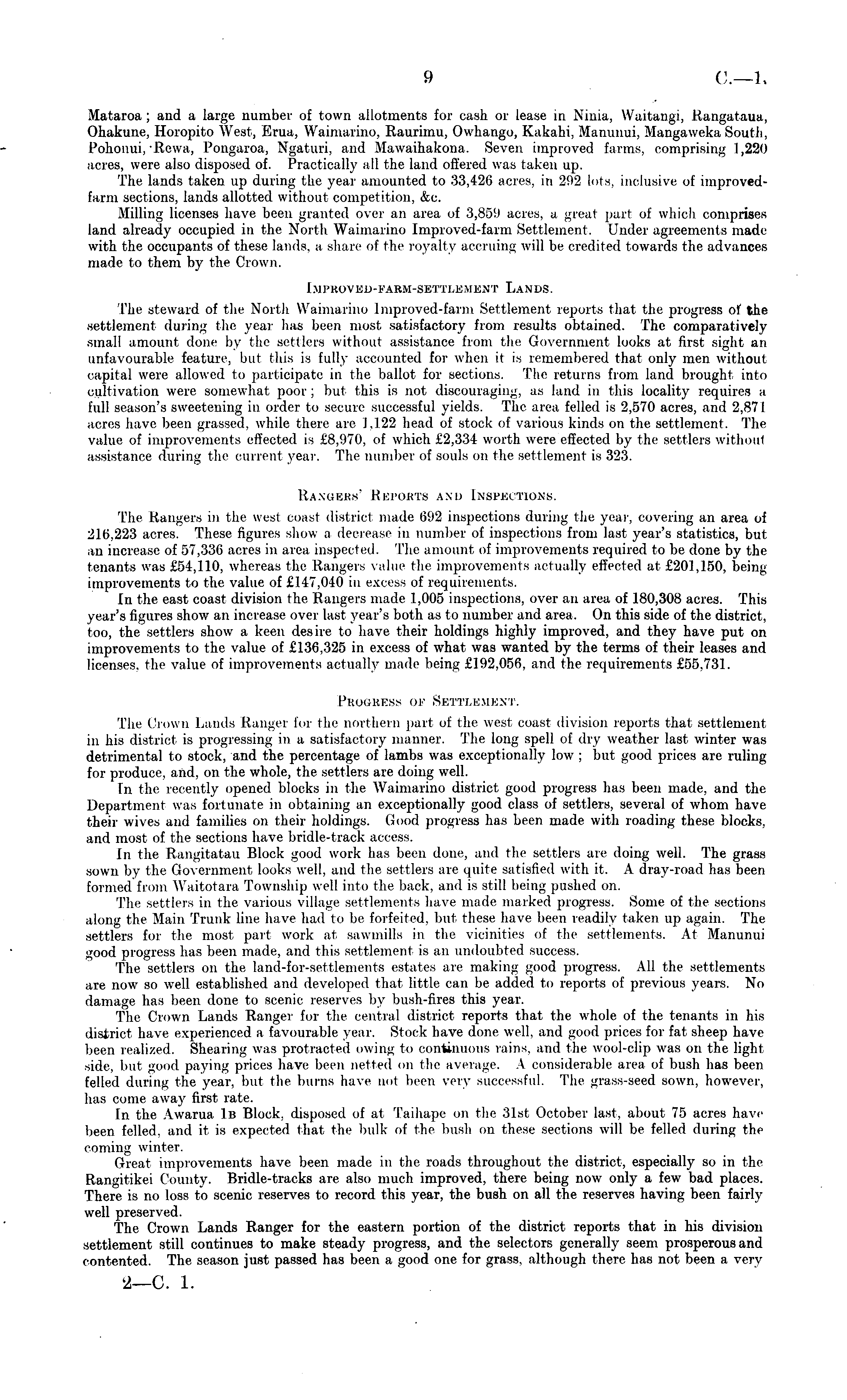 Mataroa; and a large number of town allotments for cash or lease in Ninia, Waitangi, Rangataua, Ohakune. Eoropito West, Erua, Waimarino, Raurimu, Owliango, Kakahi, Manunui, Mangaweka South, Pohonui, -Rewa, Pongaroa, Ngaturi, and Mawaihakona. Seven improved farms, comprising 1,220 i, were also disposed of. Practically all the land offered was taken up. The lands taken up during the year amounted to 33,420 acres, in lots, inclusive of improvedfarm sections, lands allotted without competition, &c. {Hilling licenses have been granted over an area of 3,8 of which comprises land already occupied in the North Waimarino Improved-farm Settlement. Under agreement s made with the occupants of these lands, a share of the rcrj ruing will be credited towards the advances lo them by the Crown. Improved-farm-settlement Lands. The steward of the North Waimarino [mproved-farm Settlement reports that the progress of the blement during the pear has been most satisfactory from results obtained. The comparatively small amount done Iγ. tiers without assistance from the Government looks at first sight an unfavourable feature, but this is fully accounted for when it i bered that only men without capita] were allowed to participate in the ballot for sections. The returns from land brought into cultivation were somewhat poor; but this is not discouraging, as land in this locality requin full season's sweetening in order to secure successful yields. The area Idled is 2,570 acres, and 2,871 acres have been grassed, while there are 1,122 bead of stock of various kinds on the settlement. The value of improvements effected is £8,970, of which £2,334 worth were effected by the settlers withoul assistance during the curreni year. The number of souls on the settlement is 323. Rangers' Reports and Inspections. The Rangers in the west coast district made 692 in is during the year, covering an area of 216,223 acres. These figures show a decrease in number of inspections Ero statistics, but an increase of 57,336 acres in area inspected. The amount of improi ements required to be done by the tenants was£s4,llo, whereas the Rangers value the improvements actually effected at £201,150, being improvements to the value of £] IT.(Ill) in excess of requirements. In the east coast division the I. de 1.005 inspections, over an area of 180,308 acres. This year's figures show an increase over la both as to number i On this side of the district, too, the settlers show a keen desire to have their holdings highly improved, and they have put on improvements to the value of £136,325 in excess of what was wanted by the terms of their leases and licenses, the value of improvements actually made being £192,056, and the requirements £55.731. Progress of Settlement. The Crown Lands Ranger for the northern part of the west coast- division reports that settlement in his district is progressing in a satisfactory manner. The long spell of dry weather last winter was detrimental to stock, and the percentage of lambs was exceptionally low : but good prices are ruling for produce, and. on the whole, tie are doing well. In the recently opened Mocks in the Waimarino district good progn ieen made, and the Department was fortunate in obtaining an exceptionally good class of settlers, several of whom have their wives and families on (heir holdings. Good progress has been made with reading these blocks. and most of the sections have bridle-track access. In the Etangitatau Block good work has been done, and the set this are doing well. The grass sown by the Government looks well, and the settlers are quite satisfied with it. A dray-road has been Formed from Waitotara Township well into the back, and is still being pushed on. The settlers in the various village settlements have made marked progress. Some of the sections along the Main Trunk line have had to be forfeited, but these have been readily taken up again. The settlers for the most part work at sawmills in the vicinities of the settlements. At Manunui good progress lias been made, and i his settlement is an undoubted success. The settlers on the land-for-settlements estates are making good progress. All the settlements are now so well established and developed that little can be added to reports of previous years. No tge has been done to scenic reserves by bush-fires this year. The Crown Lands Ranger for the central district reports thai the whole of the tenants in his district have experienced a favourable year. Stuck have done well, and good prices for fat sheep have realized. Shearing was protracted owing to continuous rains, and the wool-clip was on the light side, but good paying prices have been netted on the average. A considerable area oi liush has been felled during the year, but the burns have not 1 n very successful. The grass-seed sown, however, has come away first rate. In the Awarua Iβ Block, disposed of at Taihape on the 31s1 October last, about 75 acres have been felled, and it is expected that the hulk of the bush on these seel ions will lie felled during the coming winter. Great improvements have been made in the roads throughout the district, especially so in the Rangitikei County. Bridle-tracks are also much improved, there being now only a few bad places. There is no loss to scenic reserves to record this year, the bush on all the reserves having been fairly well preserved. The Crown Lands Ranger for the eastern portion of the district reports that in his division settlement still continues to make steady progress, and the selectors generally seem prosperous and contented. The season just passed has been a good one for grass, although there has not been a very