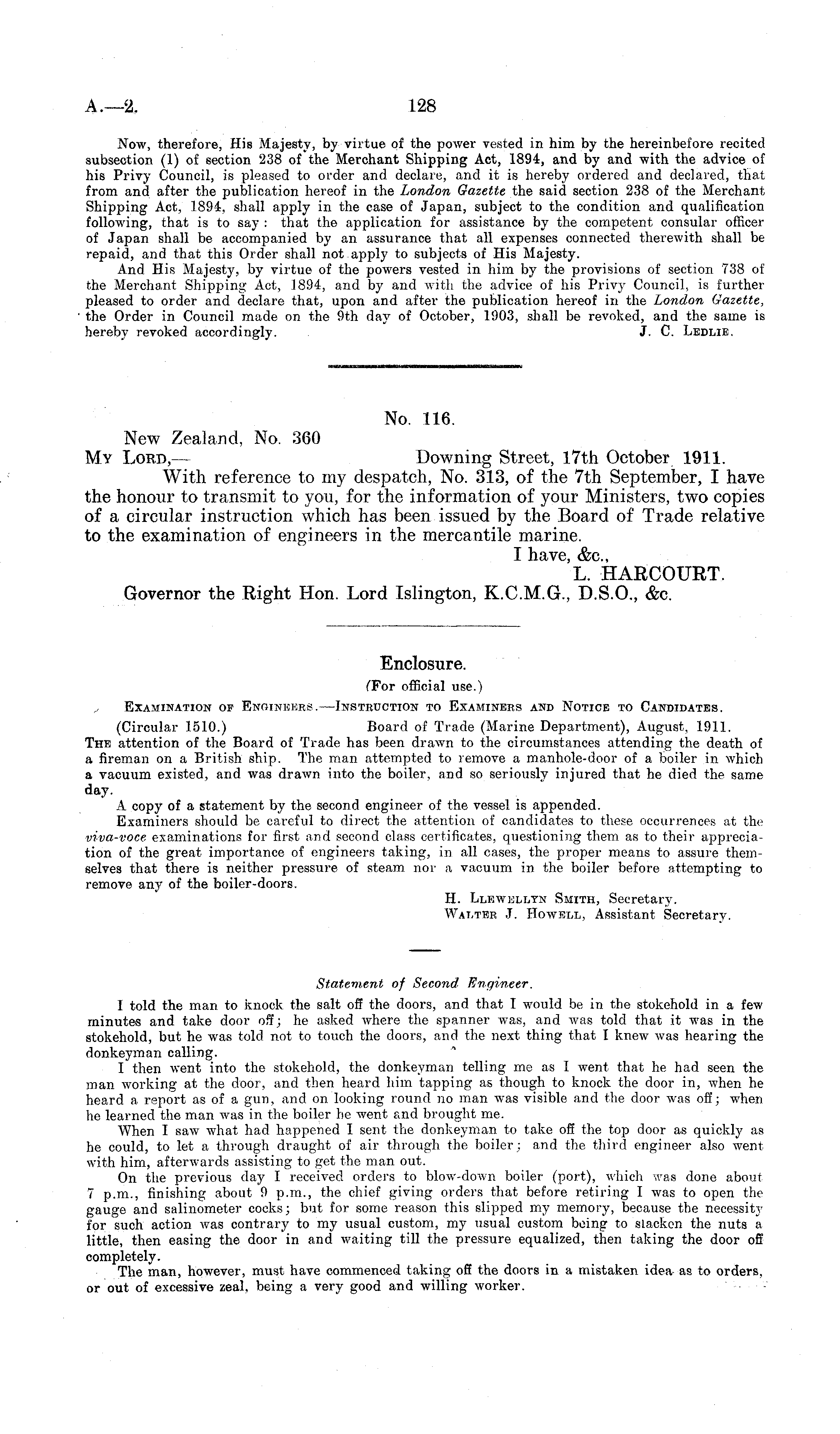 No. 116. New Zealand, No. 360 My Lord, — Downing Street, 17th October 1911. With reference to my despatch, No. 313, of the 7th September, I have the honour to transmit to you, for the information of your Ministers, two copies of a circular instruction which has been issued by the Board of Trade relative to the examination of engineers in the mercantile marine. I have, &c, L. HARCOURT. Governor the Right Hon. Lord Islington, K.C.M.G., D.5.0., &c. Enclosure. (Tor official use.) Examination op Engineers.—lnstruction to Examiners and Notice to Candidates. (Circular 1510.) Board of Trade (Marine Department), August, 1911. The attention of the Board of Trade has been drawn to the circumstances attending the death of a fireman on a British ship. The man attempted to remove a manhole-door of a boiler in which a vacuum existed, and was drawn into the boiler, and so seriously injured that he died the same day. A copy of a statement by the second engineer of the vessel is appended. Examiners should be careful to direct the attention of candidates to these occurrences at the viva-voce examinations for first and second class certificates, questioning them as to their appreciation of the great importance of engineers taking, in all cases, the proper means to assure themselves that there is neither pressure of steam nor a vacuum in the boiler before attempting to remove any of the boiler-doors. H. Llewellyn Smith, Secretary. Walter J. Howell, Assistant Secretary. Statement of Second Engineer. I told the man to knock the salt off the doors, and that I would be in the stokehold in a few minutes and take door off; he asked where the spanner was, and was told that it was in the stokehold, but he was told not to touch the doors, and the next thing that I knew was hearing the donkeyman calling. I then went into the stokehold, the donkeyman telling me as I went that he had seen the man working at the door, and then heard him tapping as though to knock the door in, when he heard a report as of a gun, and on looking round no man was visible and the door was off; when he learned the man was in the boiler he went and brought me. When I saw what had happened I sent the donkeyman to take off the top door as quickly as he could, to let a through draught of air through the boiler; and the third engineer also went with him, afterwards assisting to get the man out. On the previous day I received orders to blow-down boiler (port), winch was done about 7 p.m., finishing about 9 p.m., the chief giving orders that before retiring I was to open the gauge and salinometer cocks; but for some reason this slipped my memory, because the necessity for such action was contrary to my usual custom, my usual custom being to slacken the nuts a little, then easing the door in and waiting till the pressure equalized, then taking the door off completely. The man, however, must have commenced taking off the doors in a mistaken idea as to orders, or out of excessive zeal, being a very good and willing worker.