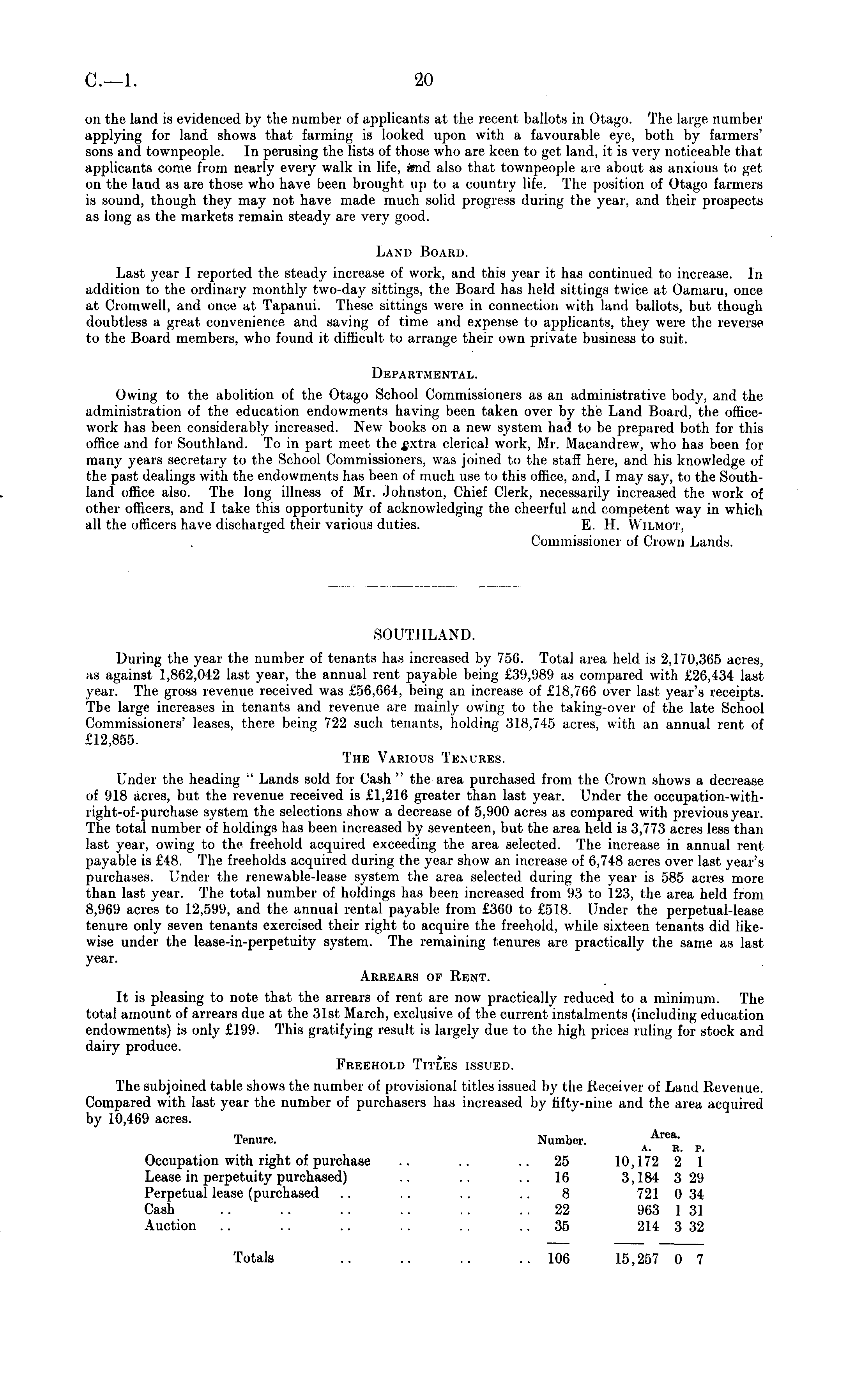 (iii tlic land is evidenced by the number of applicants at the recent ballots in Otago. The Large number applying for land shows that farming is looked upon with a favourable eye, both by fanners' sons and tnu npeople. In perusing the lists of those who arc keen to get land, it is very noticeable that applicants conic from nearly every walk in life, and also that townpeople are about as anxious to get on the land as are those who have been brought up to a country life. The position of Otago farmers is sound, though they may not have made much solid progress (lining the year, and their prospects as long as the markets remain steady are very good. Land Board. Last year I reported the steady increase of work, and this year it has continued to increase. In addition to the ordinary monthly two-day sittings, the Board has held sittings twice at Oaniaru, once at Cromwell, and once al Tapanui. These sittings were in connection with land ballots, but though doubtless a great convenience and saving of time and expense to applicants, they were the reverse to the Board members, who found it difficult to arrange their own private business to suit. Departmental. Owing to the abolition of the Otago School Commissioners as an administrative body, and the administration of the education endowments having been taken over by the Land Board, the otricework has been considerably increased. New books on a new system had to be prepared both for this office and for Southland. To in part meet the fxtra clerical work, Mr. Macandrew, who lias been for many years secretary to the School Commissioners, was joined to the staff here, and his knowledge of the past dealings with the endowments has been of much use to this office, and, I may say, to the Southland office also. The long illness of Mr. Johnston, Chief Clerk, necessarily increased the work of other officers, and I take this opportunity of acknowledging the cheerful and competent way in which all the officers have discharged their various duties. E. 11. Wilmot, Commissioner of Crown Lands. SOUTHLAND. During the year the number of tenants has increased by 756. Total area held is 2,170,365 acres, as against 1,862,042 last year, the annual rent payable being £39,989 as compared with £26,434 last year. The gross revenue received was £56,664, being an increase of £18,766 over last year's receipts. The large increases in tenants and revenue are mainly owing to the taking-over of the late School Commissioners' leases, there being 722 such tenants, holding 318,745 acres, with an annual rent of £12,855. The Various Tencbes. Under the heading " Lands sold for Cash " the area purchased from the Crown shows a decrease of 918 acres, but the revenue received is £1,216 greater than last year. Under the occupation-with-right-of-purchase system the selections show a decrease of 5,900 acres as compared with previous year. The total number of holdings has been increased by seventeen, but the area held is 3,773 acres less than last year, owing to the freehold acquired exceeding the area selected. The increase in annual reni payable is £48. The freeholds acquired during the year show an increase of 6,748 acres over last year's purchases. Under the renewable-lease system the area selected during the year is 585 acres more than last year. The total number of holdings has been increased from 93 to 123, the area held from 8,969 acres to 12,599, and the annual rental payable from £360 to £518. Under the perpetual-lease tenure only seven tenants exercised their right to acquire the freehold, while sixteen tenants did likewise under the lease-in-perpetuity system. The remaining tenures are practically the same as last year. Arrears of Rent. It is pleasing to note that the arrears of rent are now practically reduced to a minimum. The total amount of arrears due at the 31st March, exclusive of the current instalments (including education endowments) is only £199. This gratifying result is largely due to the high prices ruling for slock and dairy produce. Freehold Titles issued. The subjoined table shows the number of provisional titles issued by the Receiver of Land Revenue. Compared with last year the number of purchasers has increased by fifty-nine and the area acquired by 10,469 acres. Tenure. Number. AreaA. R. P. Occupation with right of purchase .. .. .. 25 10,172 2 1 Lease in perpetuity purchased) .. .. .. 16 3,184 329 Perpetual lease (purchased . . .. .. . . 8 721 034 Cash .. .. .. .. .. 22 963 1 31 Auction .. .. .. .. .. 35 214 332 Totals .. .. .. ..106 15,257 0 7