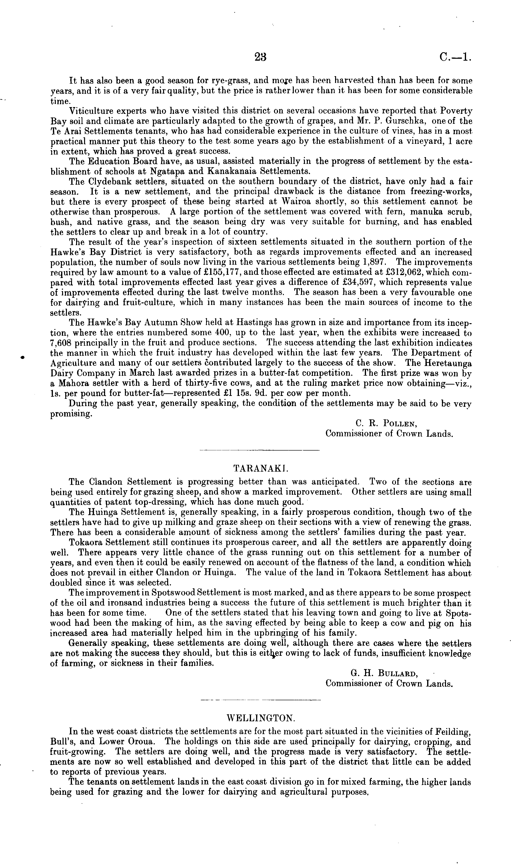 TARANAKI. The Clandon Settlement is progressing better than was anticipated. Two of the sections are being used entirely for grazing sheep, and show a marked improvement. Other settlers are using small quantities of patent top-dressing, which has done much good. The Huinga Settlement is, generally speaking, in a fairly prosperous condition, though two of the settlers have had to give up milking and graze sheep on their sections with a view of renewing the grass. There has been a considerable amount of sickness among the settlers' families during the past year. Tokaora Settlement still continues its prosperous career, and all the settlers are apparently doing well. There appears very little chance of the grass running out on this settlement for a number of years, and even then it could be easily renewed on account of the flatness of the land, a condition which does not prevail in either Clandon or Huinga. The value of the land in Tokaora Settlement has about doubled since it was selected. The improvement in Spotswood Settlement is most marked, and as there appears to be some prospect of the oil and ironsand industries being a success the future of this settlement is much brighter than it has been for some time. < > >f the settlers stated that his leaving town and going to live at Spotswood had been the making of him, as the saving effected by being able to keep a cow and pig on his increased area had materially helped him in the upbringing of his family. Generally speaking, these settlements are doing well, although there are cases where the settlers are not making the success they should, but this is either owing to lack of funds, insufficient knowledge of farming, or sickness in their families. G. H. Bullard, Commissioner of Crown Lands. WELLINGTON. In the west coast districts the sett lenients are for the most part situated in the vicinities of Feilding, Bull's, and Lower Oroua. The holdings on this side are used principally for dairying, cropping, and fruit-growing. The settlers are doing well, and the progress made is very satisfactory. The settlements are now so well established and developed in this part of the district that little can be added to reports of previous years. The tenants on settlement lands in the east coast division go in for mixed farming, the higher lands being used for grazing and the lower for dairying and agricultural purposes.