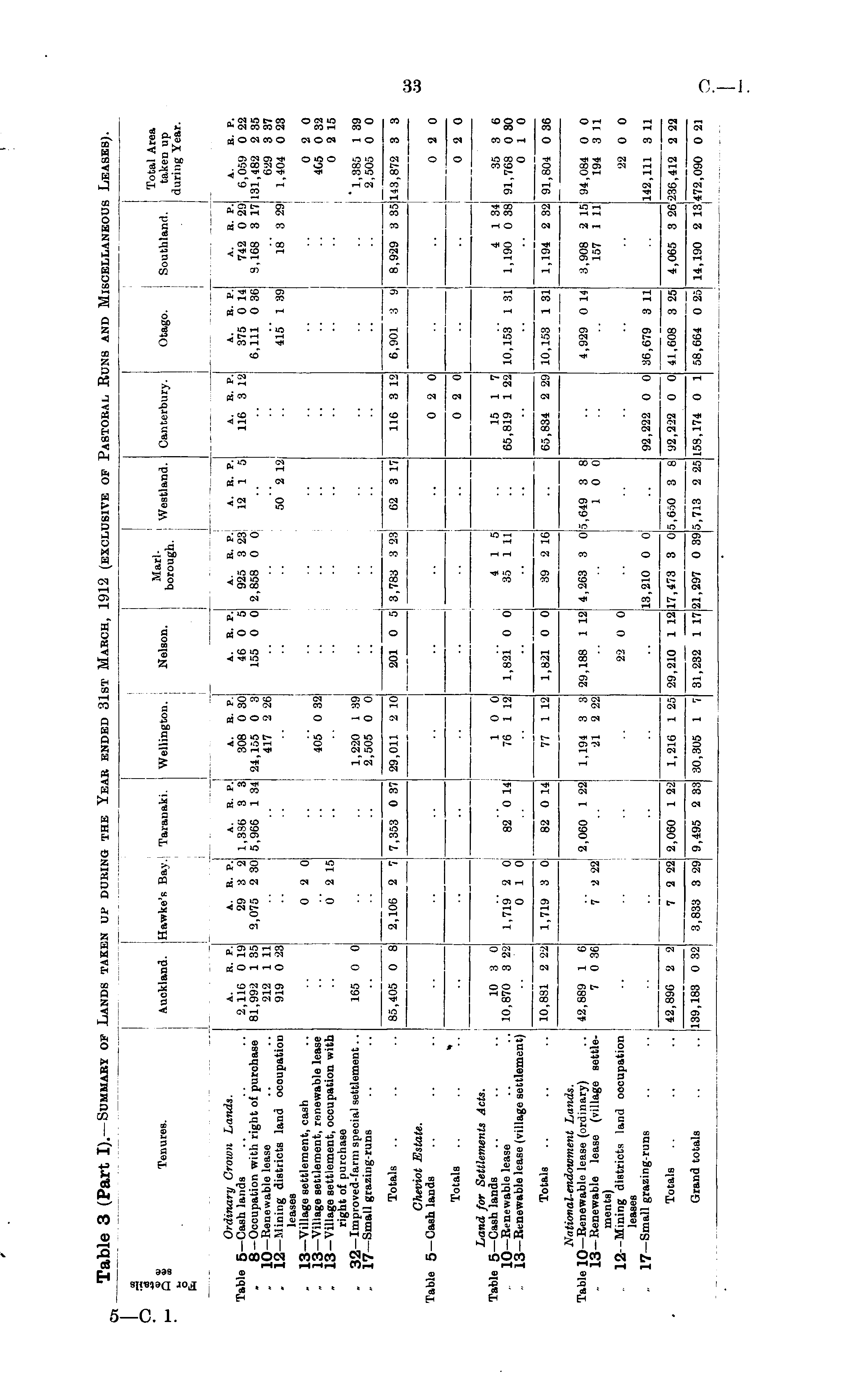 on '3 q * Tenures. o Auckland. Hawke's Bay. Taranaki. Wellington. Nelson. borough. \ We8fcland - Canterbury. Otago. Southland. Total Area taken up during Year. I I "1 I "" I I i ! I_ I Ordinary Crown Lands. Table 5—Cash lands 8—Occupation with right of purchase 10 —Renewable lease 12 —Mining distticts land occupation leases 13 —Village settlement, cash 13 —Village settlement, renewable lease 13—Village settlement, occupation with right of purchase 32 —Improved-farm special settlement.. 17 —Small grazing-runs A. R. P. 2,116 0 19 81,992 1 35 212 1 11 919 0 23 A. R. p. 29 3 2 2,075 2 30 A. R. p. 1,336 3 3 5,966 1 34 A. R. P. 308 0 30 24,155 0 3 417 2 26 A. R. P. 46 0 5 155 0 0 A. R. P. A. R. P. 925 3 23 12 1 5 2,858 0 0 A. R. P. 116 3 12 A. R. p. 375 0 14 6,111 0 36 A. R. P. 742 0 29 8,168 3 17 A. 11. P. 6,059 0 22 131,482 2 35 629 3 37 1,404 0 23 ■• 50 2 121 415 1 39 18 3 29| 0 2 0 405 0 32 " 0 2 0 405 0 32 0 2 15 " 0 2 15 " .. .. .. " 165 0 0 1,220 1 39 2,505 0 0 ' 1,385 1 39 2,505 0 0 ■■ ■■ •• Totals .. 85,405 0 8 2,106 2 7 7,353 0 37 3,783 3 23 62 3 17 143,872 3 3 29,011 2 10 201 0 5 3,783 3 23 116 3 12 6,901 3 9 8,929 3 35 Cheviot Estate. Table 5—Cash lands ■■ 0 2 0 .. 0 2 0 •• Totals 0 2 0 ■■ 0 2 Land for Settlements Acts. Table 5—Cash lands 10—Renewable lease 13 —Renewable lease (village settlement) 10 3 0| 10,870 3 221 I 1,719 2 0 0 10 82 0 14| 1 0 0 76 1 12 1,821 0 0 4 35 1 5 1 11 15 1 7 65,819 1 22 10,153 1 31 4 1 34 1,190 0 38 35 3 6 91,768 0 80 0 10 .. - Totals 10,831 2 22 1,719 3 0; 82 0 14 77 1 12 10,153 1 31 1,194 2 32 91,804 0 36 1,821 0 0 39 2 16 65,834 2 29 •• National-endowment Lands. Table 10 —Renewable lease (ordinary) 13—Renewable lease (village settlements) 12--Mining districts land occupation leases 17 —Small grazing-runs 42,889 1 6 7 0 36 7 2 22^ 2,060 1 22 1,194 3 3 •21 2 22 29,188 1 12 4,263 3 0 5,649 3 8 10 0 4,929 0 14 3,908 2 15 157 1 11 94,084 0 0 194 3 11 .. 22 0 0 22 0 0 42,896 2 2 I 7 2 22] | 2,060 1 22 13,210 0 0 17,473 3 0 5,650 3 8 92,222 0 0 U2.222 0 0 36,679 3 11 41,608 3 25 142,111 3 11 Totals 1,216 1 25 29,210 1 12| 4,065 3 26 236,412 2 22 Grand totals 139,183 0 32 3,833 3 29 9,495 2 33 21,297 0 39 30,305 1 7 31,232 1 17 5,713 2 25 158,174 0 1 58,664 0 25 14,190 2 13 472,090 0 21