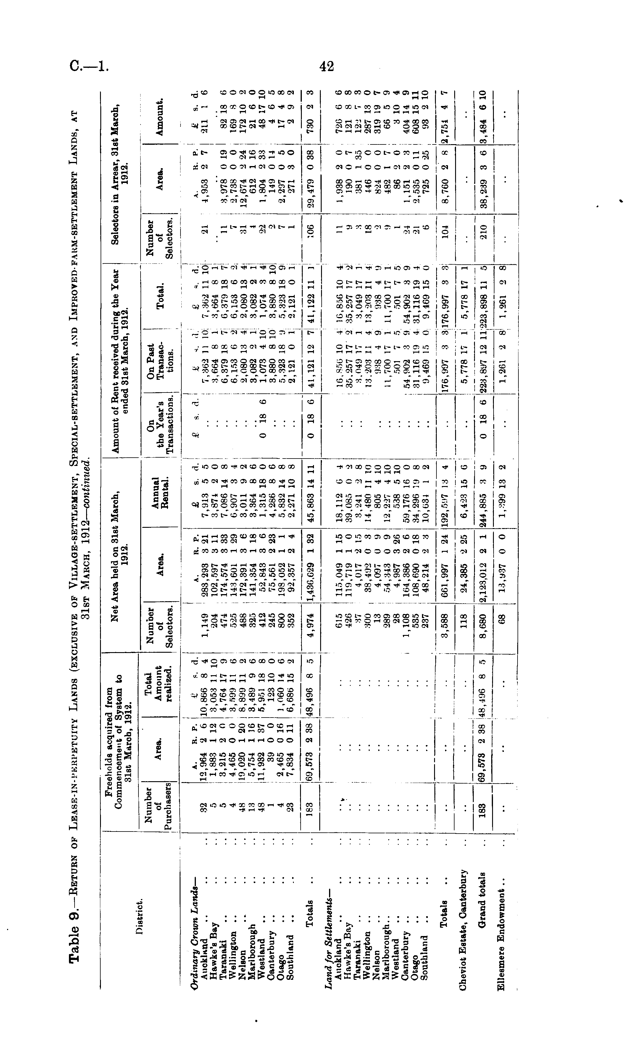 Freeholds acquired from Commencement of System to 31st March, 1912. Net Area held on 31st March, 1912. Amount of Rent received during the Year ended 31st March, 1912. Selectors in Arrear, 31st Maroh, 1912. District. Number of Purchasers Area. Total Amount realized. Number of Selectors. Area. Annual Rental. On the Year's Transactions. On Past Transactions. Total. Number of Selectors. Area. Amount. Ordinary Crown Lands — Auckland Hawke's Bay Taranaki Wellington .. Nelson Marlborough Westland Canterbury Otago Southland 32 5 5 4 48 13 48 1 4 23 12,964 2 6 1,883 1 12 3,215 2 0 4,465 0 0 19,020 1 20 5,754 1 16 11,932 1 37 39 0 0 2,465 0 16 7,834 0 11 £ s. a. jl0,866 8 4 3,053 11 10 4,764 17 9 3,599 11 6 i 8,899 11 2 ; 3,489 9 6 5,951 18 8 123 10 0 1,060 14 6 6,686 15 2 A. R. P. 1,149 283,293 3 21 204 102,597 3 11 474 , 174,574 3 33 525 143,601 1 29 488 172,391 3 6 325 141,354 1 18 412 52,843 3 6 245 75,561 2 23 800 198,052 1 1 352 92,357 2 4 £ s. d. 7,913 5 5 3,874 2 0 7,086 14 8 6,907 3 4 3,011 9 2 3,364 8 6 1,315 18 0 4,2S6 8 6 5,832 14 8 2,271 10 8 £ s. a. 0 18 6 £ s. ,1. i s. d.l £ k. d. 7,362 11 10 7,302 11 10 3.664 8 1 3,664 8 1 6,379 18 7 6,379 18 7 6,153 6 2 6,153 6 2; 2,080 13 4 2,080 13 i: 3,082 2 1 3,082 2 1 0 18 6 1,073 4 10 1,074 3 4| 3,880 8 10 3,880 8 10l 5,323 18 9 5,323 18 9: 2,121 0 1 2,121 0 1 £ s. d 7,362 11 II 3.664 8 6,379 18 ' 6.153 6 : 2,080 13 ■ 3,082 2 1,073 4 II 3,880 8 li 5,323 18 I 2,121 0 1. 1 : 7 ( 2 ( 4 I 1 I L0 io ; 9 i 1 i £ s. ( 7,302 11 1 3,664 8 6,379 18 6,153 6 2,080 13 3,082 2 1,074 3 3,880 8 1 5,323 18 2,121 0 (1. 10 21 7 "11 2 7 4 81 i! i 4| 22 10 2 9 7 1 1 21 11 31 1 22 2 7 1 \. R. P. 4,953 2 7 | 3,978 0 19 2,738 0 0 | 12,674 2 24 j 612 1 16 I 1,804 2 83 149 0 14 2,297 0 5 271 8 0 £ s. d. 211 1 6 82 18 6 169 8 0 172 10 2 21 6 0 48 17 10 4 6 5 17 4 8 2 9 2 Totals 183 69,573 2 38 ;48,496 8 5 4,974 1,436,629 1 33 45,863 14 11 0 18 6 41,121 12 7 41,122 11 1 106 29,479 0 38 730 2 Land for Settlements — Auckland Hawke's Bay Taranaki Wellington .. Nelson Marlborough.. Westland Canterbury Otago Southland ' v 615 426 37 300 13 289 28 1,108 535 237 115,049 1 15 ! 119,719 1 0 4,017 '2 15 38,492 0 3 4,097 0 9 5 1,343 0 9 4,987 3 26 1111,386 2 6 108,690 0 18 48,214 2 3 18,112 6 4 39.085 0 2 3,241 2 8 14,480 11 10 805 4 10 12,227 4 10 538 5 10 59,176 16 0 34,296 19 8 10,634 1 2 16,856 10 4 16,856 10 4 35.257 17 2 35,257 17 2 1 3.049 17 1 3,049 17 1 13.203 11 4 13,203 11 4 938 4 9 938 4 9 11,700 17 1 11,700 17 1 501 7 5 501 7 5 .-il.HO-2 3 9 54,902 3 9 31,116 19 4 31,116 19 1 ; 9,469 15 0 9,469 15 0 II 9 3 18 9 24 21 6 1,938 2 0 726 6 6 190 0 7 121 8 8 381 1 35 122 7 3 446 0 0 287 13 0 824 0 0 319 19 7 482 1 7 66 5 9 86 2 0 i 3 10 4 1,151 2 3 ! 404 14 9 2,535 0 11' 608 15 11 725 0 25 93 2 10 Totals 3,588 118 661,997 1 24 I 192,597 13 4 176,997 8 3176,997 3 3 104 8,760 2 8 2,751 4 7 Cheviot Estate, Canterbury- • • 24,385 2 25 5,778 17 1 5,778 17 l! 6,423 15 6 Grand totals 183 69,573 2 38 48,496 8 5 8,680 2,123,012 2 1 244,885 3 9 0 18 6 1223,897 12 11223,898 11 5j 210 38,239 3 6 3,484 6 10 Ellesmere Endowment .. 68 13,937 0 0 1,399 13 2 1,261 2 8 1,261 2 8 ••