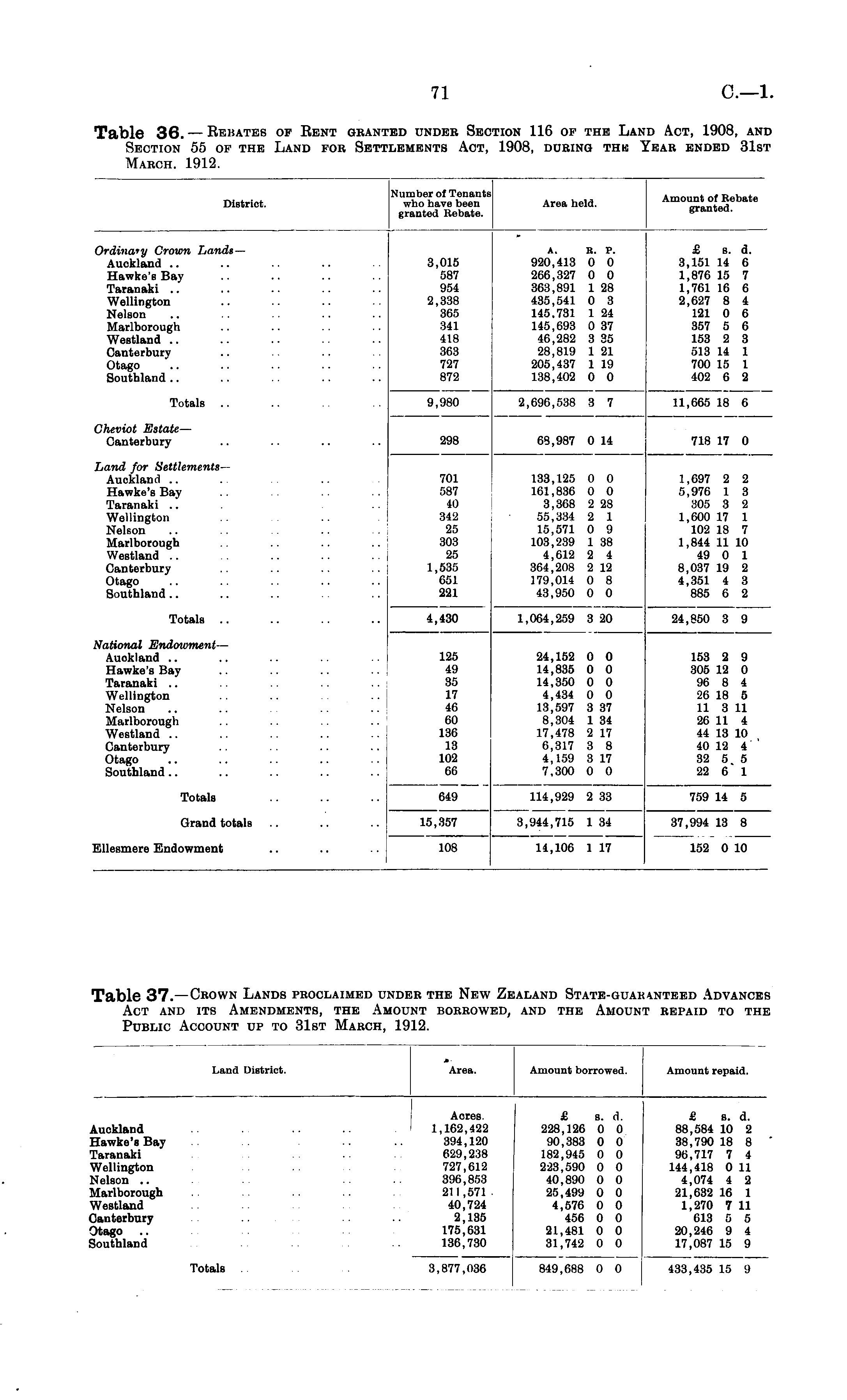 Table 37. —Crown Lands proclaimed under the New Zealand State-guaranteed Advances Act and its Amendments, the Amount borrowed, and the Amount repaid to the Public Account up to 31st March, 1912.