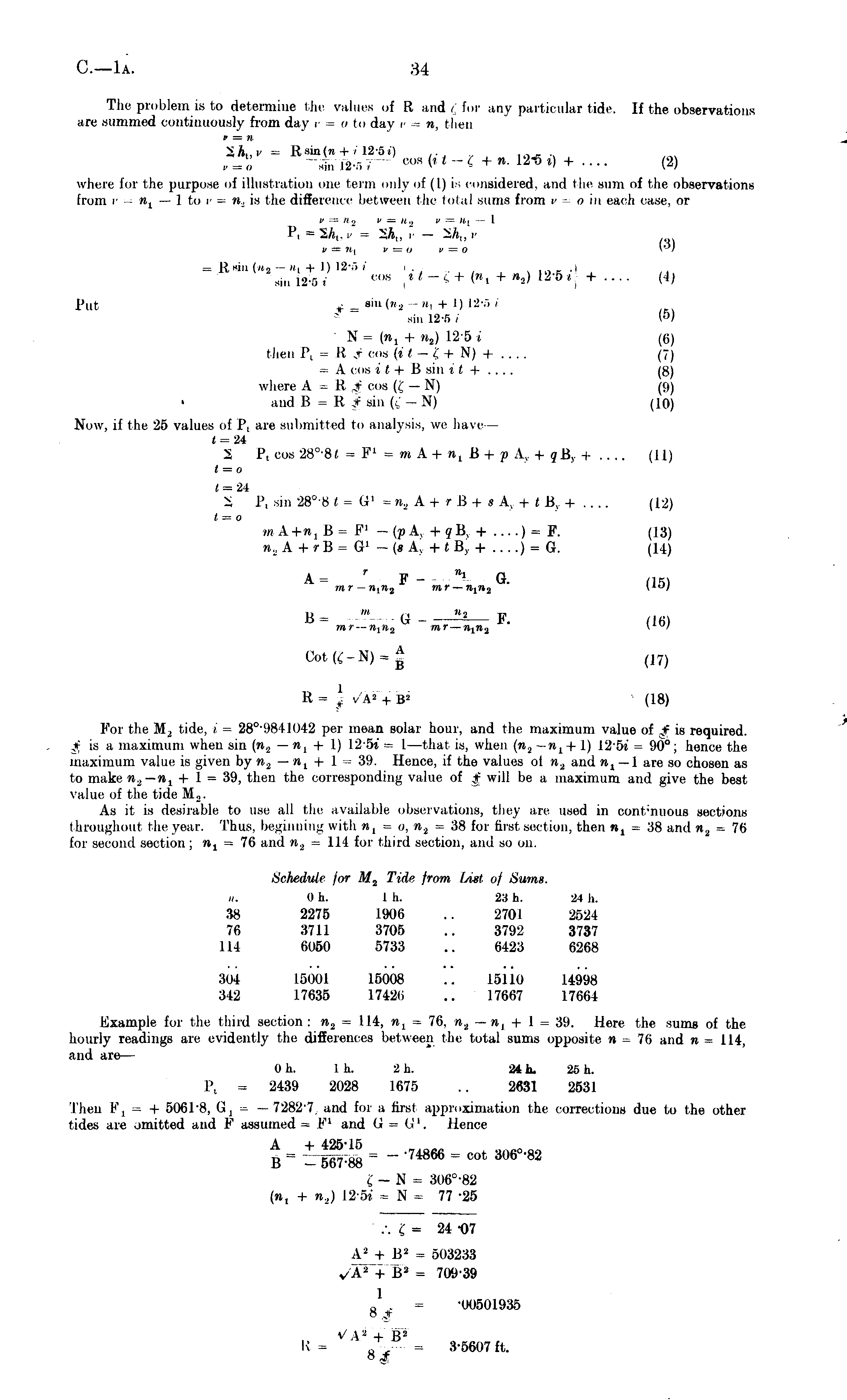 The problem is to determine the values of R audi for any particular tide. If the observations arc summed continuously from day 1 oto day v n. then v = n 2 ft,,c = R sin (« + /12-si) ~_, „ ,„_ „ sin 12-.-,/ ? cos(tt-£ +n. 1*6.) + .... (2) where for the purpose of illustration one term only of (I) is considered, and the sum of the observations from v= n t —Ito v = n., is the difference between the total sums from v oin each case, or v — n 2 V as » 2 [» =B //,, — 1 P,=SSt.A t . i/ = 2A,, i/ — SAt, v v = ?i| v = o y = o vO si „ ; 2 ., / cos tt-l+ (», + »,) 1 2-5 ,+.... (4j Put j, _ aiu(»o, ii, +I) 12-5 i sin 12-5 i \°) ■N = (Mj + w 2 ) 12-5 i (6) t hen P, = R .J cos (. f - £ + N) + (7) = A cos it + B sin it + .... (8) where A = R ,| cos (£ — N) (9) and B = R J sin (i - N) (10) Now, if the 25 values of P, are submitted to analysis, we have t = 24 i P, cos 28°-8« = F'=mA+it 1 B +PA, + gßy + .... (11) t = 0 < = 24 i P, sin 28°-B<= G 1 =n, A+ rß+ sAv+« B y + .... (12) 1 = 0 m A-f-w, B = F' -(pA v +?B, + ....)= F. (13) » a A+rß=Gl-(8 A y + « B y + ....) =G. (14) A = T F - "» G. n 5) mr — n l n 2 mr — n 1 n 2 V l "^ B = '" Q _ _^— F . (16) mr — n l u 2 mr — n l n 2 V *"/ Cotfc-N) = J (17) R- | v.V + (18) For the M 2 tide, i = 28°-9841042 per mean solar hour, and the maximum value of JF is required. £ is a maximum when sin (n. 2 —n l + 1) 12-5. = I—that is, when (n 2 —n Y +1) 12-5» = 90°; hence the maximum value is given by n 2 —n x + 1 = 39. Hence, if the values ol n 2 and n l —l are so chosen as to make n 2 —n l + 1 = 39, then the corresponding value of jf will be a maximum and give the best value of the tide M 2. As it is desirable to use all the available observations, they are used in cont-nuous sections I hrotighout the year. Thus, beginning with », =o, n 2 =38 for firsi seel ion, then n t =38 and « 2 =76 for second section; w x = 76 and n 2 = 114 for third section, and so on. Schedule for M 2 Tide from lAst of Sums. ii. 0 h. 1 h. 23 h. 24 h. 38 2275 1906 .. 2701 2524 76 3711 3705 .. 3792 3737 114 6050 5733 .. 6423 6268 304 15001 15008 .. 15110 14998 342 17635 17426 .. 17667 17664 Example for the third section: n 2 = 114, n t = 76, n t — n L + 1= 39. Here the sums of the hourly readings are evidently the differences between the total sums opposite n = 76 and « = 114, and are— Oh. Ni. 2 h. 24 k. 25 h. P t = 2439 2028 1675 .. 2631 2531 Then F, - + 506T8, G x = — 72827. and for a first approximation the corrections due to the other tides are omitted and F assumed =F l and G = G l . Hence A -i- 425-15 B = = ~~ ' 74866 = COt 306 °' 82 C - N - 306°-82 (n, + n.,) I*s. = N = 77 -25 '.'.£- 24 -07 A 2 + B 2 = 503233 y/A' + B 2 = 709-39 Q . = -00501935 o | V \ - 4- IS - X = - Q T X = 3-5607 ft.
