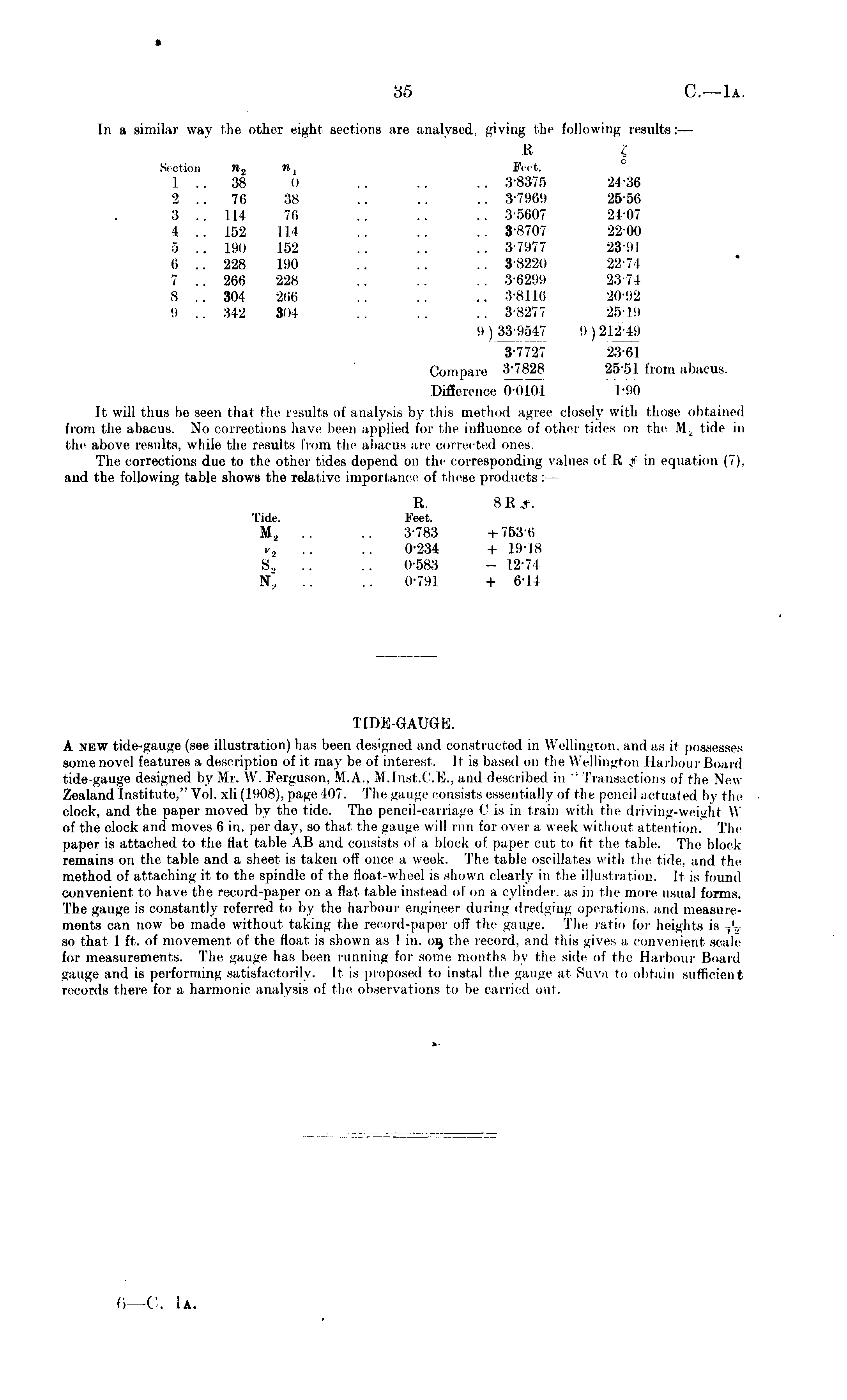 TIDE-GAUGE. A new tide-gauge (see illustration) has been designed and constructed in Wellington, and as it possesses some novel features a description of it may be of interest. It is based on the Wellington Harbour Board tide-gauge designed by Mr. \V. Ferguson. M.A., M.lnst.C.E., and described in " Transactions of the New Zealand Institute," Vol. xli (1908), page 107. The gang,- consists essentially of the pencil actuated by the clock, and the paper moved by the tide. The pencil-carriage Cis in train with the driving-weight \V of the clock and moves 6 in. per day, so that the gauge will run for oxer a week without attention. Tinpaper is attached to the flat table AB and consists of a block of paper cut to fit the table. The blockremains on the table and a sheet is taken off once a week. The table oscillates with the tide, and the method of attaching it to the spindle of the lloat-\\ heel is shown clearly in the illustration. It is found convenient to have the record-paper on a flat table instead of on a cylinder, as in the more usual forms. The gauge is constantly referred to by the harbour engineer during dredging operations, and measurements can now be made without taking the record-paper off the gauge. The ratio for heights is '~ so that I ft. of movement of the float is shown as I in. OB the record, and this gives a convenient scale for measurements. The gauge has been running lor some months h\ tin- side of Ihe Harbour Board gauge and is performing satisfactorily. It is proposed to instal the gauge at Suva to obtain sufficient records there for a harmonic analysis of the observations to be carried out.