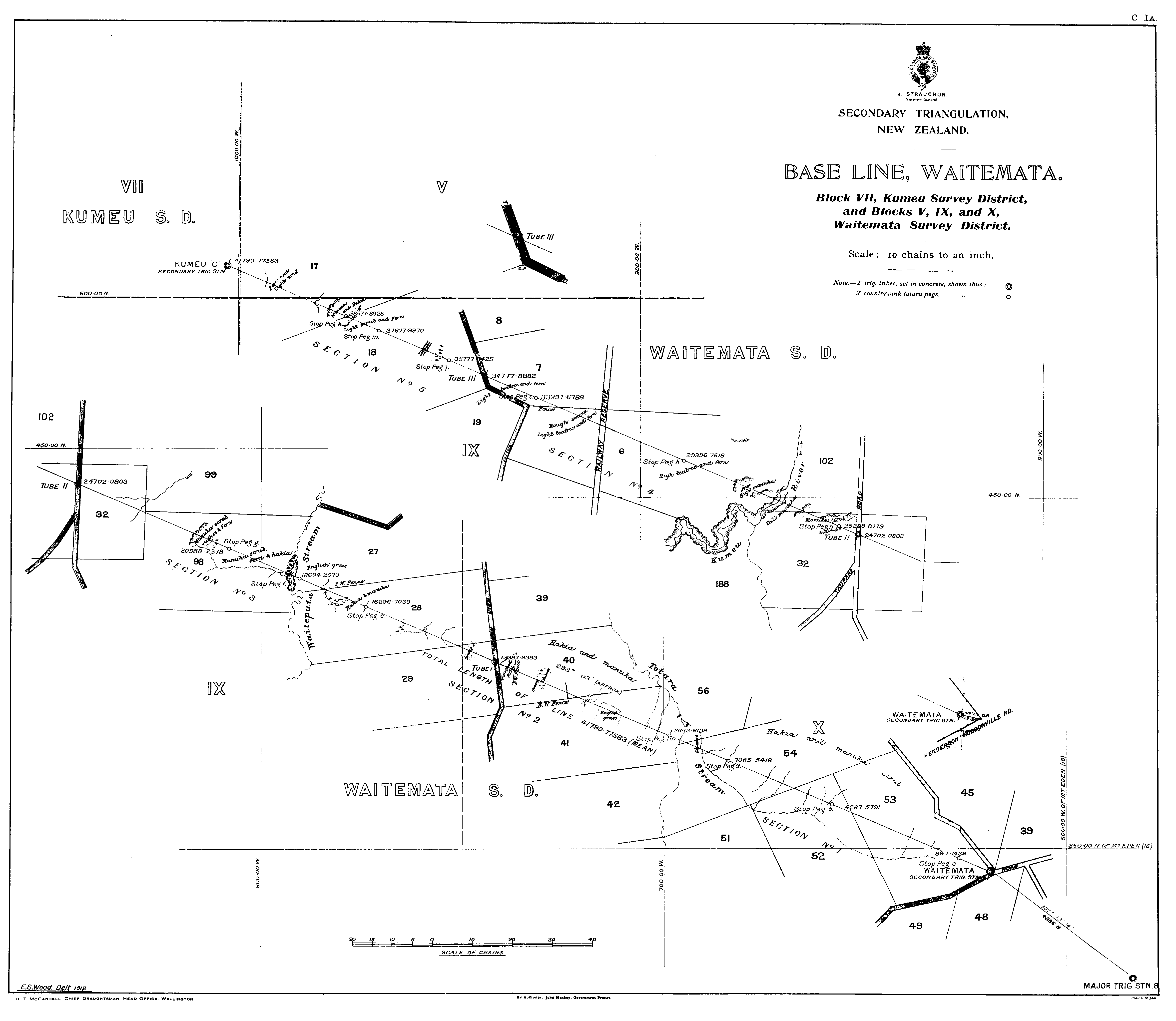 SECONDARY TRI ANGULATION, NEW ZEALAND. BASE LINE, WAITEMATA. Block VII, Kumeu Survey District, and Blocks V, IX, and X, Waitemata Survey District.