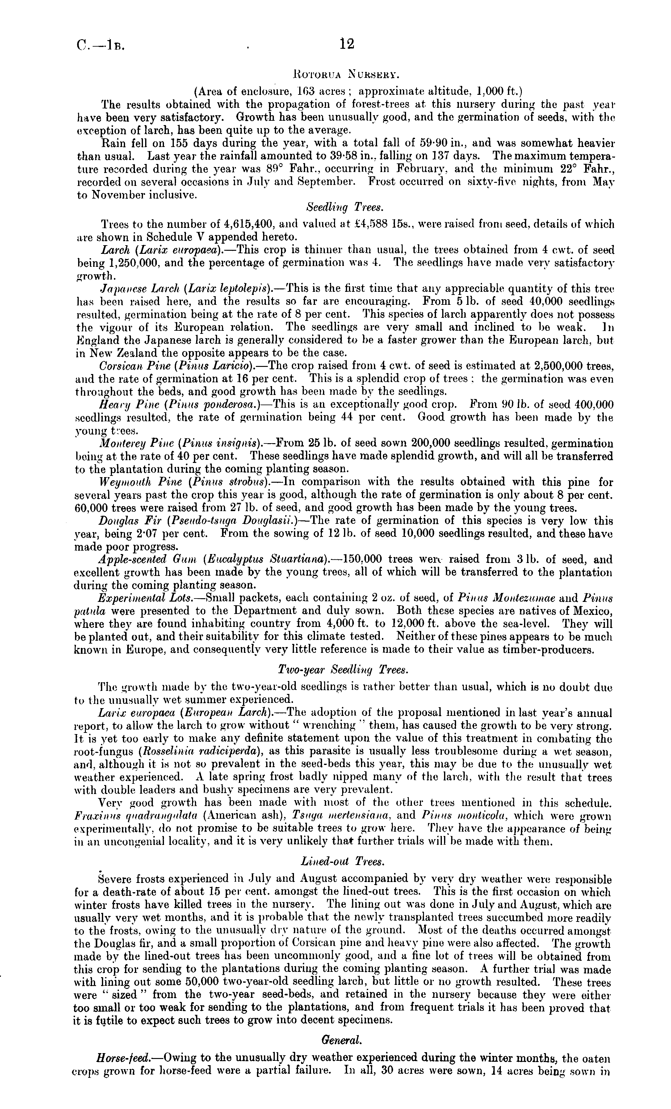 Rotorua Nursery, (Area of enclosure, Mi 3 acres ; approximate altitude. 1,000 ft.) The results obtained with the propagation of forest-trees at this nursery during the past year have been very satisfactory. Growth has been unusually good, and the germination of seeds, with the exception of larch, has been quite up to the average. Rain fell on 155 days during the year, with a total fall of 59-90 in., and was somewhat heavier than usual. Last year the rainfall amounted to 39-58 in., falling on 137 days. The maximum temperature recorded during the year was 89° Fahr., occurring in February, and the minimum 22° Fahr., recorded on several occasions in July and September. Frost occurred on sixty-five nights, from May to November inclusive. Seedling Trees. Trees to the number of 4,615,400. and valued at £4,588 155., were raised from seed, details of which are shown in Schedule V appended hereto. Lurch (Larix europaea). —This crop is thinner than usual, the trees obtained from 4 cwt. of seed being 1,250.000. and the percentage of germination was I. The seedlings have made very satisfactory growth. Japanese Larch [Larix leptolepis). —This is the first time that any appreciable quantity of this tree has been raised here, and the results so far arc encouraging. From 51b. of seed 40,000 seedlings resulted, germination being at the rate of 8 per cent. This species of larch apparently docs not possess the vigour of its European relation. The seedlings arc very small and inclined to be weak. In England the Japanese larch is generally considered to be a faster grower than the European larch, but in New Zealand the opposite appears to be the case. Corsican Pine (Pinus Laricio). —The crop raised from 4 cwt. of seed is estimated at 2,500,000 trees, and the rate of germination at 16 per cent. This is a splendid crop of trees : the germination was even throughout the beds, and good growth has been made by the seedlings. Heavy Pine (/'inns ponderosa.) This is an exceptionally good crop. From '.to lb. of seed 400,000 seedlings resulted, the rate of germination being II per cent, (lood growth has been made by the young trees. Monterey Pine (Pinus insignia). —From 25 lb. of seed sown 200,000 seedlings resulted, germination being at the rate of 40 per cent. These seedlings have made splendid growth, and will all be transferred to the plantation during the coming planting season. Weymouth Pine [Pinus strobus). —In comparison with the results obtained with this pine for several years past the crop this year is good, although the rate of germination is only about 8 per cent. 60.000 trees were raised from 27 lb. of seed, and good growth has been made by the young trees. Douglas Fir (Pseudo-tsuga Douglasii.) —The rate of germination of this species is very low this year, being 2-07 per cent. From the sowing of 12 lb. of seed 10,000 seedlings resulted, and these have made poor progress. Apple-scented Gum (Eucalyptus Stuartiana). —150,000 trees wen raised from 3 lb. of seed, and excellent growth has been made by the young trees, all of which will be transferred to the plantation during the coming planting season. Experimental Lots. —Small packets, each containing 2 oz. of seed, of Pinus Moittezumae and Pin us patula wore presented to the Department and duly sown. Both these species are natives of Mexico, where they are found inhabiting country from 4,000 ft. to 12,000 ft. above the sea-level. They will be planted out, and their suitability for this climate tested. Neither of these pines appears to be much known in Europe, and consequently very little reference is made to their value as timber-producers. Two-year Seedling Trees. The growth made by the two-year-old seedlings is rather better than usual, which is no doubt due to the unusually wet summer experienced. Larix europaea (European Larch). —The adoption of the proposal mentioned in last year's annual report, to allow the larch to mow without " wrenching " them, has caused the growth to be very strong. It is vet too early to make any definite statement upon the value of this treatment in combating the root-fungus [Rosselinia radiciperda), as this parasite is usually less troublesome during a wet season, and. although it is not so prevalent in the seed-beds this year, this may lie due to the unusually wet weather experienced. A late spring frost badly nipped many of the larch, with the result that trees with double leaders and bushy specimens arc very prevalent. Very good growth has been made with most of the other trees mentioned in this schedule. Fraxiiiits quad/rangulata (American ash), Tsuga mertensiana, and Pinus monticola, which were grown experimentally, do not promise to be suitable trees to grow here. They have the appearance of being in an uncongenial locality, and it is very unlikely that further trials will be made with them. Lined-out Trees. Severe frosts experienced in July and August accompanied by very dry weather were responsible for a death-rate of about 15 per cent, amongst the lined-out trees. This is the first occasion on which winter frosts have killed trees in the nursery. The lining out was done in July and August, which arc usually very wet months, and it is probable that the newly transplanted trees succumbed more readily to the frosts, owing to the unusually dry nature of the ground. .Most of the deaths occurred amongst the Douglas fir, and a small proportion of Corsican pine and heavy pine were also affected. The growth made by the lined-out trees has been uncommonly good, and a line lot of trees will be obtained from this crop for sending to the plantations during the coming planting season. A further trial was made with lining out some 50,000 two-year-old seedling larch, but little or no growth resulted. These trees were " sized " from the two-year seed-bods, and retained in the nursery because they were either too small or too weak for sending to the plantations, and from frequent trials it has been proved that it i