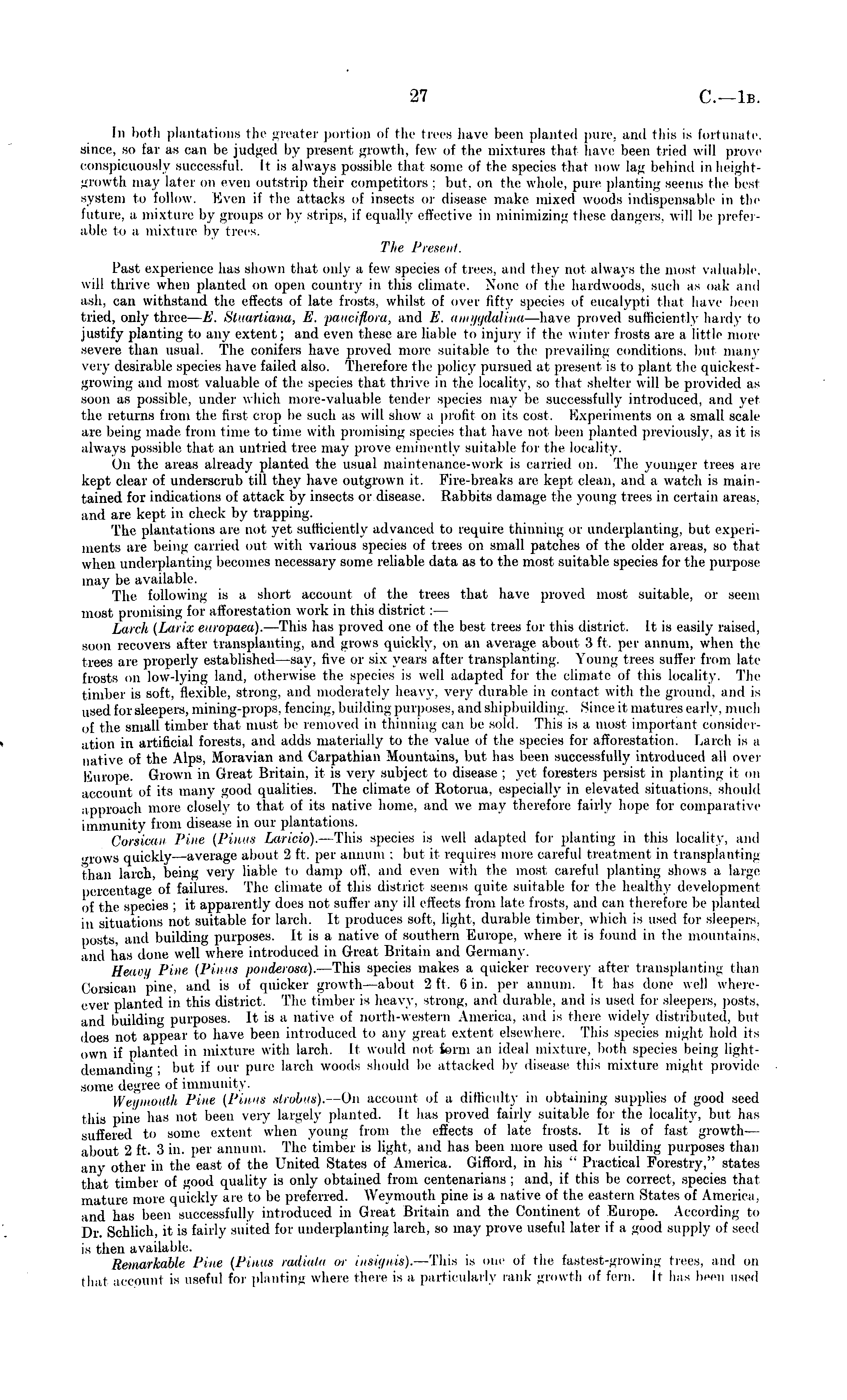 In both plantations the greater portion of the trees have been planted pure, and this is fortunate, since, so far as can be judged by present growth, few of the mixtures that have been tried will prove conspicuously successful. It is always possible that some of the species that now lag behind inheightgrovvth may later on even outstrip their Competitors; but. on the whole, pure planting seems the best system to follow. Even if the attacks of insects or disease make mixed woods indispensable in the future, a mixture by groups or by strips, if equally effective in minimizing these dangers, will be preferable to a mixture by trees. The Present. Past experience has shown that only a few species of trees, ami tliev not always the most valuable, will thrive when planted on open country in this climate. None of the hardwoods, such as oak and ash, can withstand the effects of late frosts, whilst of over fifty species of eucalypti that have been tried, only three— E. Stuartiana, E. paueifiora, and E. amygdalina —have proved sufficiently hardy to justify planting to any extent; and even these are liable to injury if the winter frosts are a little more severe than usual. The conifers have proved more suitable to the prevailing conditions, but many very desirable species have failed also. Therefore the policy pursued at present is t<> plant t lie quickestgrowing and most valuable of the species that thrive in the locality, so thai shelter will be provided as soon as possible, under which more-valuable tender species may be successfully introduced, and yet the returns from the first crop be such as will show a profit on its cost. Experiments on a small scale .ire being made from time to time with promising species that have not been planted previously, as it is always possible that an untried tree may prove eminently suitable for the locality. On the areas already planted the usual maintenance-work is carried on. The younger trees are kepi clear of underscrub till they have outgrown ii. Fire-breaks are kept clean, and a watch is maintained for indications of attack by insects or disease. Rabbits damage the young trees in ceil a ill areas. anil are kepi in check by trapping. The plantations are not yet sufficiently advanced to require thinning or underplanting, but experiments arc being carried out with various species of trees on small patches of the older areas, so that when anderplanl ing becomes necessary some reliable data as to the most suitable species for the purpose may be available. The following is a short account of the trees that have proved most suitable, or seem most promising for afforestation work in this district : — Larch (Larixeuropaea).- This has proved one of the best trees tor this district. It is easily raised, SOOn recovers after transplanting, and grows quickly, on an average about 3 ft. per annum, when the trees are properly established—say, live or six years after transplanting. Young trees suffer from late frosts on low-lying land, otherwise the species is well adapted for the climate of this locality. The timber is soft, flexible, Strong, and moderately heavy, very durable in contact with the ground, and i-. 11 seii for sleepers, mining-pro ps. fencing. I mild ing purposes, and shipbuilding. Since it matures earl v. nine 11 of the small timber that must be removed in thinning can be sold. This is a most important consideration in artificial forests, and adds materially to the value of the species for afforestation. Larch is a native of the Alps, Moravian and Carpathian Mountains, but has been successfully introduced all over Europe. Grown in Great Britain, it is very subject to disease : vet foresters persist in planting it on account of its many good qualities. The climate of Rotorua. especially in elevated situations, should approach more closely to that of its native home, and we may therefore fairly hope for comparative immunity from disease in our plantations. Corsican Pine (Pinus Laricio). —This species is well adapted for planting in this locality, ami .■rows quickly—average about 2 ft. per annum : but it requires more careful treatment in transplanting Than larch, being very liable to damp oil. and even with the most careful planting shows a large percentage of failures. The climate of this district seems quite suitable for the healthy development of the species ; it apparently does not Suffer any ill effects from late frosts, and can therefore be planted in situations not suitable for larch. It produces soft, light, durable timber, which is used for sleepers, posts, ami building purposes. It is a native of southern Europe, where it is found in the mountains, and has done well where introduced in Croat Britain and Germany. Heavy Pine (Pinus ponderosa).- This species makes a quicker recovery after transplanting than Corsican pine, and is of quicker growth about 2 ft. li in. per annum. Il has done well whereever planted in this district. The timber is heavy, strong, and durable, and is used for sleepers, posts, and building purposes. It is a native of north-western America, and is there widely distributed. Iml does not appear to have been introduced to any great extent elsewhere. This species might hold its own if planted in mixture with larch. It would not farm an ideal mixture, both species being light demanding' but if our pure larch woods should be attacked by disease this mixture might provide some degree of immunity. Weymouth Pine (Pinus strobus).- -On account of a difficulty in obtaining supplies of good seed this pine has not been very largely planted. It has proved fairly suitable for the locality, but has .suffered to some extent when young from the effects of late frosts. 11 is of fast growth— about 2 ft. 5 in- per annum. The timber is light, and has been more used lor building purposes than any other ill the east of the United States of America. Gifford, in his " Practical Forestry," states that timber of good quality is only obtained fro