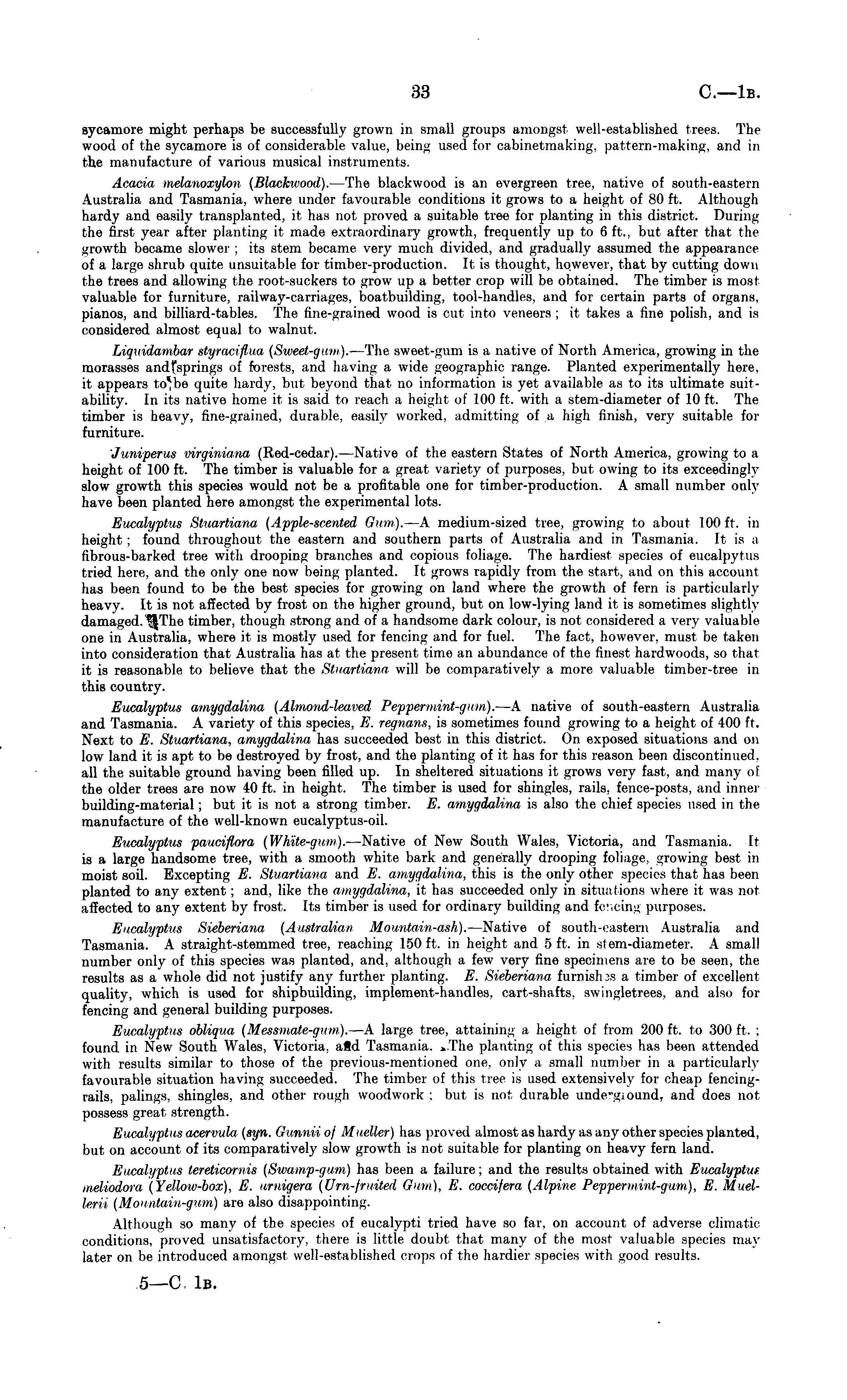 sycamore might perhaps be successfully grown in small groups amongst well-established trees. The wood of the sycamore is of considerable value, being used for cabinetmaking. pattern-making, and in the manufacture of various musical instruments. Acacia melanoxylon (Blackwood). —The blackwood is an evergreen tree, native of south-eastern Australia and Tasmania, where under favourable conditions it grows to a height of 80 ft. Although hardy and easily transplanted, it has not proved a suitable tree for planting in this district. During the first year after planting it made extraordinary growth, frequently up to 6 ft., but after that the growth became slower ; its stem became very much divided, and gradually assumed the appearance of a large shrub quite unsuitable for timber-production. It is thought, hqwever, that by cutting down the trees and allowing the root-suckers to grow up a better crop will be obtained. The timber is most valuable for furniture, railway-carriages, boatbuilding, tool-handles, and for certain parts of organs, pianos, and billiard-tables. The fine-grained wood is cut into veneers; it takes a fine polish, and is considered almost equal to walnut. Liquidambar styracif.ua (Sweet-gum). —The sweet-gum is a native of North America, growing in the morasses andfsprings of forests, and having a wide geographic range. Planted experimentally here, it appears to'be quite hardy, but beyond that no information is yet available as to its ultimate suitability. In its native home it is said to reach a height of 100 ft. with a stem-diameter of 10 ft. The timber is heavy, fine-grained, durable, easily worked, admitting of a high finish, very suitable for furniture. 'Juniperus virginiana (Red-cedar). —Native of the eastern States of North America, growing to a height of 100 ft. The timber is valuable for a great variety of purposes, but owing to its exceedingly slow growth this species would not be a profitable one for timber-production. A small number only have been planted here amongst the experimental lots. Eucalyptus Sttiartiana (Apple-scented Oum). —A medium-sized tree, growing to about 100 ft. in height; found throughout the eastern and southern parts of Australia and in Tasmania. It is a fibrous-barked tree with drooping branches and copious foliage. The hardiest species of eucalpytus tried here, and the only one now being planted. It grows rapidly from the start, and on this account has been found to be the best species for growing on laud where the growth of fern is particularly heavy. It is not affected by frost on the higher ground, but on low-lying land it is sometimes slightly damaged. timber, though strong and of a handsome dark colour, is not considered a very valuable one in Australia, where it is mostly used for fencing and for fuel. The fact, however, must be taken into consideration that Australia has at the present time an abundance of the finest hardwoods, so that it is reasonable to believe that the Stuartiana will be comparatively a more valuable timber-tree in this country. Eucalyptus amygdalina (Almond-leaved Peppermint-gum). —A native of south-eastern Australia and Tasmania. A variety of this species, E. regnans, is sometimes found growing to a height of 400 ft. Next to E. Stuartiana, amygdalina has succeeded best in this district. On exposed situations and on low land it is apt to be destroyed by frost, and the planting of it has for this reason been discontinued. all the suitable ground having been filled up. In sheltered situations it grows very fast, and many of the older trees are now 40 ft. in height. The timber is used for shingles, rails, fence-posts, and inner building-material; but it is not a strong timber. E. amygdaMna is also the chief species used in the manufacture of the well-known eucalyptus-oil. Eucalyptus pauciflora (White-gum). —Native of New South Wales, Victoria, and Tasmania. It is a large handsome tree, with a smooth white bark and generally drooping foliage, growing best in moist soil. Excepting E. Stuartiana and E. amygdalina, this is the only other species that has been planted to any extent; and, like the amygdalina, it has succeeded only in situations where it was not affected to any extent by frost. Its timber is used for ordinary building and fencing purposes. Eucalyptus Sieberiana (Australian Mountain-ash). —Native of south-eastern Australia and Tasmania. A straight-stemmed tree, reaching 150 ft. in height and 5 ft. in st em-diameter. A small number only of this species was planted, and, although a few very fine specimens are to be seen, the results as a whole did not justify any further planting. E. Sieberiana furnishes a timber of excellent quality, which is used for shipbuilding, implement-handles, cart-shafts, swingletrees, and also for fencing and general building purposes. Eucalyptus obliqua (Messmate-gum). —A large tree, attaining a height of from 200 ft. to 300 ft. ; found in New South Wales, Victoria, aid Tasmania. ...The planting of this species has been attended with results similar to those of the previous-mentioned one. only a small number in a particularly favourable situation having succeeded. The timber of this tree is used extensively for cheap fencingrails, palings, shingles, and other rough woodwork ; but is not durable unde-giound. and does not possess great strength. Eucalyptus aeervula (syn. Qvnniio) Mueller) has proved almost as hardy as any other species planted, lint on account of its comparatively slow growth is not suitable for planting on heavy fern land. Eucalyptus tereticornis (Swamp-gum) has been a failure; and the results obtained with Eucalyptus meliodora (Yellow-box), E. arnigera (Urn-fruited Gum). E. coccifera (Alpine Peppermint-gum), E. Muellerii [Mountain-gum) are also disappointing. Although so many of the species of eucalypti tried have so far. on account of adverse climatic conditions, proved unsatisfactory, there is little doubt that many of the most valuable species may late
