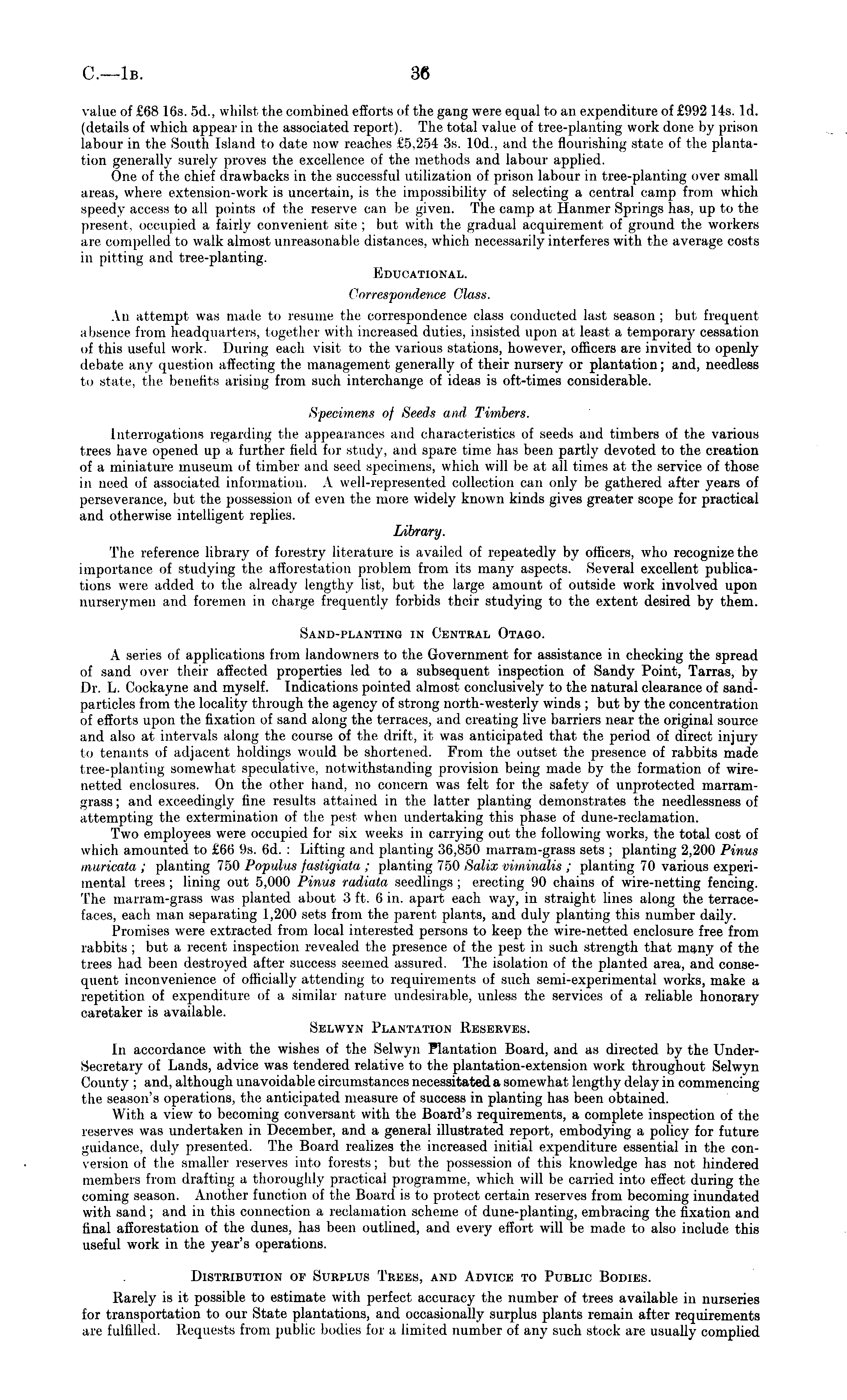 value of £68 16s. 5d., whilst the combined efforts of the gang were equal to an expenditure of £992 lis. Id. (details of which appear in the associated report). The total value of tree-planting work done by prison labour in the South Island to date now reaches £5,254 3s. 10d., and the flourishing state of the plantation generally surely proves the excellence of the methods and labour applied. One of the chief drawbacks in the successful utilization of prison labour in tree-planting over small areas, where extension-work is uncertain, is the impossibility of selecting a central camp from which speedy access to all points of the reserve can be given. The camp at Hanmer Springs has, up to the present, occupied a fairly convenient site ; but with the gradual acquirement of ground the workers are compelled to walk almost unreasonable distances, which necessarily interferes with the average costs in pitting and tree-planting. Educational. Correspondence Class. An attempt was made to resume the correspondence class conducted last season; but frequent absence from headquarters, together with increased duties, insisted upon at least a temporary cessation of this useful work. During each visit to the various stations, however, officers are invited to openly debate any question affecting the management generally of their nursery or plantation; and, needless to state, the benefits arising from such interchange of ideas is oft-times considerable. Specimens oj Seeds anil Timbers. Interrogations regarding the appearances and characteristics of seeds and timbers of the various trees have opened up a further field for study, and spare time has been partly devoted to the creation of a miniature museum of timber and seed specimens, which will be at all times at the service of those in need of associated information. A well-represented collection can only be gathered after years of perseverance, but the possession of even the more widely known kinds gives greater scope for practical and otherwise intelligent replies. Library. The reference library of forestry literature is availed of repeatedly by officers, who recognize the importance of studying the afforestation problem from its many aspects. Several excellent publications were added to the already lengthy list, but the large amount of outside work involved upon nurserymen and foremen in charge frequently forbids their studying to the extent desired by them. Sand-planting in Central Otago. A series of applications from landowners to the Government for assistance in checking the spread of sand over their affected properties led to a subsequent inspection of Sandy Point, Tarras, by Dr. L. Cockayne and myself. Indications pointed almost conclusively to the natural clearance of sandparticles from the locality through the agency of strong north-westerly winds ; but by the concentration of efforts upon the fixation of sand along the terraces, and creating live barriers near the original source and also at intervals along the course of the drift, it was anticipated that the period of direct injury to tenants of adjacent holdings would be shortened. From the outset the presence of rabbits made tree-planting somewhat speculative, notwithstanding provision being made by the formation of wirenetted enclosures. On the other hand, no concern was felt for the safety of unprotected marramgrass ; and exceedingly fine results attained in the latter planting demonstrates the needlessness of attempting the, extermination of the pest when undertaking this phase of dune-reclamation. Two employees were occupied for six weeks in carrying out the following works, the total cost of which amounted to £66 9s. 6d. : Lifting and planting 36,850 marram-grass sets ; planting 2,200 Pinus muricata ; planting 750 Populus fastigiata ; planting 750 Salix viminalis ; planting 70 various experimental trees ; lining out 5,000 Pinus radiata seedlings ; erecting 90 chains of wire-netting fencing. The marram-grass was planted about 3 ft. 6 in. apart each way, in straight lines along the terracefaces, each man separating 1,200 sets from the parent plants, and duly planting this number daily. Promises were extracted from local interested persons to keep the wire-netted enclosure free from rabbits ; but a recent inspection revealed the presence of the pest in such strength that many of the trees had been destroyed after success seemed assured. The isolation of the planted area, and consequent inconvenience of officially attending to requirements of such semi-experimental works, make a repetition of expenditure of a similar nature undesirable, unless the services of a reliable honorary caretaker is available. Selwyn Plantation Reserves. In accordance with the wishes of the Selwyn Plantation Board, and as directed by the UnderSecretary of Lands, advice was tendered relative to the plantation-extension work throughout Selwyn County ; and, although unavoidable circumstances necessitated a somewhat lengthy delay in commencing the season's operations, the anticipated measure of success in planting has been obtained. With a view to becoming conversant with the Board's requirements, a complete inspection of the reserves was undertaken in December, and a general illustrated report, embodying a policy for future guidance, duly presented. The Board realizes the increased initial expenditure essential in the conversion of the smaller reserves into forests; but the possession of this knowledge has not hindered members from drafting a thoroughly practical programme, which will be carried into effect during the coming season. Another function of the Board is to protect certain reserves from becoming inundated with sand; and in this connection a reclamation scheme of dune-planting, embracing the fixation and final afforestation of the dunes, has been outlined, and every effort will be made to also include this useful work in the year's operations. Distribution of Surplus Trees, and Advice to Public Bodies. Rar