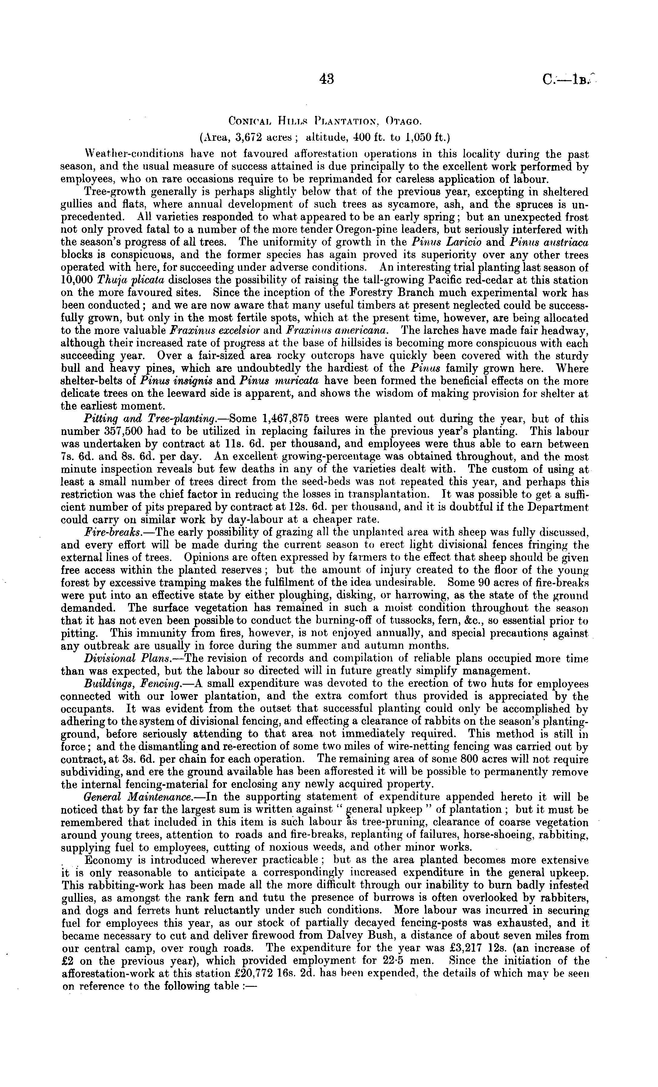 Conical Hills Plantation, Otago. (Area, 3,672 acres; altitude, 400 ft. to 1.050 ft.) Weather-conditions have not favoured afforestation operations in this locality during the past season, and the usual measure of success attained is due principally to the excellent work performed by employees, who on rare occasions require to be reprimanded for careless application of labour. Tree-growth generally is perhaps slightly below that of the previous year, excepting in sheltered gullies and flats, where annual development of such trees as sycamore, ash, and the spruces is unprecedented. All varieties responded to wdiat appeared to be an early spring; but an unexpected frost not only proved fatal to a number of the more tender Oregon-pine leaders, but seriously interfered with the season's progress of all trees. The uniformity of growth in the Pinus Laricio and Pinus austriaca blocks is conspicuous, and the former species has again proved its superiority over any other trees operated with here, for succeeding under adverse conditions. An interesting trial planting last season of 10,000 Thuja plicata discloses the possibility of raising the tall-growing Pacific red-cedar at this station on the more favoured sites. Since the inception of the Forestry Branch much experimental work lias been conducted; and we are now aware that many useful timbers at present neglected could be successfully grown, but only in the most fertile spots, which at the present time, however, are being allocated to the more valuable Fraxinus excelsior and Fraxmus americana. The larches have made fair headway, although their increased rate of progress at the base of hillsides is becoming more conspicuous with each succeeding year. Over a fair-sized area rocky outcrops have quickly been covered with the sturdy bull and heavy pines, which are undoubtedly the hardiest of the Pinus family grown here. Where shelter-belts of Pinus insignis and Pinus muricata have been formed the beneficial effects on the more delicate trees on the leeward side is apparent, and shows the wisdom of making provision for shelter at the earliest moment. Pitting and Tree-planting. —Some 1,467,875 trees were planted out during the year, but of this number 357,500 had to be utilized in replacing failures in the previous year's planting. This labour was undertaken by contract at lis. 6d. per thousand, and employees were thus able to earn between 7s. 6d. and Bs. 6d. per day. An excellent growing-percentage was obtained throughout, and the most minute inspection reveals but few deaths in any of the varieties dealt with. The custom of using at least a small number of trees direct from the seed-beds was not repeated this year, and perhaps this restriction was the chief factor in reducing the losses in transplantation. It was possible to get a sufficient number of pits prepared by contract at 12s. 6d. per thousand, and it is doubtful if the Department could carry on similar work by day-labour at a cheaper rate. Fire-breaks. —The early possibility of grazing all the implanted area with sheep was fully discussed. and every effort will be made during the current season to erect light divisional fences fringing the external lines of trees. Opinions are often expressed by farmers to the effect that sheep should be given free access within the planted reserves ; but the amount of injury created to the floor of the young forest by excessive tramping makes the fulfilment of the idea undesirable. Some 90 acres of fire-breaks were put into an effective state by either ploughing, disking, or harrowing, as the state of the ground demanded. The surface vegetation has remained in such a moist condition throughout the season that it has not even been possible to conduct the burning-off of tussocks, fern, &c, so essential prior to pitting. This immunity from fires, however, is not enjoyed annually, and special precautions against any outbreak are usually in force during the summer and autumn months. Divisional Plans. —The revision of records and compilation of reliable plans occupied more time than was expected, but the labour so directed will in future greatly simplify management. Buildings, Fencing. —A small expenditure was devoted to the erection of two huts for employees connected with our lower plantation, and the extra comfort thus provided is appreciated by the occupants. It was evident from the outset that successful planting could only be accomplished by adhering to the system of divisional fencing, and effecting a clearance of rabbits on the season's plantingground, before seriously attending to that area not immediately required. This method is still in force; and the dismantling and re-erection of some two miles of wire-netting fencing was carried out by contract, at 3s. 6d. per chain for each operation. The remaining area of some 800 acres will not require subdividing, and ere the ground available has been afforested it will be possible to permanently remove the internal fencing-material for enclosing any newly acquired property. General Maintenance. —In the supporting statement of expenditure appended hereto it will be noticed that by far the largest sum is written against " general upkeep " of plantation ; but it must be remembered that included in this item is such labour as tree-pruning, clearance of coarse vegetation around young trees, attention to roads and fire-breaks, replanting of failures, horse-shoeing, rabbiting, supplying fuel to employees, cutting of noxious weeds, and other minor works. Economy is introduced wherever practicable; but as the area planted becomes more extensive it is only reasonable to anticipate a correspondingly increased expenditure in the general upkeep. This rabbiting-work has been made all the more difficult through our inability to burn badly infested gullies, as amongst the rank fern and tutu the presence of burrows is often overlooked by rabbiters, and dogs and ferrets hunt reluctantly under such conditions. .More l
