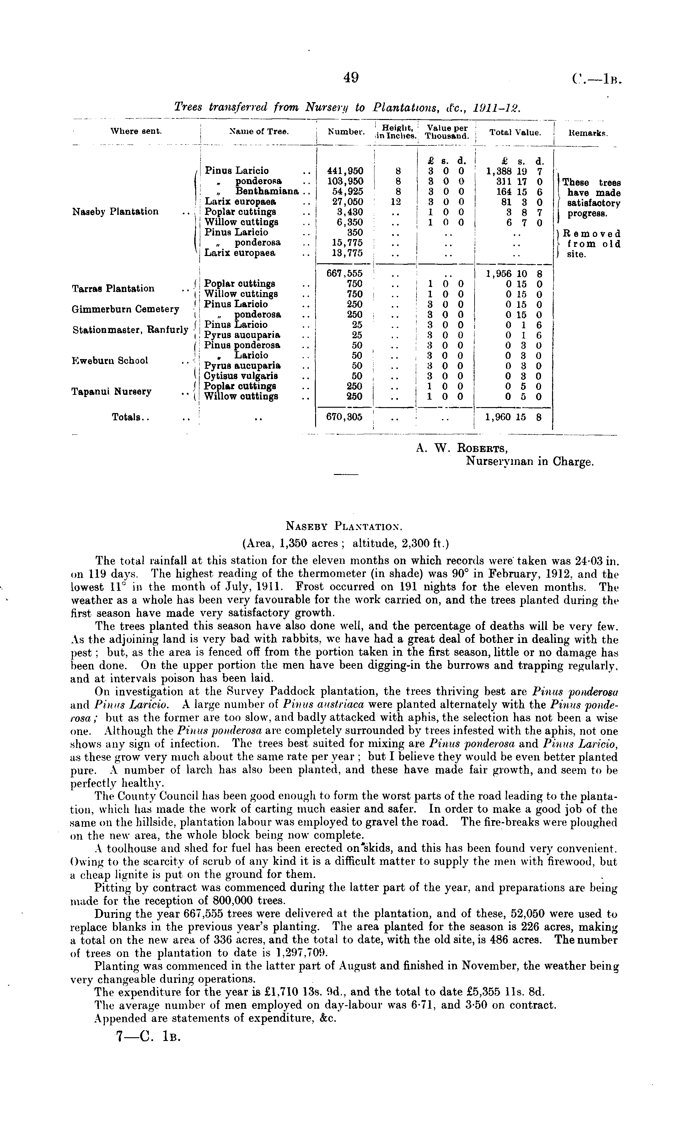 Naseby Plantation. (Area, 1,350 acres; altitude, 2,300ft.) The total rainfall at this station for the eleven months on which records were taken was 24-03 in. on 119 days. The highest reading of the thermometer (in shade) was 90° in February, 1912. and the lowest 11° in the month of July, 1911. Frost occurred on 191 nights for the eleven months. The weather as a whole has been very favourable for the work carried on, and the trees planted during the first season have made very satisfactory growth. The trees planted this season have also done well, and the percentage of deaths will be very few. As the adjoining land is very bad with rabbits, we have had a great deal of bother in dealing with the pest : but, as the area is fenced off from the portion taken in the first season, little or no damage has been done. On the upper portion the men have been digging-in the burrows and trapping regularly, and at intervals poison has been laid. On investigation at the Survey Paddock plantation, the trees thriving best are Pinus ponderosa and Pinus Laricio. A large number of Pimis austriaca were planted alternately with the Pinus ponderosa : bul as the former arc too slow, and badly attacked with aphis, the selection has not been a wise one. Although the Pinus ponderosa are completely surrounded by trees infested with the aphis, not one shows any sign of infection. The trees best suited for mixing are Pinus ponderosa and Pinus Laricio, as these grow very much about the same rate per year ; but I believe they would be even better planted pure. A number of larch has also been planted, and these have made fair growth, and seem to be perfectly healthy. The County Council has been good enough to form the worst parts of the road leading to the plantation, which has made the work of carting much easier and safer. In order to make a good job of the same on the hillside, plantation labour was employed to gravel the road. The fire-breaks were ploughed on the new area, the whole block being now complete. A toolhouse and shed for fuel has been erected on'skids, and this has been found very convenient. Owing to the scarcity of scrub of any kind it is a difficult matter to supply the men with firewood, but a cheap lignite is put on the ground for them. Pitting by contract was commenced during the latter part of the year, and preparations are being made for the reception of 800,000 trees. During the year 667,555 trees were delivered at the plantation, and of these, 52,050 were used to replace blanks in the previous year's planting. The area planted for the season is 226 acres, making a total on the new area of 336 acres, and the total to date, with the old site, is 486 acres. The number of trees on the plantation to date is 1,297,709. Planting was commenced in the latter part of August and finished in November, the weather beinsj very changeable during operations. The expenditure for the year is £1.710 13s. <ld.. and the total to date £5,355 11s. 8d. The average number of men employed on day-labour was 6-71, and 3-50 on contract. Appended are statements of expenditure, &c. 7—C. Iβ.