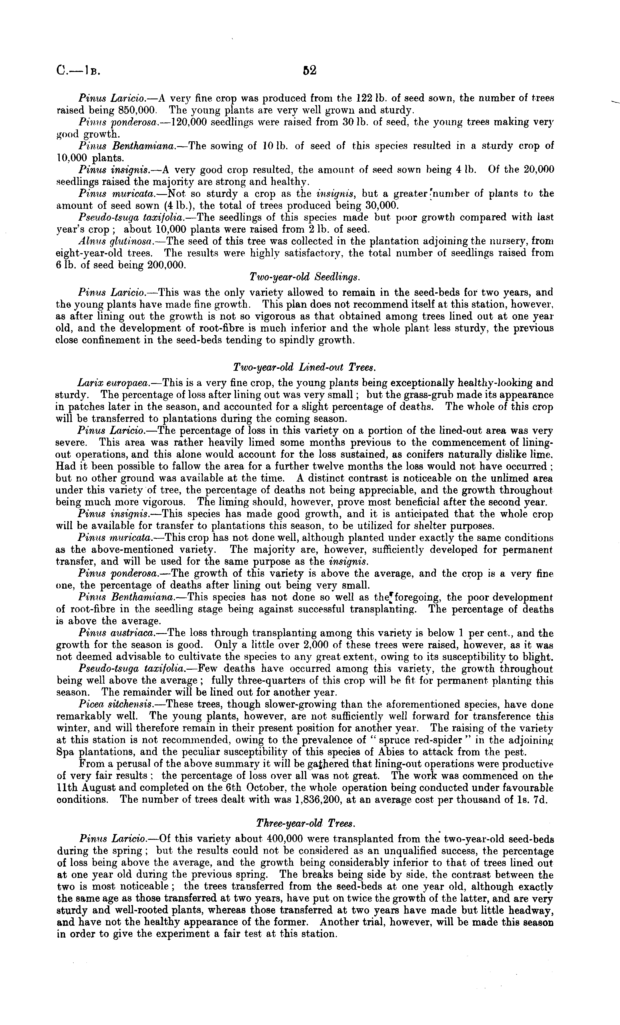 Pinus Laricio. —A very fine, crop was produced from the 122 lb. of seed sown, the number of trees raised being 850,000. The young plants are very well grown and sturdy. Finns ponderosa. —120,000 seedlings were raised from 301b. of seed, the young trees making very good growth. Pinus Benthamiana. —The sowing of 10 lb. of seed of this species resulted in a sturdy crop of 10.000 plants. Pinus insiguis. —A very good crop resulted, the amount of seed sown being 4 lb. Of the 20,000 seedlings raised the majority are strong and healthy. I'm us muricata. —Not so sturdy a crop as the insignis, but a greater'number of plants to the amount of seed sown (4 lb.), the total of trees produced being 30,000. Pseudo-tsuga taxifolia. —The seedlings of this species made but poor growth compared with last year's crop ; about 10,000 plants were raised from 2 lb. of seed. Alnus glutinosa. —The seed of this tree was collected in the plantation adjoining the nursery, from eight-year-old trees. The results were highly satisfactory, the total number of seedlings raised from 6 lb. of seed being 200,000. Two-year-old Seedlings. Pinus Laricio. —This was the only variety allowed to remain in the seed-beds for two years, and the young plants have made line growth. This plan does not recommend itself at this station, however, as after lining out the growth is not so vigorous as that obtained among trees lined out at one year old, and the development of root-fibre is much inferior and the whole plant less sturdy, the previous close confinement in the seed-beds tending to spindly growth. Two-year-old Lined-out Trees. Larix europaea. —This is a very fine crop, the young plants being exceptionally healthy-looking and sturdy. The percentage of loss after lining out was very small; but the grass-grub made its appearance in patches later in the season, and accounted for a slight percentage of deaths. The whole of this crop will be transferred to plantations during the coming season. Pinus Laricio. —The percentage of loss in this variety on a portion of the lined-out area was very severe. This area was rather heavily limed some months previous to the commencement of liningout operations, and this alone would account for the loss sustained, as conifers naturally dislike lime. Had it been possible to fallow the area for a further twelve months the loss would not have occurred ; but no other ground was available at the time. A distinct contrast is noticeable on the unlimed area under this variety of tree, the percentage of deaths not being appreciable, and the growth throughout being much more vigorous. The liming should, however, prove most beneficial after the second year. Pinus insignis. —This species has made good growth, and it is anticipated that the whole crop will be available for transfer to plantations this season, to be utilized for shelter purposes. Pinus muricata. —This crop has not done well, although planted under exactly the same conditions as the above-mentioned variety. The majority are, however, sufficiently developed for permanent transfer, and will be used for the same purpose as the insignis. Pinus ponderosa.—The growth of this variety is above the average, and the crop is a very fine one, the percentage of deaths after lining out being very small. Pinus Benthamiana. —This species has not done so well as the'foregoing, the poor development of root-fibre in the seedling stage being against successful transplanting. The percentage of deaths is above the average. Pinus austriaca. —The loss through transplanting among this variety is below 1 per cent., and the growth for the season is good. Only a little over 2,000 of these trees were raised, however, as it was not deemed advisable to cultivate the species to any great extent, owing to its susceptibility to blight. Pseudo-tsuga taxifolia. —Few deaths have occurred among this variety, the growth throughout being well above the average ; fully three-quarters of this crop will be fit for permanent planting this season. The remainder will be lined out for another year. Picea sitchensis. —These trees, though slower-growing than the aforementioned species, have done remarkably well. The young plants, however, are not sufficiently well forward for transference this winter, and will therefore remain in their present position for another year. The raising of the variety at this station is not recommended, owing to the prevalence of " spruce red-spider " in the adjoining Spa plantations, and the peculiar susceptibility of this species of Abies to attack from the pest. From a perusal of the above summary it will be gathered that lining-out operations were productive of very fair results ; the percentage of loss over all was not great. The work was commenced on the 11th August and completed on the 6th October, the whole operation being conducted under favourable conditions. The number of trees dealt with was 1,836,200, at an average cost per thousand of Is. 7d. Three-year-old Trees. Pinus Laricio. —Of this variety about 400,000 were transplanted from the two-year-old seed-beds during the spring ; but the results could not be considered as an unqualified success, the percentage of loss being above the average, and the growth being considerably inferior to that of trees lined out at one year old during the previous spring. The breaks being side by side, the contrast between the two is most noticeable ; the trees transferred from the seed-beds at one year old, although exactly the same age as those transferred at two years, have put on twice the growth of the latter, and are very sturdy and well-rooted plants, whereas those transferred at two years have made but little headway, and have not the healthy appearance of the former. Another trial, however, will be made this season in order to give the experiment a fair test at this station.