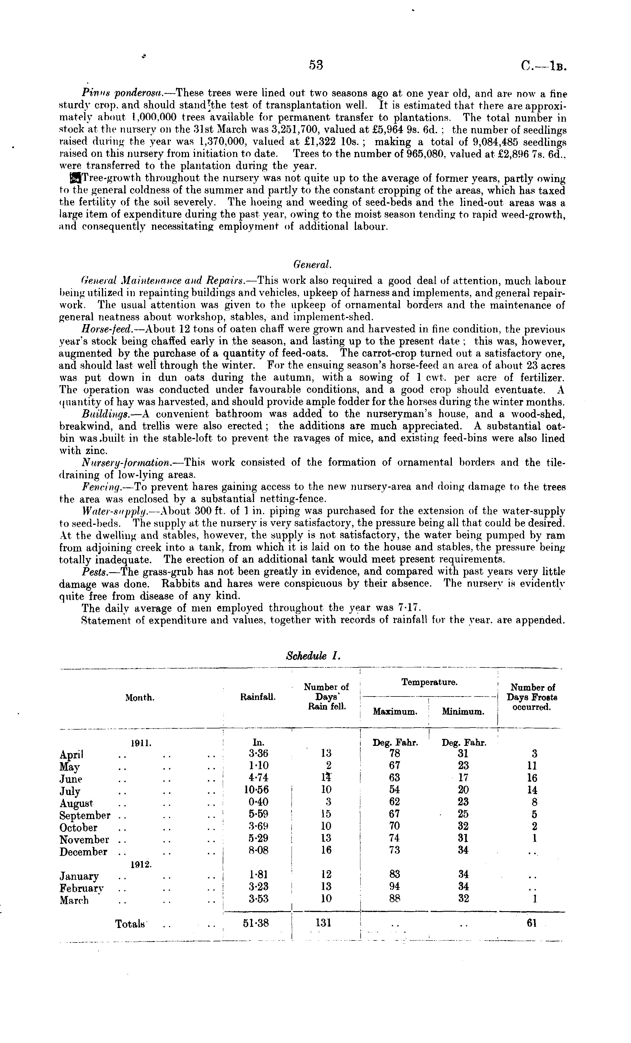 Pinus ponderosa. —These trees were lined out two seasons ago at one year old, and are now a tine sturdy crop, and should stand [the test of transplantation well. It is estimated that there are approximately about 1.000.000 trees available for permanent transfer to plantations. The total number in stock at the nursery on the 31st March was 3,251,700, valued at £5,964 9s. 6d. ; the number of seedlings raised during the year was 1.370.000, valued at £1,322 10s. ; making a total of 9,084,485 seedlings raised on this nursery from initiation to date. Trees to the number of 965.080. valued at £2,896 7s. (id.. were transferred to the plantation during the year. throughout the nursery was not quite up to the average of former years, partly owing to the general coldness of the summer and partly to the constant cropping of the areas, which has taxed the fertility of the soil severely. The hoeing and weeding of seed-beds and the lined-out areas was a large item of expenditure during the past year, owing to the moist season tending to rapid weed-growth, .mil consequently necessitating employment of additional labour. General. General Maintenance and Repairs. —This work also required a good deal of attention, much labour being utilized in repainting buildings and vehicles, upkeep of harness and implements, and general repairwork. The usual attention was given to the upkeep of ornamental borders and the maintenance of general neatness about workshop, stables, and implement-shed. Horse-feed. —About 12 tons of oaten chaff were grown and harvested in line condition, the previous year's stock being chaffed early in the season, and lasting up to the present date : this was. however, augmented by the purchase of a quantity of feed-oats. The carrot-crop turned out a satisfactory one, and should last well through the winter. For the ensuing season's horse-feed an area of about 23 acres was put down in dun oats during the autumn, with a sowing of 1 cwt. per acre of fertilizer. The operation was conducted under favourable conditions, and a good crop should eventuate. A quantity of hay was harvested, and should provide ample fodder for the horses during the winter months. Buildings. —A convenient bathroom was added to the nurseryman's house, and a wood-shed, breakwind, and trellis were also erected; the additions are much appreciated. A substantial oatbin was .built in the stable-loft to prevent the ravages of mice, and existing feed-bins were also lined with zinc. Nursery-formation. —This work consisted of the formation of ornamental borders and the tiledraining of low-lying an Penning. To prevent hares gaining access to the new nursery-area and doing damage to the trees the area was enclosed by a substantial netting-fence. Water-supply.- About 300 ft. of 1 in. piping was purchased for the extension of the water-supply to seed-beds. The supply at the nursery is very satisfactory, the pressure beine all that could be desired. At the dwelling and stables, however, the supply is not satisfactory, the water being pumped by ram from adjoining creek into a tank, from which it is laid on to the house and stables, the pressure being totally inadequate. The erection of an additional tank would meet present requirements. Pesls. —The grass-grub has not been greatly in evidence, and compared with past years very little damage was done. Rabbits and hares were conspicuous by their absence. The nursery is evidently quite free from disease of any kind. The daily average of men employed throughout the year was 7-17. Statement of expenditure and values, together with records of rainfall lor the year, are appended.