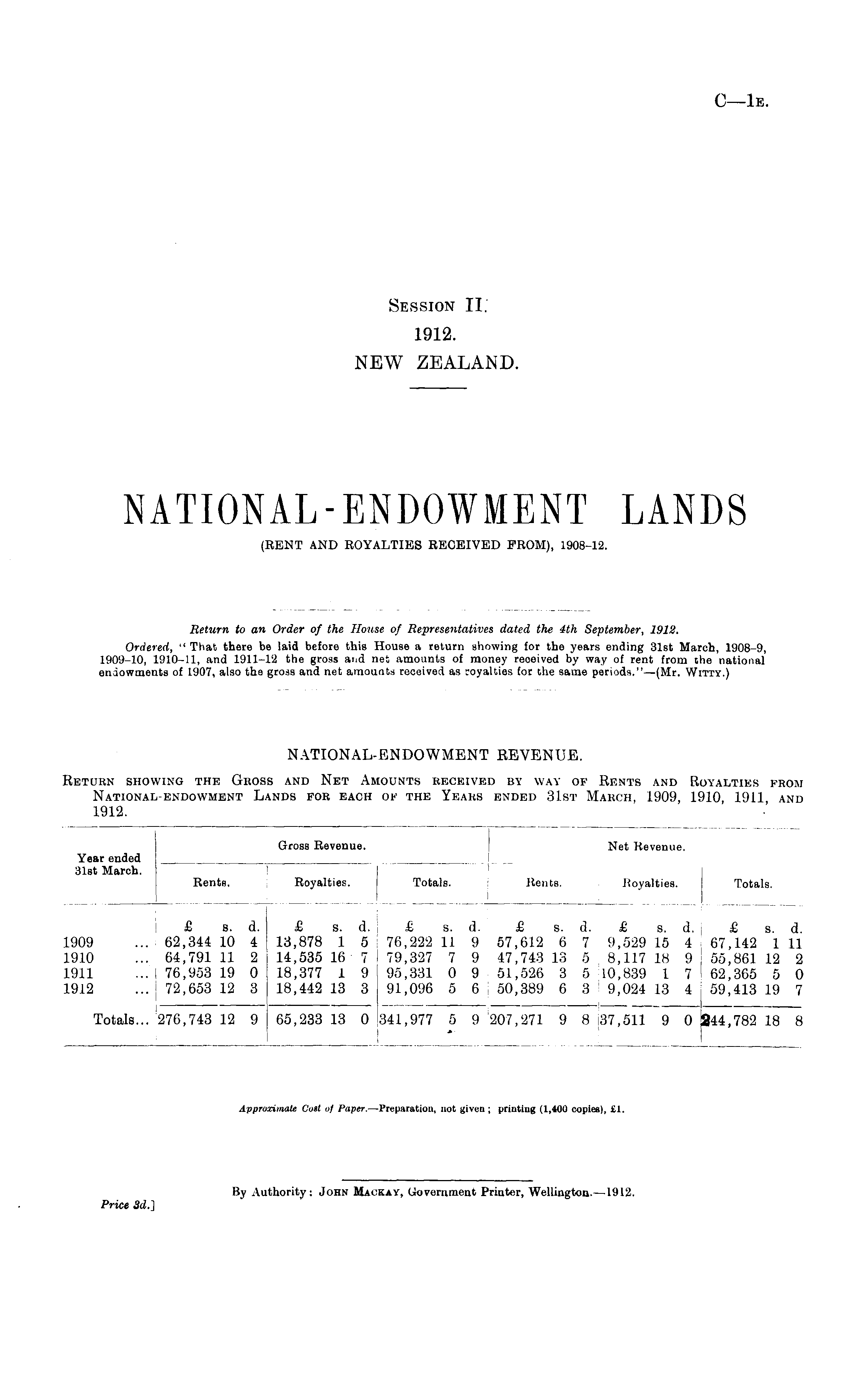 NATIONAL-ENDOWMENT REVENUE. Return showing the Gross and Net Amounts received by way of Rents and Royalties from National-endowment Lands for each of the Years ended 31st March, 1909, 1910, 1911, and 1912.