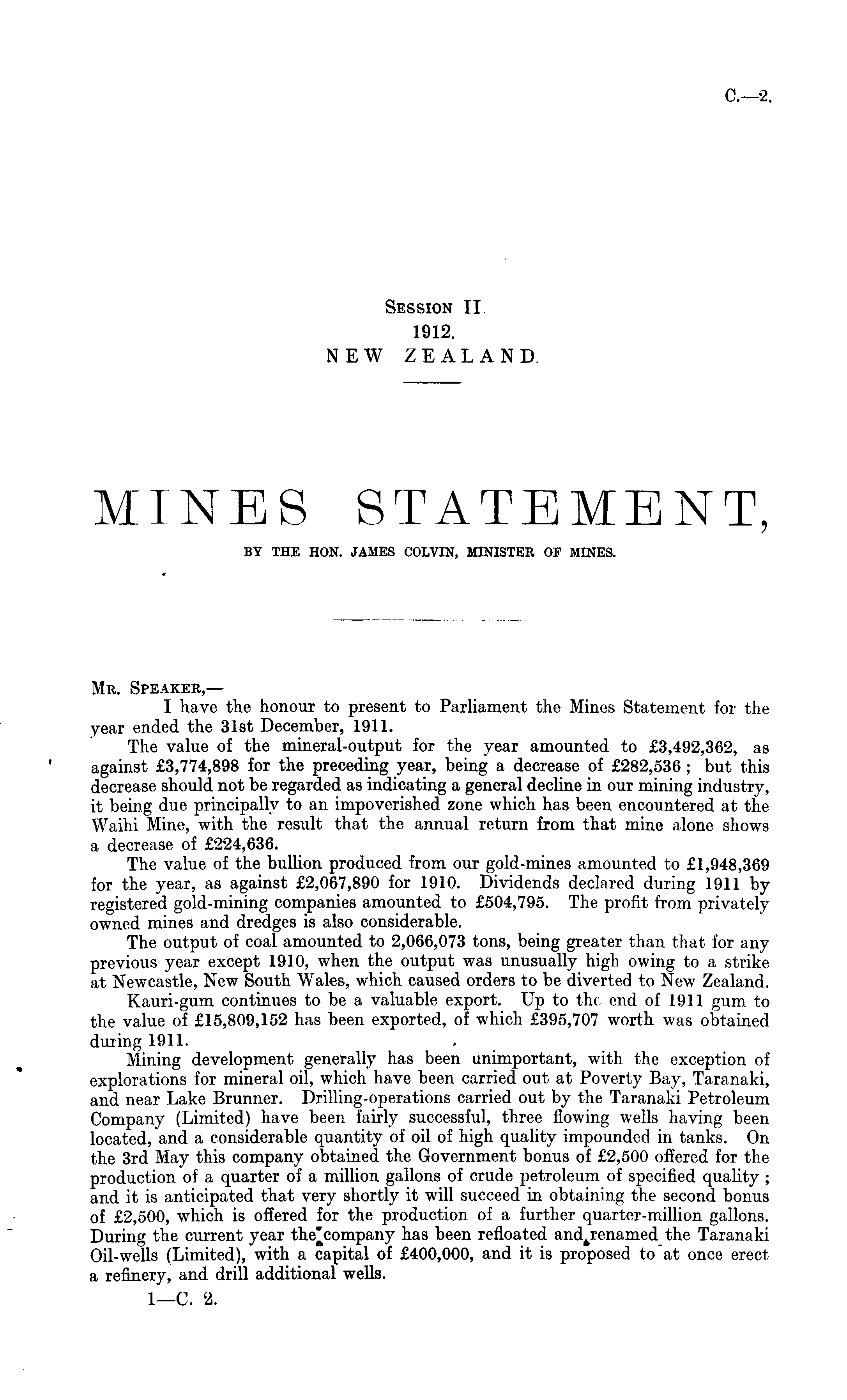 Mr. Speaker,— I have the honour to present to Parliament the Mines Statement for the year ended the 31st December, 1911. The value of the mineral-output for the year amounted to £3,492,362, as against £3,774,898 for the preceding year, being a decrease of £282,536 ; but this decrease should not be regarded as indicating a general decline in our mining industry, it being due principally to an impoverished zone which has been encountered at the Waihi Mine, with the result that the annual return from that mine alone shows a decrease of £224,636. The value of the bullion produced from our gold-mines amounted to £1,948,369 for the year, as against £2,067,890 for 1910. Dividends declared during 1911 by registered gold-mining companies amounted to £504,795. The profit from privately owned mines and dredges is also considerable. The output of coal amounted to 2,066,073 tons, being greater than that for any previous year except 1910, when the output was unusually high owing to a strike at Newcastle, New South Wales, which caused orders to be diverted to New Zealand. Kauri-gum continues to be a valuable export. Up to the end of 1911 gum to the value of £15,809,152 has been exported, of which £395,707 worth was obtained during 1911. Mining development generally has been unimportant, with the exception of explorations for mineral oil, which have been carried out at Poverty Bay, Taranaki, and near Lake Brunner. Drilling-operations carried out by the Taranaki Petroleum Company (Limited) have been fairly successful, three flowing wells having been located, and a considerable quantity of oil of high quality impounded in tanks. On the 3rd May this company obtained the Government bonus of £2,500 offered for the production of a quarter of a million gallons of crude petroleum of specified quality ; and it is anticipated that very shortly it will succeed in obtaining the second bonus of £2,500, which is offered for the production of a further quarter-million gallons. During the current year has been refloated the Taranaki Oil-wells (Limited), with a capital of £400,000, and it is proposed to at once erect a refinery, and drill additional wells.