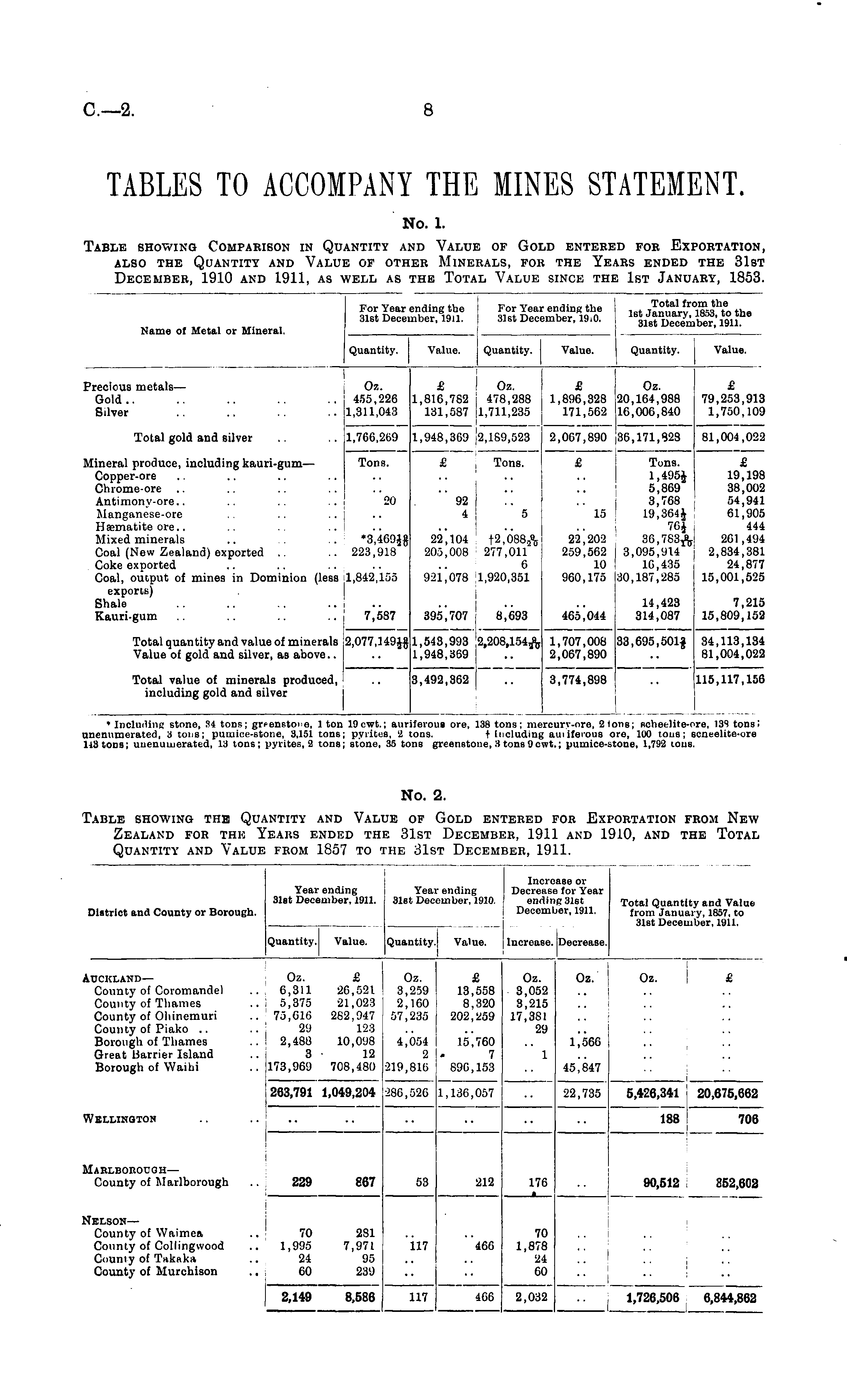 TABLES TO ACCOMPANY THE MINES STATEMENT. No. 1. Table showing Comparison in Quantity and Value of Gold entered for Exportation, also the Quantity and Value of other Minerals, for the Years ended the 31st December, 1910 and 1911, as well as the Total Value since the 1st January, 1853.