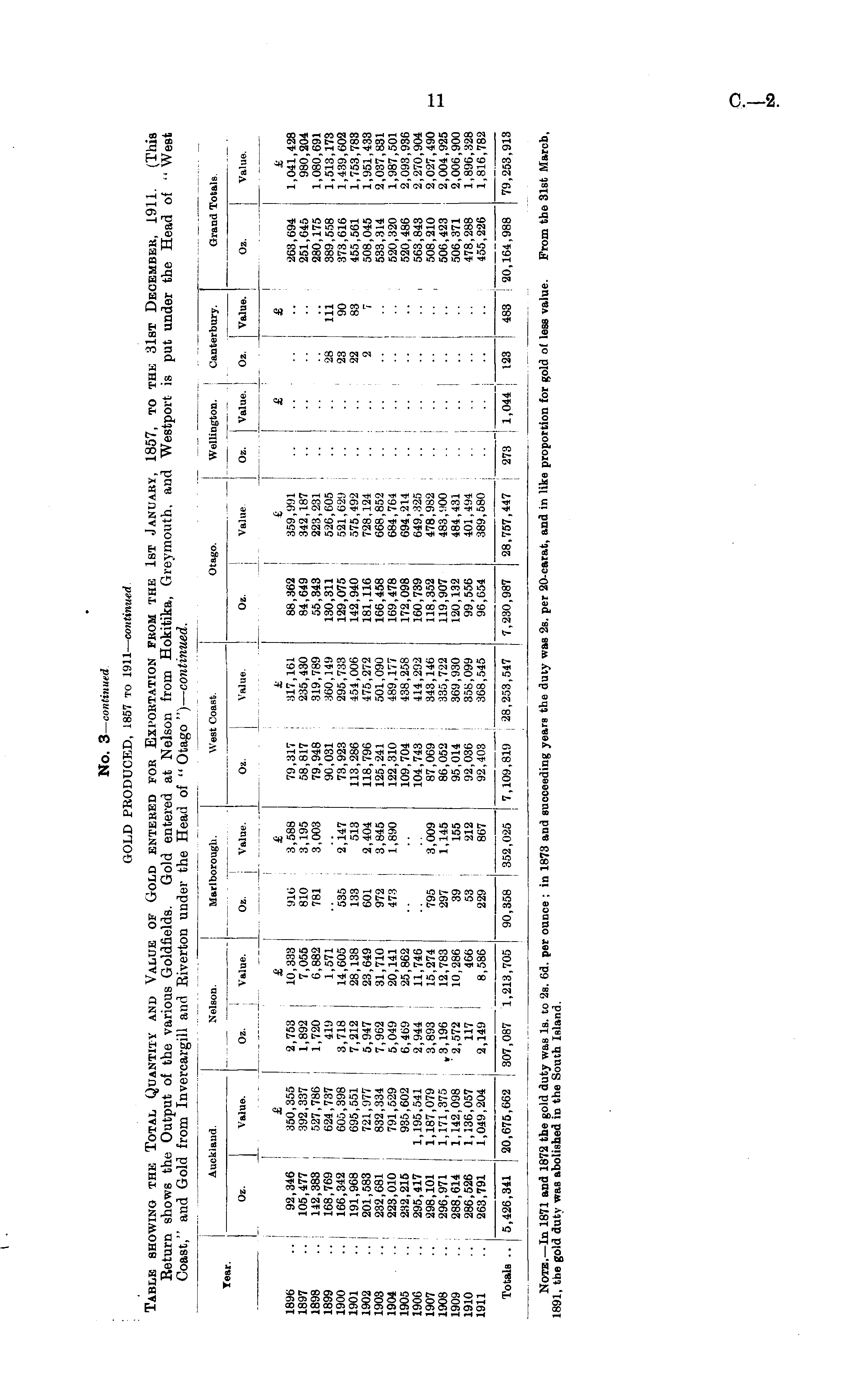 No. 3— continued. GOLD PRODUCED, 1857 to 1911—continued. Table showing the Total Quantity and Value of Gold entered for Exportation from the 1st January, 1857, to the 31st December, 1911. (This Return shows the Output of the various Goldfields. Gold entered at Nelson from Hokitika, Greymouth, and Westport is put under the Head of "West Coast," and Gold from Invercargill and Riverton under the Head of "Otago")— continued.