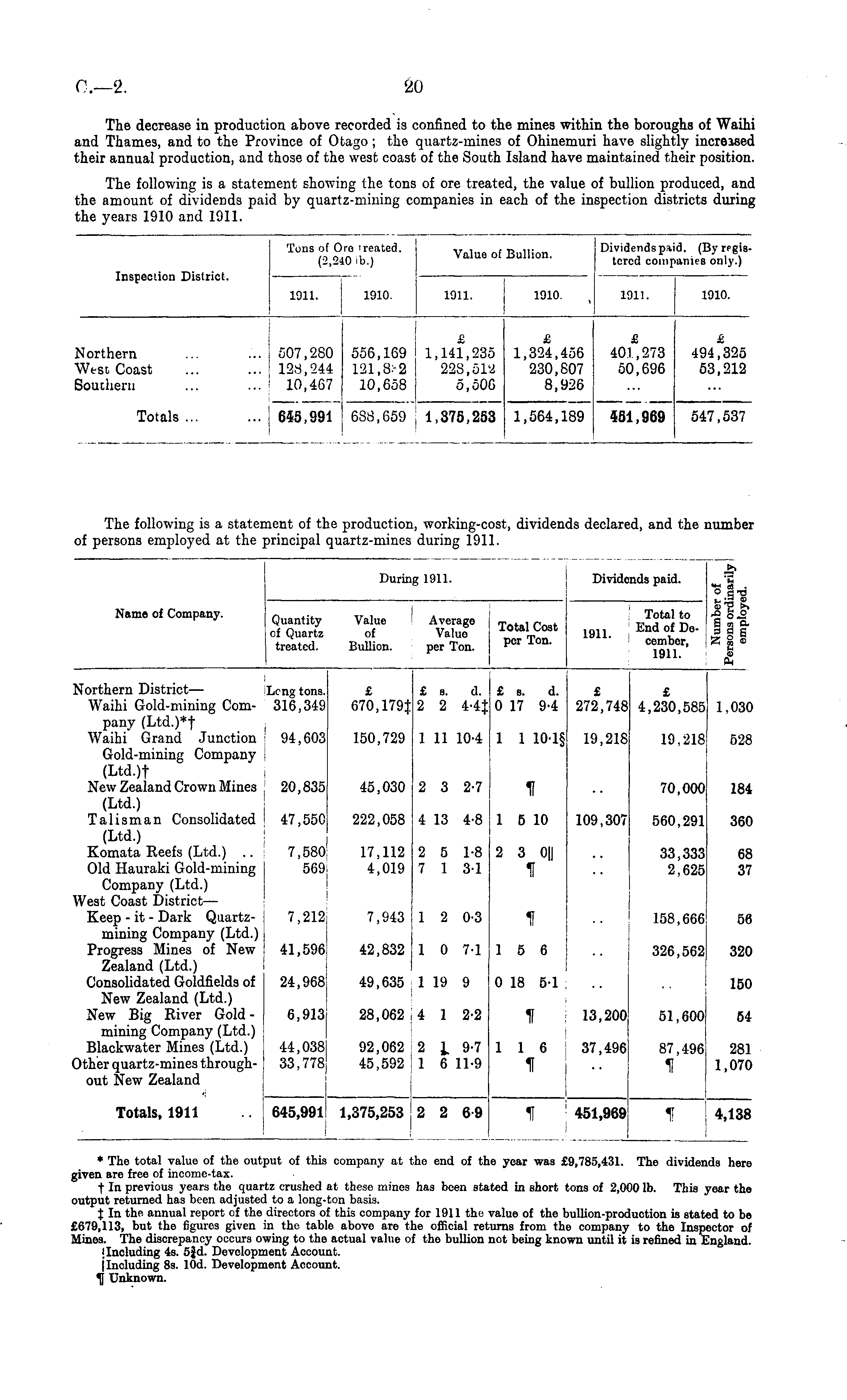 Inspection District. Tons of Oro ireated. (2,240 ib.) 1911. 1910. Value of Bullion. 1911. 1910. Dividends p .id. (Byrpgistercd companies only.) 1911. 1910. Jorthern Vest Coast louthern 507,280 128,244 10,467 £ 556,169 1,141,235 121,8.-2 228,512 10,658 5,506 £ 1,324,456 230,807 8,926 £ 40.1,273 50,696 £ 494,325 53,212 Totals ... 645,991 6S8.659 j 1,375,253 1,564,189 451,969 547,537