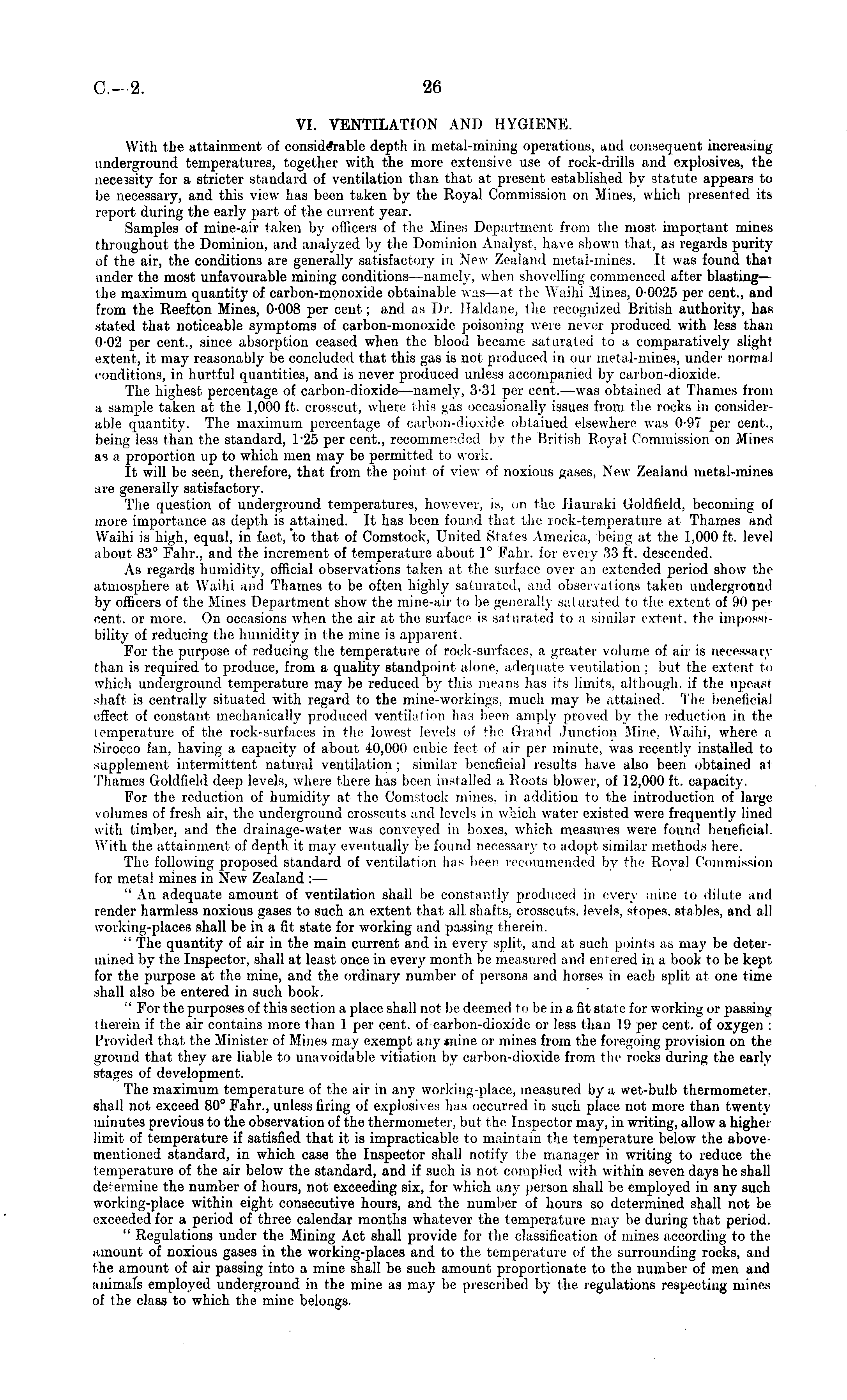 VI. VENTILATION AND HYGIENE. With the attainment of considerable depth in metal-mining operations, and consequent increasing underground temperatures, together with the more extensive use of rock-drills and explosives, the necessity for a stricter standard of ventilation than that at present established by statute appears to be necessary, and this view has been taken by the Royal Commission i which presented its report during the early part of the current year. Samples of mine-air taken by officers of the Mines Dβ] bhe mo anl mines throughout the Dominion, and analyzed by the Dominion Analyst. purity of the air, the conditions are generally satisfactory in Nγ ■■ ;ines. It was found that under the most unfavourable mining conditions —namely, when shovelling commenced after blasting— the maximum quantity of carbon-monoxide obtainabi- the Waihi Mines, 00025 per cent., and from the Eeefton Mines, 0-008 per cent; and as Dr. c recognized British authority, has stated that noticeable symptoms of carbon-monoxide poisoning were never produced with less than 0-02 per cent., since absorption ceased when the blood became saturai imj lively slight extent, it may reasonably be concluded that this gas is nol i in our metal-mines, under normal conditions, in hurtful quantities, and is never p; accompanied by carbon-dioxide. The highest percentage of carbon-dioxide—namely, 3-31 per Led at Thames from a sample taken at the 1,000 ft. crosscut, where this gas oc< lies from the rocks in considerable quantity. The maximum percentage of cai here was 0-97 per cent., being less than the standard, T25 per cent., recommended by the British Royal Commission on Mines aa a proportion up to which men may be permitted to work. It will be seen, therefore, that from the point of view of m> s, New Zealand metal-mines generally satisfactory. The question of underground temperatures, however, is, on the Hauraki Goldfield, becoming ol more importance as depth is attained. It has been found that the rock-temperature at Thames and Waihi is high, equal, in fact, "to that of Comstock, United States America, being at the 1,000 ft. level about 83° Fahr., and the increment of temperature about 1° Fahr. for every 33 ft. descended. As regards humidity, official observations taken at the surface over an extended period show the atmosphere at Waihi and Thames to be often highh ;(ions taken underground by officers of the Mines Department show the mi;: o the extent of 90 per cent, or more. On occasions when the air at the surf at, flu' impoesi bility of reducing the humidity in the mine is appan For the purpose of reducing the temperature of rock-surface c of air is necessary bhan is required to produce, from a quality stan<: ilation : but the ex underground temperature maybe reduced ;h, if the upcast shaft is centrally situated with regard to the mil much ma} ied. i he beneficial effect of constant mechanically produced ventilation reduction in th<temperature of the rock-surfaces in the lowest level Waihi, where a Sirocco fan, having a capacity of about 40,000 cubic fee mute, was recently installed to supplement intermittent natural ventilation; similar benefici Iso been obtained a 1 Thames Goldfield deep levels, where there has been installed a . of 12.000 ft. capacity. For the reduction of humidity at the Comstock ; Jon to the introduction of large volumes of fresh air, the underground crosscuts and le c existed were frequently lined with timber, and the drainage-water was conveyed in boxes, which measures were found beneficial. With the attainment of depth it may eventually be found nee; adopt similar methods here. The following proposed standard of ventilation has been recommended by the Royal Commission for metal mines in New Zealand : — " An adequate amount of ventilation shall be con dilute and render harmless noxious gases to such an extent that all shafts, crosscuts, levels, etopes, stables, and all working-places shall be in a fit state for working and pa: " The quantity of air in the main current and in c d at such may be determined by the Inspector, shall at least once in ever)- m<; ] in a book to be kept for the purpose at the mine, and the ordinary number of | i< h split a< one I inie shall also be entered in such book. " For the purposes of this section a place shall not be deer i.-jng or passing therein if the air contains more than 1 per cent, of carbon- than 19 per cent, of oxygen : Provided that the Minister of Mitics may exempt anyeiine or mines from the f< provision on the ground that they are liable to unavoidable vitiation by carbon-dioxide from the rocks during the early s of development. The maximum temperature of the air in any working-place, measured by a wet-bulb thermometer, shall not exceed 80° Fahr., unless firing of explosives has occurred in such place not more than twenty minutes previous to the observation of the thermometer, but the Inspector may, in writing, allow a higher limit of temperature if satisfied that it is impracticable to maintain the temperature below the abovementioned standard, in which case the Inspector shall notify the manager in writing to reduce the temperature of the air below the standard, and if such is not complied with within seven days he shall determine the number of hours, not exceeding six, for whicl son shall be employed in any such working-place within eight consecutive hours, and the number of hours so determined shall not be exceeded for a period of three calendar months whatever the temperature may be during that period. " Regulations under the Mining Act shall provide for the classification of mines according to the amount of noxious gases in the working-places and to the temperature of the surrounding rocks, and the amount of air passing into a mine shall be such amount proportionate to the number of men and animals employed underground in the mine as may be prescribed by the regulations respecting mines of the class to which the mine belongs