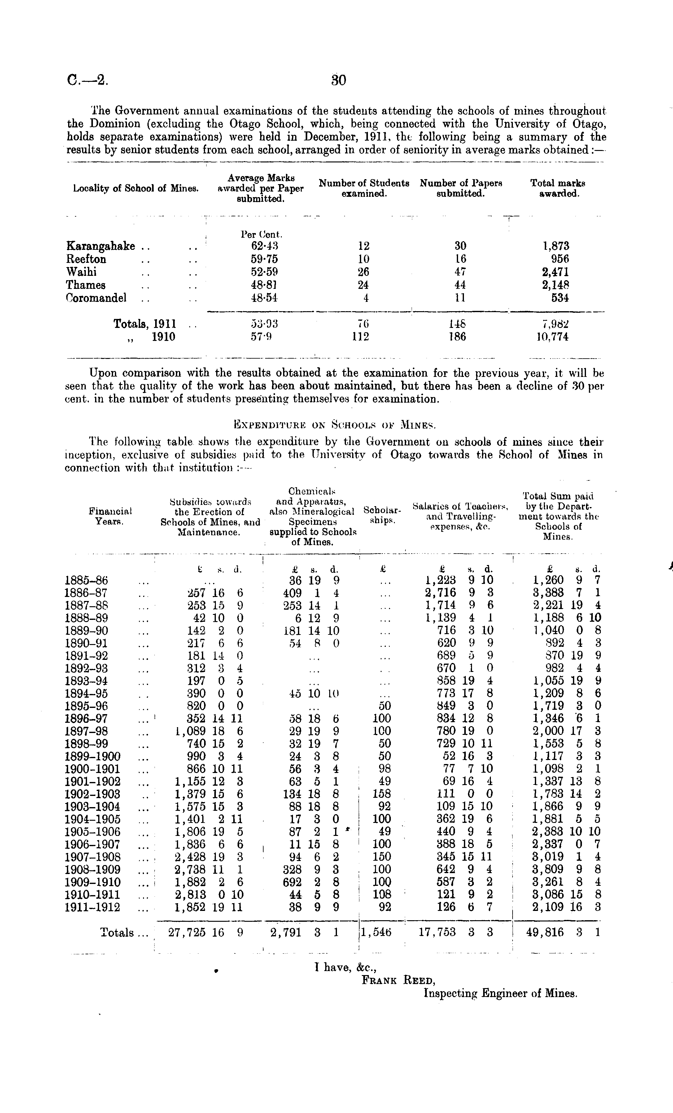 Upon comparison with the results obtained at the examination for the previous year, it will be seen that the quality of the work has been about maintained, but there has been a decline of 30 per cent, in the number of students presenting themselves for examination. Ex] - of Minks. Thr following table shows the expenditure by the Government on schools of mines since then , inception, exclusive of subsidies paid to the University of Otago towards the School of Mines in connection with that institution :