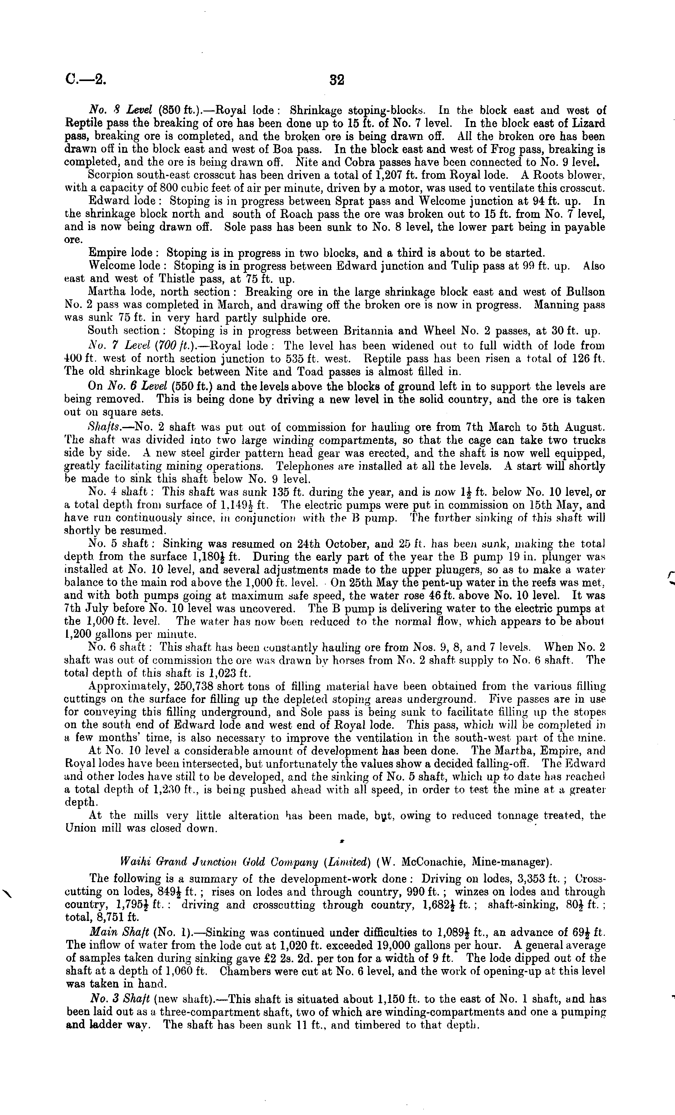 No. 8 Level (850 ft.).—Royal lode : Shrinkage stoping-blocks. In the block east and west of Reptile pass the breaking of ore has been done up to 15 ft. of No. 7 level. In the block east of Lizard pass, breaking ore is completed, and the broken ore is being drawn off. All the broken ore has been drawn off in tho block east and west of Boa pass. In the block east and west of Frog pass, breaking is completed, and the ore is being drawn off. Nite and Cobra passes have been connected to No. 9 level. Scorpion south-east crosscut has been driven a total of 1,207 ft. from Royal lode. A Roots blower, with a capacity of 800 cubic feet of air per minute, driven by a motor, was used to ventilate this crosscut. Edward lode : Stoping is in progress between Sprat pass and Welcome junction at 94 ft. up. In the shrinkage block north and south of Roach pass the ore was broken out to 15 ft. from No. 7 level, and is now being drawn off. Sole pass has been sunk to No. 8 level, the lower part being in payable ore. Empire lode: Stoping is in progress in two blocks, and a third is about to be started. Welcome lode : Stoping is in progress between Edward junction and Tulip pass at 99 ft. up. Also i and west of Thistle pass, at 75 ft. up. -Martha lode, north section : Breaking ore in the large shrinkage block east and west of Bullson No. 2 pass was completed in March, and drawing off the broken ore is now in progress. Manning pass was sunk 75 ft. in very hard partly sulphide ore. South section : Stoping is in progress between Britannia and Wheel No. 2 passes, at 30 ft. up. No. 7 Level (700ft.). —Royal lode: The level has been widened out to full width of lode from too it. west of north section junction to 535 ft. west. Reptile pass has been risen a total of 126 ft. The old shrinkage block between Nite and Toad passes is almost filled in. On No. 6 Level (550 ft.) and the levels above the blocks of ground left in to support the levels are being removed. This is being done by driving a new level in the solid country, and the ore is taken out on square sets. Shafts. —No. 2 shaft was put out of commission for hauling ore from 7th March to 5th August. The shaft was divided into two large winding compartments, so that the cage can take two trucks side by side. A new steel girder pattern head gear was erected, and the shaft is now well equipped, greatly facilitating mining operations. Telephones are installed at all the levels. A start will shortly be made to sink this shaft below No. 9 level. No. 4 shaft: This shaft was sunk 135 ft. during the year, and is now 1$ ft. below No. 10 level, or a total depth from surface of 1.149J ft. The electric pumps were put in commission on 15th May, and have run continuously since, in conjunct inn with the B pump. The further sinking of this shaft will shortly be resumed. No. 5 shaft: Sinking was resumed on 24th October, and 2o fi. I sunk, making the total depth from the surface 1,180$ ft. During the early part of the year the B pump 19 in. plunger was installed at No. 10 level, and several adjustments made to the upper pluugers, so as to make a water balance to the main rod above the 1,000 ft. level. On 25th May the pent-up water in the reefs was met, and with both pumps going at maximum safe speed, the water rose 46 ft. above No. 10 level. It was 7th July before No. 10 level was uncovered. The B pump is delivering water to the electric pumps at the 1,000 ft. level. The water has now been reduced to the normal flow, which appears to be about 1,200 gallons per minute. No. 6 shaft: This shaft lias been constantly hauling ore from Nos. 9, 8, and 7 levels. When No. 2 shaft was out of commission lit- drawn by horses from No. 2 shaft supply to No. 6 shaft. The total depth of this shaft is 1,023 ft. Api ly, 250,738 short tons of filling material have been obtained from the various filling cuttings on the surface for filling up the depleted stoping areas underground. Five passes are in use for conveying this filling underground, and Sole pass is being sunk to facilitate filling up the stopes on the south end of Edward lode and west end of Royal lode. This pass, which will ije complel ;i few months' time, is also necessary to improve the ventilation in the south-west part of the mine. At No. 10 level a considerable amount of development has been done. The Mtirtha, Empin , Royal lodes have been intersected, but unfortunately the values show a decided falling-off. The Edward and other lodes have still to be developed, and the sinking of No. 5 shaft, which up to (lute has reached a total depth of 1,230 ft., is being pushed ahead with all speed, in order to test the mine at a greater depth. At the mills very little alteration has been made, but, owing to reduced tonnage treated, the Union mill was closed down. Waihi Grand Junction Gold Company (Limited) (W. McConachie, Mine-manager). The following is a summary of the development-work done : Driving on lodes, 3,353 ft. ; Crosscutting on lodes, 849$ ft. ; rises on lodes and through country, 990 ft. ; winzes on lodes and through country, 1,795$ ft. : driving and crosscutting through country, 1,682$ ft. : shaft-sinking, 80J ft. : total, 8,751 ft. Main Shaft (No. 1). —Sinking was continued under difficulties to 1,089$ ft., an advance of 69$ ft. The inflow of water from the lode cut at 1,020 ft. exceeded 19,000 gallons per hour. A general average of samples taken during sinking gave £2 2s. 2d. per ton for a width of 9 ft. The lode dipped out of the shaft at a depth of 1,060 ft. Chambers were cut at No. 6 level, and the work of opening-up at this level was taken in hand. No. 3 Shaft (new shaft). —This shaft is situated about 1,150 ft. to the east of No. 1 shaft, and has been laid out as a three-compartment shaft, two of which are winding-compartments and one a pumping and ladder way. The shaft has been sunk 11 ft., and timbered to that depth.