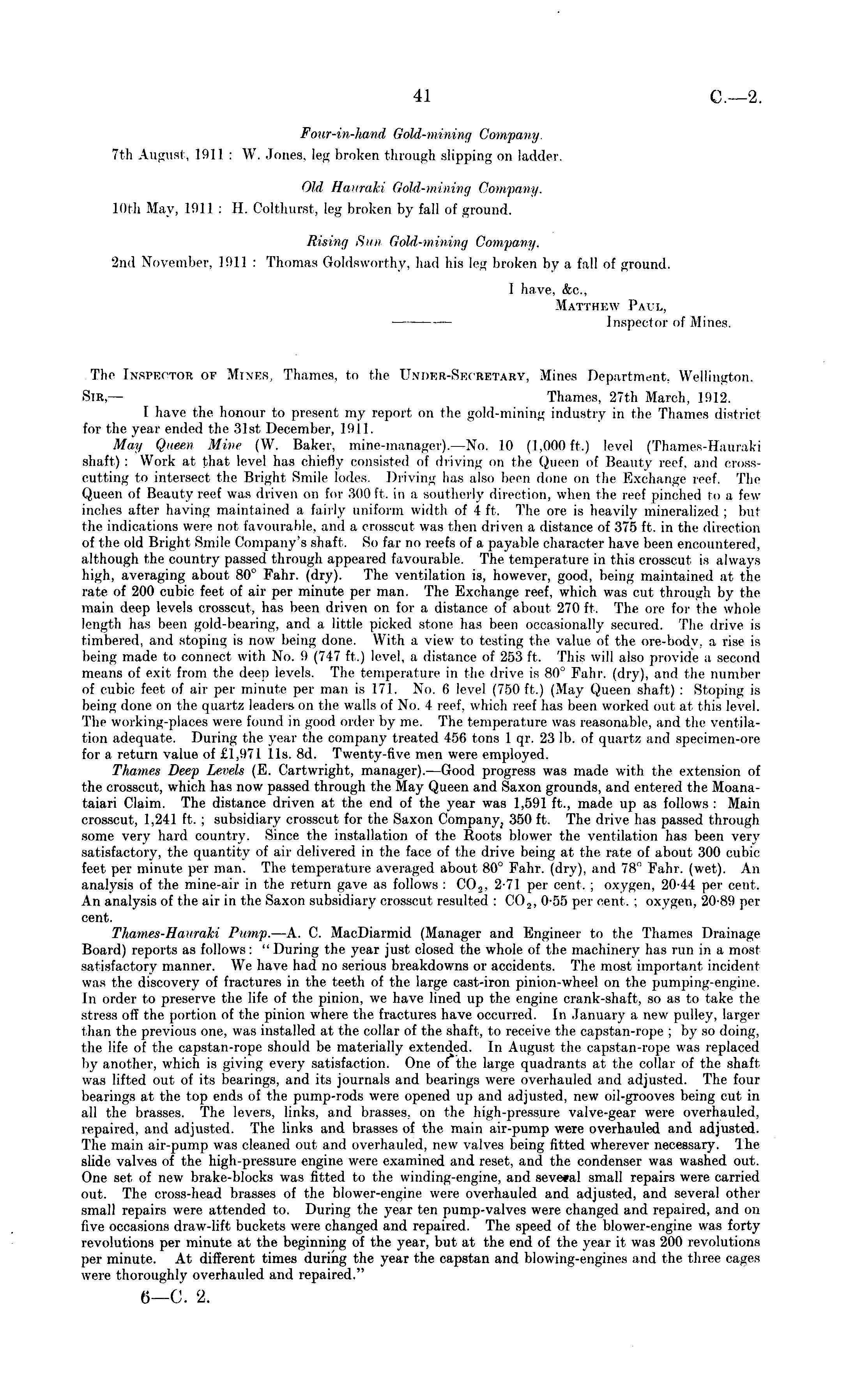 Four-in-hand Gold-mining Company. 7th August, 19] I : W. Jones, leg broken through slipping on ladder. Old Hauraki Gold-mining Company. 10th May, L911 : H. Colthurst, leg broken by fall of ground. Rising Sun Gold-mining Company. 2nd November, 1911 : Thomas Goldsworthy, had his teg broken by a fall of ground. I have, &c, Matthew Paul, Inspector of Mines.