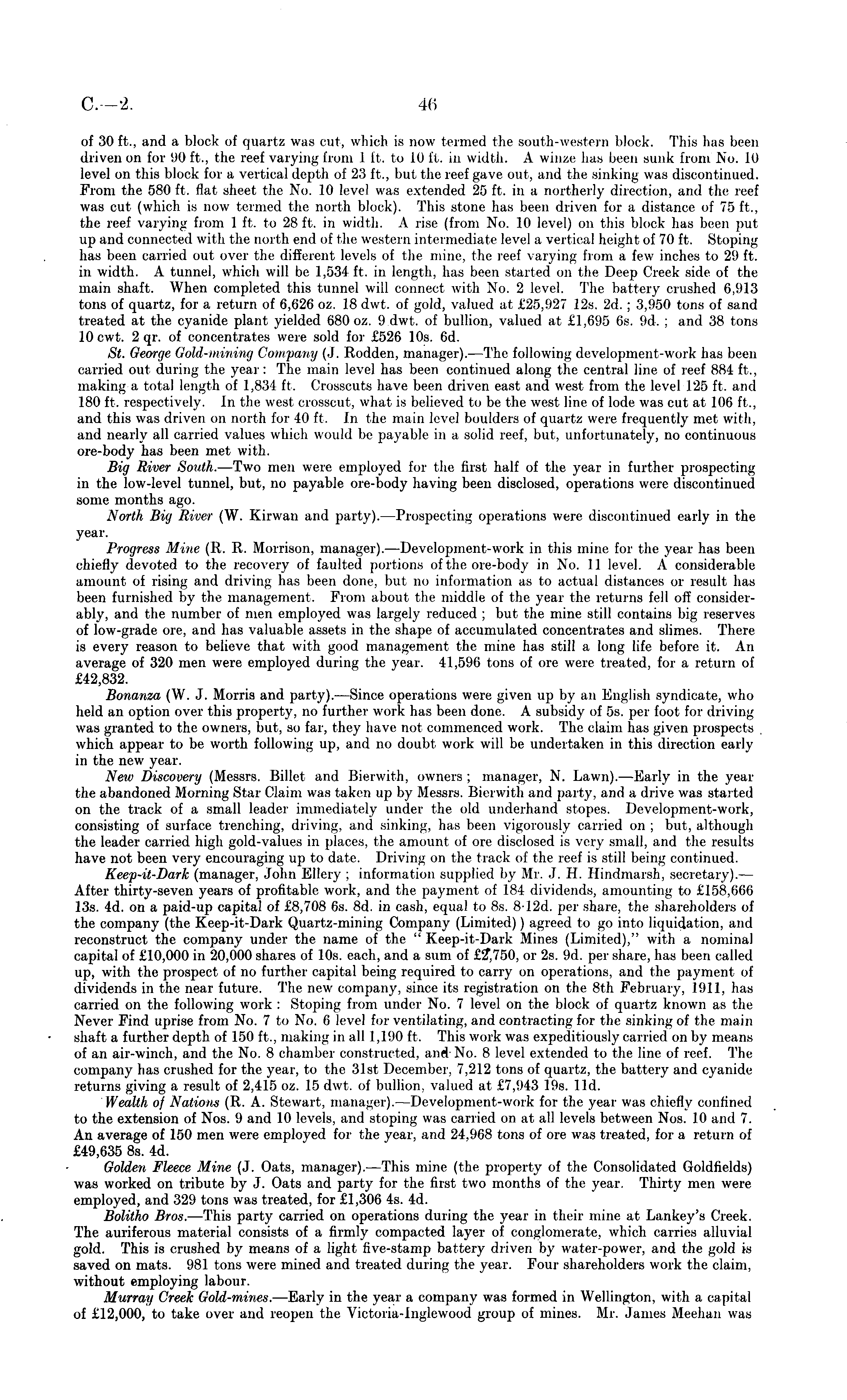 of 30 ft., and a block of quartz was cut, which is now termed the south-western block. This has been driven on for 90 ft., the reef varying from 1 It. to 10 ft. in width. A winze has been .sunk from No. 10 level on this block for a vertical depth of 23 ft., but the reef gave out, and the sinking was discontinued. From the 580 ft. flat sheet the No. 10 level was extended 25 ft. in a northerly direction, and the reef was cut (which is imu termed the north block). This stone has been driven for a distance of 75 ft., the reef varying from 1 ft. to 28 ft. in width. A rise (from No. 10 level) on this block lias been put up and connected with the north end of the western intermediate level a vertical heighi of 70 ft. Stoping has been carried out over the different levels of the mine, the reef varying from a lew inches to '2U ft. in width. A tunnel, which will be 1,534 ft. in length, has been started on the Deep Creek side of the main shaft. When completed this tunnel will connect with No. 2 level. The battery crushed 6,913 tons of quartz, for a return of 6,626 oz. 18 dv, t. oi gold, valued at £25,927 12s. 2d.; 3,950 tons of sand treated at the cyanide plant yielded 680 oz. 9 dwt. of bullion, valued at £1,695 6s. 9d. ; and 38 tons 10 cwt. 2 qr. of concentrates were sold for £526 10s. 6d. St. George Gold-mining Com pant/ (J. Rodden, manager).—The follow ing development-work has been carried out during the year: The main level has been continued along the central line of reef 881 ft.. making a total length of 1,834 ft. Crosscuts have been driven east and west from the level 125 ft. and 180 ft. respectively. In the west crosscut, what is believed to be the west line of lode was cut at 106 ft., and this was driven on north for 40 ft. In the main level boulders of quartz were frequently met wil h. and nearly all carried values which would be payable in a solid reef, but, unfortunately, no continuous ore-body has been met with. Big River South. —Two men were employed for tin; first half of the year in further prospecting in the low-level tunnel, but, no payable ore-body having been disclosed, operations were discontinued some months ago. North Big River (W. Kirwan and party).—Prospecting operations were discontinued early in the year. Progress Mine (R. R. Morrison, manager). —Development-work in this mine for the year has been chicHy devoted to the recovery of faulted portions of the ore-body in No. 11 level. A considerable amount of rising and driving has been done, but no information as to actual distances or result has been furnished by the management. From about the middle of the year the returns fell off considerably, and the number of men employed was largely reduced ; but the mine still contains big reserves of low-grade ore, and has valuable assets in the shape of accumulated concentrates and slimes. There is every reason to believe that with good management the mine has still a long life before it. An average of 320 men were employed during the year. 41,596 tons of ore were treated, for a return of £42,832. Bonanza (W. J. Morris and party). —Since operations were given up by an English syndicate, who held an option over this property, no further work has been done. A subsidy of ss. per foot for driving was granted to the owners, but. so far, they have not commenced work. The claim has given prospects which appear to be worth following up, and no doubt work will be undertaken in this direction early in the new year. New Discovery (Messrs. Billet and Bierwith, owners ; manager, N. Lawn). —Early in the year the abandoned Morning Star Claim was taken up by Messrs. Bierwith and party, and a drive was started on the track of a small leader immediately under the old underhand stopes. Development-work, consisting of surface trenching, driving, and sinking, has been vigorously carried on ; but, although the leader carried high gold-values in places, the amount of ore disclosed is very small, and the results have not been very encouraging up to date. Driving on the track of the reef is still being continued. Keep-it-Dark (manager, John Ellery ; information supplied by Mr. J. H. Hindmarsh, secretary). — After thirty-seven years of profitable work, and the payment of 184 dividends, amounting to £158,666 13s. 4d. on a paid-up capital of £8,708 6s. Bd. in cash, equal to Bs. 8-12 d. per share, the shareholders of the company (the Keep-it-Dark Quartz-mining Company (Limited)) agreed to go into liquidation, and reconstruct the company under the name of the " Keep-it-Dark Mines (Limited)," with a nominal capital of £10,000 in 20,000 shares of 10s. each, and a sum of £2*,750, or 2s. 9d. per share, has been called up, with the prospect of no further capital being required to carry on operations, and the payment of dividends in the near future. The new company, since its registration on the Bth February, 1911, has carried on the following work : Stoping from under No. 7 level on the block of quartz known as the Never Find uprise from No. 7 to No. 6 level for ventilating, and con! raci ing for the sinking of the main shaft a further depth of 150 ft., making in all I.I 'JO ft. This work was expeditiously carried on by means of an air-winch, and the No. 8 chamber constructed, and-No. 8 level extended to the line of reef. The company has crushed for the year, to the 31st December, 7,212 tons of quartz, the battery and cyanide returns giving a result of 2,415 oz. 15 dwt. of bullion, valued at £7,943 19s. lid. Wealth of Nations (R. A. Stewart, manager).—Development-work for the year was chiefly confined to the extension of Nos. 9 and 10 levels, and stoping was carried on at all levels between Nos. 10 and 7. An average of 150 men were employed for the year, and 24.968 tons of ore was treated, for a return of £49,635 Bs. 4d. Golden Fleece Mine (J. Oats, manager).—This mine (the property of the Consolidated Goldfields) was worked on tribute by J. Oats and party for the first two months of the y