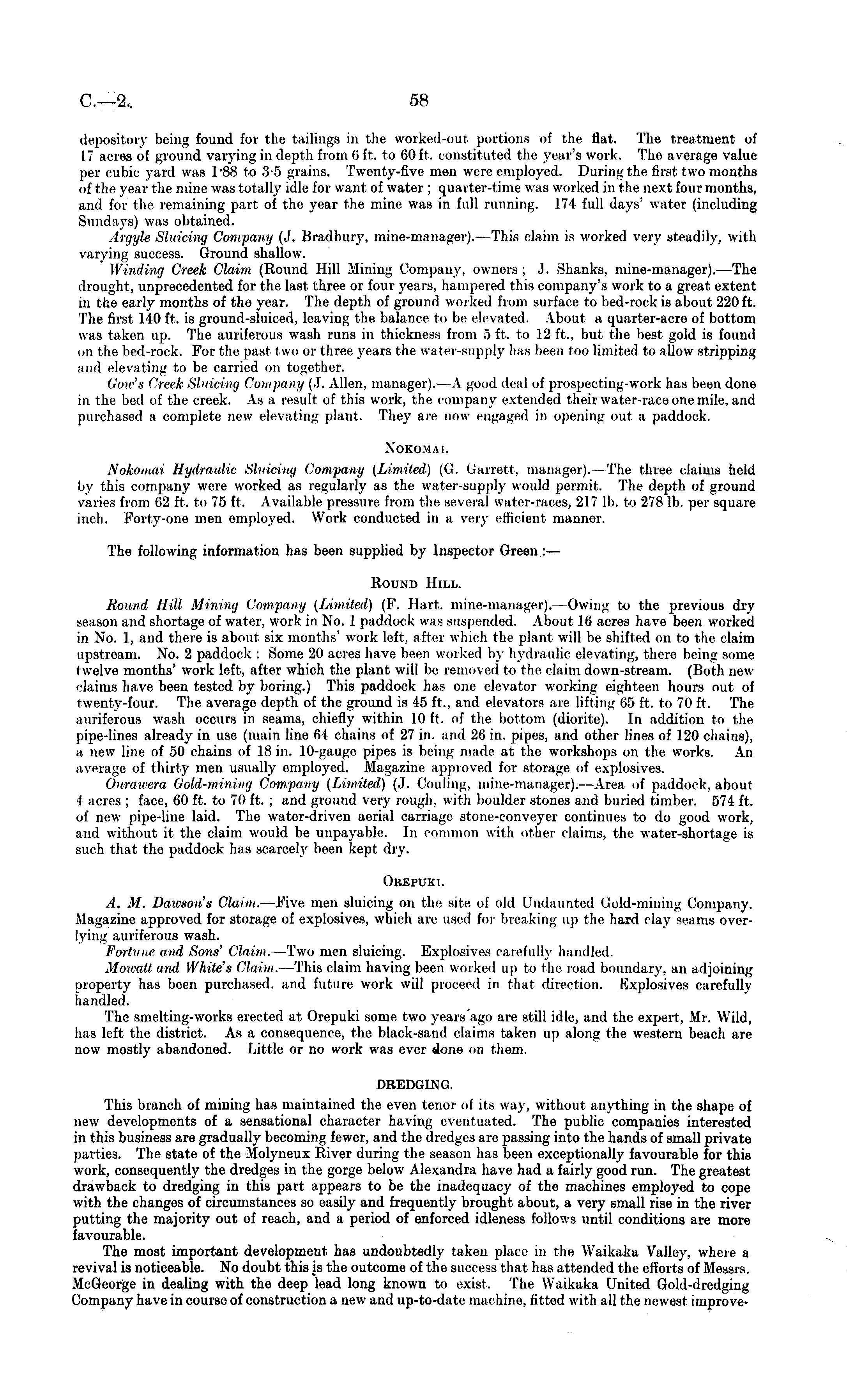 depository being found for the tailings in the worked-out portions of the flat. The treatment of 17 acres of ground varying in depth from 6 ft. to 60 ft. constituted the year's work. Tho average value per cubic yard was l - 88 to 3-5 grains. Twenty-five men were emj>loyed. During the first two months (if the year the mine was totally idle for want of water ; quarter-time was worked in the next four months, and for the remaining part of the year the mine was in full running. 174 full days' water (including Sundays) was obtained. Arqyle Sluicing Company (J. Bradbury, mine-manager).—This claim is worked very steadily, with varying success. Ground shallow. Winding Creek Claim (Round Hill Mining Company, owners: J. Shanks, mine-manager). —The drought, unprecedented for the last three or four years, hampered this company's work to a great extent in tho early months of the year. The depth of ground worked from surface to bed-rock is about 220 ft. The first 140 ft. is ground-sluiced, leaving the balance to be elevated. About a quarter-acre of bottom was taken up. The auriferous wash runs in thickness from 5 ft. to 12 ft., but the best gold is found on the bed-rock. For the. past two or three years the water-supply has been too limited to allow stripping inn! elevating to be carried on together. Qow's Creek Sluicing Company (•). Allen, manager). —A good deal of prospecting-work has been done in the bed of the creek. As a result of this work, the company extended their water-race one mile, and purchased a complete new elevating plant. They are now engaged in opening out a paddock. NOKOMAI. Nolioitnu Hydraulic Sluicing Company (Limited) (G. Garrett, manager). The three claims held by this company were worked as regularly as the water-supply would permit. The depth of ground varies from 62 ft. to 75 ft. Available pressure from the se\ era! water-races, 217 lb. to 278 lb. per square inch. Forty-one men employed. Work conducted in a very efficient manner. The following information has been supplied by Inspector Green : — Round Hill. Round Hill Mining Company (Limited) (F. Hart, mine-manager). —Owing to the previous dry season and shortage of water, work in No. 1 paddock was suspended. About 16 acres have been worked in No. 1, and there is about six months' work left, after which the plant will be shifted on to the claim upstream. No. 2 paddock : Some 20 acres have been worked by hydraulic elevating, there being some twelve months' work left, after which the plant will be removed to the claim down-stream. (Both new claims have been tested by boring.) This paddock has one elevator working eighteen hours out of twenty-four. The average depth of the ground is 15 ft., and elevators are lifting 65 ft. to 70 ft. The auriferous wash occurs in seams, chiefly within 10 ft. of the bottom (diorite). In addition to the pipe-lines already in use (main line 64 chains of 27 in. and 26 in. pipes, and other lines of 120 chains), a new line of 50 chains of 18 in. 10-gauge pipes is being made at the workshops on the works. An average of thirty men usually employed. Magazine approved for storage of explosives. Ourawera Qold-mining Company (Limited) (J. Coullng, mine-manager).—Area of paddock, about I acres ; face, 60 ft. to 70 ft. ; and ground very rough, with boulder stones and buried timber. 574 ft. of new pipe-line laid. The water-driven aerial carriage stone-conveyer continues to do good work, and without it the claim would be unpayable. In common with other claims, the water-shortage is such that the paddock has scarcely been kept dry. Orepuki. A. M. Daivson's Claim. —Five men sluicing on the site of old Undaunted Gold-mining Company. Magazine approved for storage of explosives, which are used for breaking up the hard clay seams overlying auriferous wash. Fortune and Sons' Claim. Two men sluicing. Explosives carefully handled. Mowati ami White's Claim. —This claim having been worked up to the, road boundary, an adjoining property has been purchased, and future work will proceed in that direction. Explosives carefully handled. The smelting-works erected at Orepuki some two years ago are still idle, and the expert, Mr. Wild, has left the district. As a consequence, the black-sand claims taken up along the western beach are now mostly abandoned. Little or no work was ever done on them. DREDGING. This branch of mining has maintained the even tenor of its way, without anything in the shape of new developments of a sensational character having eventuated. The public companies interested in this business are gradually becoming fewer, and the dredges are passing into the hands of small private parties. The state of the Molyneux River during the season has been exceptionally favourable for this work, consequently the dredges in the gorge below Alexandra have had a fairly good run. The greatest drawback to dredging in this part appears to be the inadequacy of the machines employed to cope with the changes of circumstances so easily and frequently brought about, a very small rise in the river putting the majority out of reach, and a period of enforced idleness follows until conditions are more favourable. The most important development has undoubtedly taken place in the Waikaka Valley, where a revival is noticeable. No doubt this is the outcome of the success that has attended the efforts of Messrs. McGeorge in dealing with the deep lead long known to exist. The Waikaka United Gold-dredging Company have in course of construction a new and up-to-date machine, fitted with all the newest improve-