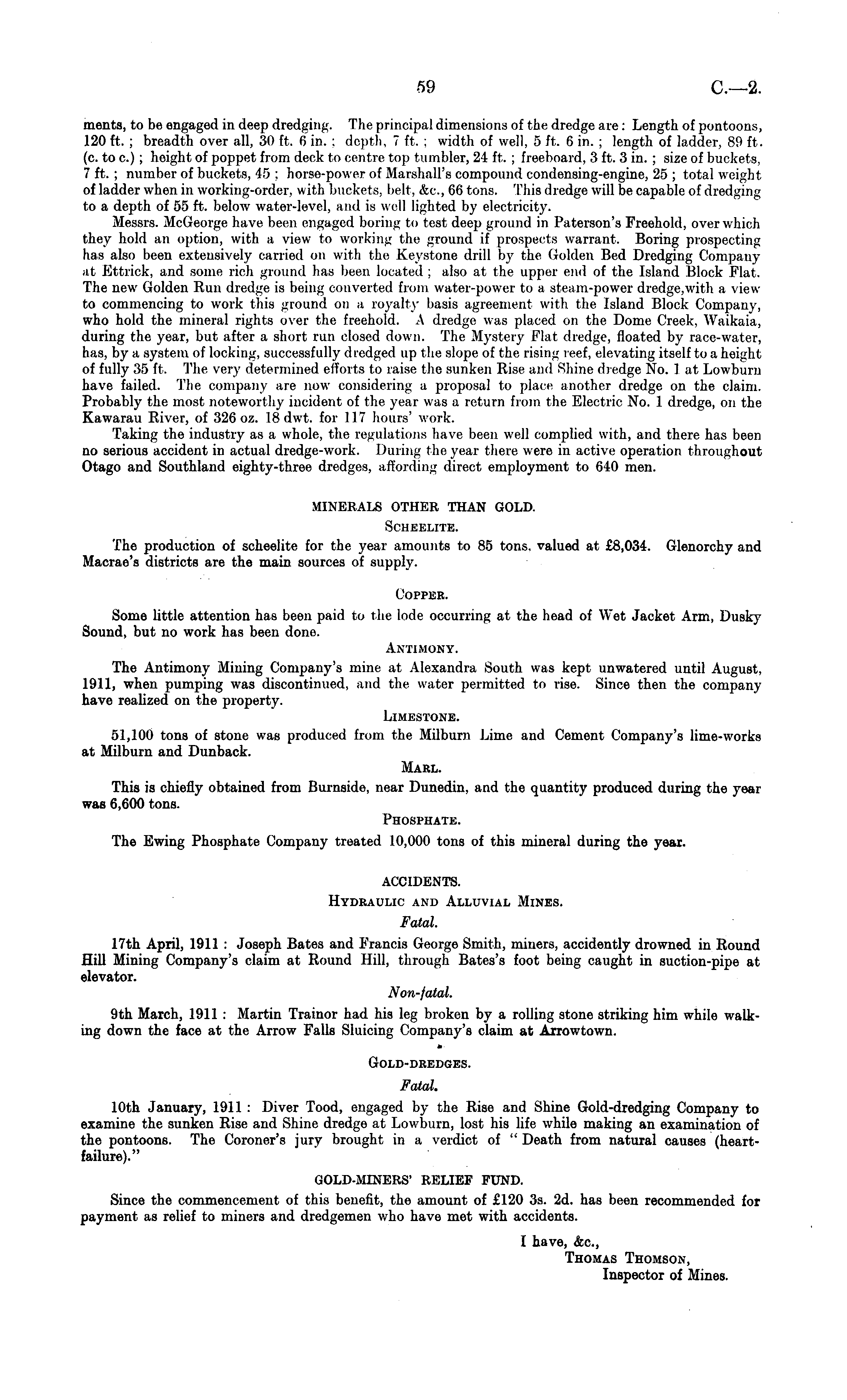 ments, to be engaged in deep dredging. The principal dimensions of the dredge are : Length of pontoons, 120 ft. ; breadth over all, 30 ft, 6 in. : depth, 7 ft. ; width of well, 5 ft. 6 in. ; length of ladder, 89 ft. (c. to c.) ; height of poppet from deck to centre top tumbler, 24 ft. ; freeboard, 3 ft. 3 in. ; size of buckets, 7 ft. ; number of buckets, 45 ; horse-power of Marshall's compound condensing-engine, 25 ; total weight of ladder when in working-order, with buckets, belt, &c, 66 tons. This dredge will be capable of dredging to a depth of 55 ft. below water-level, and is well lighted by electricity. Messrs. McGeorge have been engaged boring to test deep ground in Peterson's Freehold, over which they hold an option, with n view to working the ground if prospects warrant. Boring prospecting hiis also been extensively carried on with the Keystone drill by the Golden Bed Dredging Companj at Ettrick, and some rich ground lias been located ; also at the upper end of the Island Block Flat. The new Golden Run dredge is being converted from water-power to a steam-power dredge,with a view to commencing to work this ground on a royalty basis agreement with the Island Block Company, who hold the mineral rights over the freehold. A dredge was placed on the Dome Creek, Waikaia, during the year, but after a short run closed down. The Mystery Flat dredge, floated by race-water, lias, by a system of locking, successfully dredged up the slope of the rising reef, elevating itself to a height of fully 35 ft. The very determined efforts to raise the sunken Rise and fthine dredge No. lat Lowburu have failed. The company are now considering a proposal to place another dredge on the claim. Probably the most noteworthy incident of the year was a return from the Electric No. 1 dredge, on the Kawarau River, of 326 oz. 18dwt. for I] 7 hours' work. Taking the industry as a whole, the regulations have been well complied with, and there has been no serious accident in actual dredge-work. During the year there were in active operation throughout Otago and Southland eighty-three dredges, affording direct employment to 640 men. MINERALS OTHER THAN GOLD. SCHEELITE. The production of scheelite for the year amounts to 85 tons, valued at £8,034. Glenorchy and Macrae's districts are the main sources of supply. Copper. Some little attention has been paid to the lode occurring at the head of Wet Jacket Arm, Dusky Sound, but no work has been done. Antimony. The Antimony Mining Company's mine at Alexandra South was kept unwatered until August, 1911, when pumping was discontinued, and the water permitted to rise. Since then the company have realized on the property. Limestone. 51,100 tons of stone was produced from the Milburn Lime and Cement Company's lime-works at Milburn and Dunback. Marl. This is chiefly obtained from Burnside, near Dunedin, and the quantity produced during the year was 6,600 tons. Phosphate. The Ewing Phosphate Company treated 10,000 tons of this mineral during the year. ACCIDENTS. Hydraulic and Alluvial Mines. Fatal. 17th April, 1911 : Joseph Bates and Francis George Smith, miners, accidently drowned in Round Hill Mining Company's claim at Round Hill, through Bates's foot being caught in suction-pipe at elevator. Non-fatal. 9th March, 1911 : Martin Trainor had his leg broken by a rolling stone striking him while walking down the face at the Arrow Falls Sluicing Company's claim at Arrowtown. Gold-dredges. Fatal. 10th January, 1911 : Diver Tood, engaged by the Rise and Shine Gold-dredging Company to examine the sunken Rise and Shine dredge at Lowburn, lost his life while making an examination of the pontoons. The Coroner's jury brought in a verdict of " Death from natural causes (heartfailure)." GOLD-MINERS' RELIEF FUND. Since the commencement of this benefit, the amount of £120 3s. 2d. has been recommended for payment as relief to miners and dredgemen who have met with accidents. I have, &c, Thomas Thomson, Inspector of Mines.