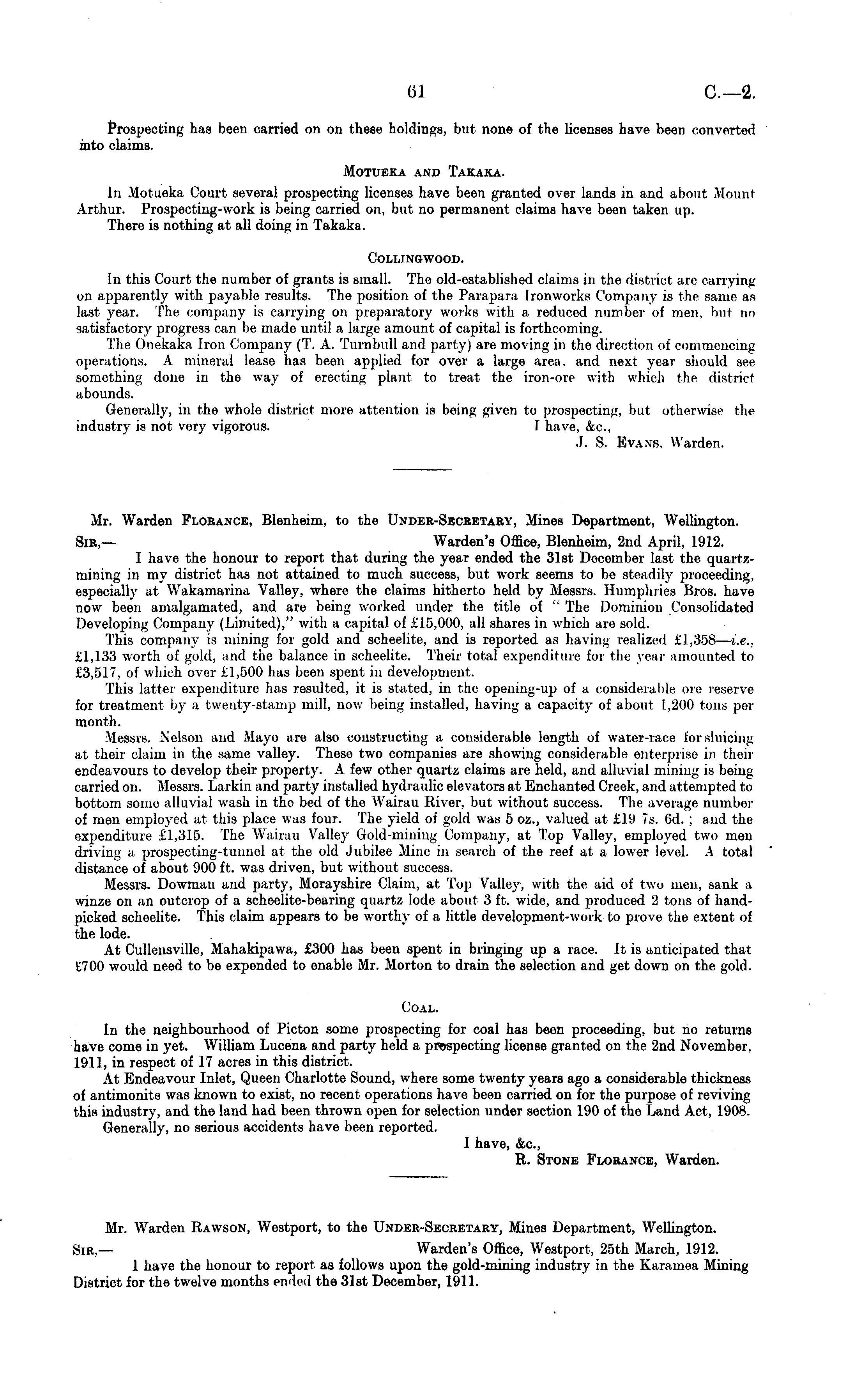 Mr. Warden Florance, Blenheim, to the Under-Secretary. Mines Department, Wellington. Sir,— Warden's Office, Blenheim, 2nd April, 1912. I have the honour to report that during the year ended the 31st December last the quartzmining in my district has not attained to much success, but work seems to be steadily proceeding, especially at Wakamarina Valley, where the claims hitherto held by Messrs. Humphries Bros, have now been amalgamated, and are being worked under the title of " The Dominion Consolidated Developing Company (Limited)," with a capital of £15,000, all shares in which are sold. This company is ;nining for gold and scheelite, and is reported as having realized £1,358 — i.e.. £1,133 worth of gold, and the balance in scheelite. Their total expenditure for the year amounted to £3,517, of which over £1,500 has been spent in development. This latter expenditure has resulted, it is stated, in the opening-up of a considerable ore reserve for treatment by a twenty-stamp mill, now being installed, having a capacity of about 1.200 tons per month. Mes.srs. Nelson and Mayo are. also constructing a considerable length of water-race foi sluicing at their claim in the same valley. These two companies are showing considerable enterprise in their endeavours to develop their property. A few other quart/, claims are held, and alluvial mining is being carried on. Messrs. Larkin and party installed hydraulic elevators at Enchanted Creek, and attempted to bottom some alluvial wash in the bed of the Wairau River, but without success. The average number of men employed at this place was four. The yield of gold was 5 oz., valued at £19 7s. 6d. ; and the expenditure £1,315. The Wairau Valley Gold-mining Company, at Top Valley, employed two men driving a prospecting-tumiel at the old Jubilee Mine in search of the reef at a lower level. A total distance of about 900 ft. was driven, but without success. Messrs. Bowman and party, Morayshire Claim, at Top Valley, with the aid of two men, sank a winze on an outcrop of a scheelite-bearing quartz lode about 3 ft. wide, and produced 2 tons of handpicked scheelite. This claim appears to be worthy of a little development-work to prove the extent of the lode. At Cullensville, Mahakipawa, £300 has been spent in bringing up a race. It is anticipated that £700 would need to be expended to enable Mr. Morton to drain the selection and get down on the gold. Coal. In the neighbourhood of Picton some prospecting for coal has been proceeding, but no returns have come in yet. William Lucena and party held a prospecting license granted on the 2nd November, 1911, in respect of 17 acres in this district. At Endeavour Inlet, Queen Charlotte Sound, where some twenty years ago a considerable thickness of antimonite was known to exist, no recent operations have been carried on for the purpose of reviving this industry, and the land had been thrown open for selection under section 190 of the Land Act, 1908. Generally, no serious accidents have been reported. I have, &c, R. Stone Florance, Warden.