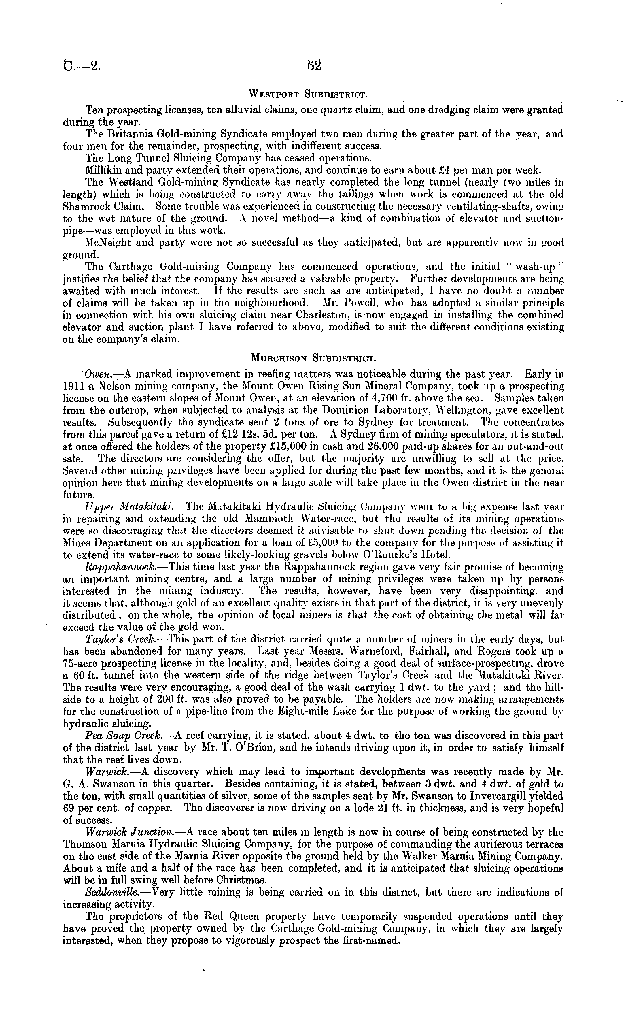 Westport Subdistrict. Ten prospecting licenses, ten alluvial claims, one quartz claim, and one dredging claim were granted during the year. The Britannia Gold-mining Syndicate employed two men during the greater part of the year, and foui' men for the remainder, prospecting, with indifferent success. The Long Tunnel Sluicing Company has ceased operations. Millikin and party extended their operations, and continue to earn about £4 per man per week. The Westland Gold-mining Syndicate lias nearly completed the long tunnel (nearly two miles in length) which is lining constructed to cany away the tailings when work is commenced at the old Shamrock Claim. Some trouble was experienced in constructing the necessary ventilating-shafts, owing to the wet nature of the ground. A uovel method —a kind of combination of elevator and suctionpipe—was employed in this work. McNeight and party were not so successful as they anticipated, but are apparently now in good ground. The Carthage Gold-mining Company has commenced operations, and the initial " wash-up" justifies the belief that the company has secured a valuable property. Further developments are being awaited with much interest. If the results are such as are anticipated, I have no doubt a number of claims will be taken up in the neighbourhood. Mr. Powell, who has adopted a similar principle in connection with his own sluicing claim near Charleston, is-now engaged in installing the combined elevator and suction plant 1 have referred to above, modified to suit the different conditions existing on the company's claim. MURCHISON SUBDISTKICT. Owen. —A marked improvement in reefing matters was noticeable during the past year. Early in 1911 a Nelson mining company, the Mount Owen Rising Sun Mineral Company, took up a prospecting license on the eastern slopes of Mount Owen, at an elevation of 4,700 ft. above the sea. Samples taken from the outcrop, when subjected to analysis at the Dominion Laboratory, Wellington, nave excellent results. Subsequently rim syndicate sent 2 tons of ore to Sydney for treatment. The concentrates from this parcel gave a return of £12 12s. sd. per ton. A Sydney firm of mining speculators, it is stated. at once offered the holders of the property £15,000 in cash and "26.000 paid-up shares lor an out-and-out sale. The directors are considering the offer, but the majority are unwilling to sell at the. price. Several other mining privileges have been applied for during the past few months, and it is the general opinion here that mining developments on a large .scale will take place in the Owen district in the near future. Upper Matakitaki. The Mitakitaki Hydraulic Sluicing Company went to a big expense last pear in repairing and extending the old Mammoth Water-race, but the results of its mining operations were so discouraging that the directors deemed it advisable to shut down pending the decision of the Mines Department on an application for a loan of £5,000 to the company for the purpose of assisting ii to extend its water-race to some likely-looking gravels below O'Rourke's Hotel. RappaAannock. — This time last pear the Etappahannock region gave very fair promise of becoming an important mining centre, and a large number of mining privileges were taken up by persons interested in the mining industry. The results, however, have been very disappointing, and it seems that, although gold of an excellent quality exists in that part of the district, it is very unevenly distributed ; on the whole, the opinion of local miners is that the cost of obtaining the metal will far exceed the value of the gold won. Taylor's Creek. —This part of the district carried quite a number of miners in the early days, bul has been abandoned for many years. Last year Messrs. Wameford, Fairhall, and Rogers took up a 75-acre prospecting license in the locality, and, besides doing a good deal of surface-prospecting, drove a 60 ft. tunnel into the western side of the ridge between Taylor's Creek and the Matakitaki River. The results were very encouraging, a good deal of the wash carrying 1 dwt. to the yard ; and the hillside to a height of 200 ft. was also proved to be payable. The holders are now making arrangements for the construction of a pipe-line from the Eight-mile Lake for the purpose of working the ground by hydraulic sluicing. Pea Soup Creek. —A reef carrying, it is stated, about 4 dwt. to the ton was discovered in this part of the district last year by Mr. T. O'Brien, and he intends driving upon it, in order to satisfy himself that the reef lives down. Warwick. —A discovery which may lead to important developments was recently made by Mr. G. A. Swanson in this quarter. Besides containing, it is stated, between 3 dwt. and 4 dwt. of gold to the ton, with small quantities of silver, some of the samples sent by Mr. Swanson to Invercargill yielded 69 per cent, of copper. The discoverer is now driving on a lode 21 ft. in thickness, and is very hopeful of success. Warwick Junction. —A race about ten miles in length is now in course of being constructed by the Thomson Maruia Hydraulic Sluicing Company, for the purpose of commanding the auriferous terraces on the east side of the Maruia River opposite the ground held by the Walker Maruia Mining Company. About a mile and a half of the race has been completed, and it is anticipated that sluicing operations will be in full swing well before Christmas. Seddonville. —Very little mining is being carried on in this district, but there ate indications of increasing activity. The proprietors of the Red Queen property have temporarily suspended operations until they have proved the property owned by the Carthage Gold-mining Company, in which they are largely interested, when they propose to vigorously prospect the first-named.