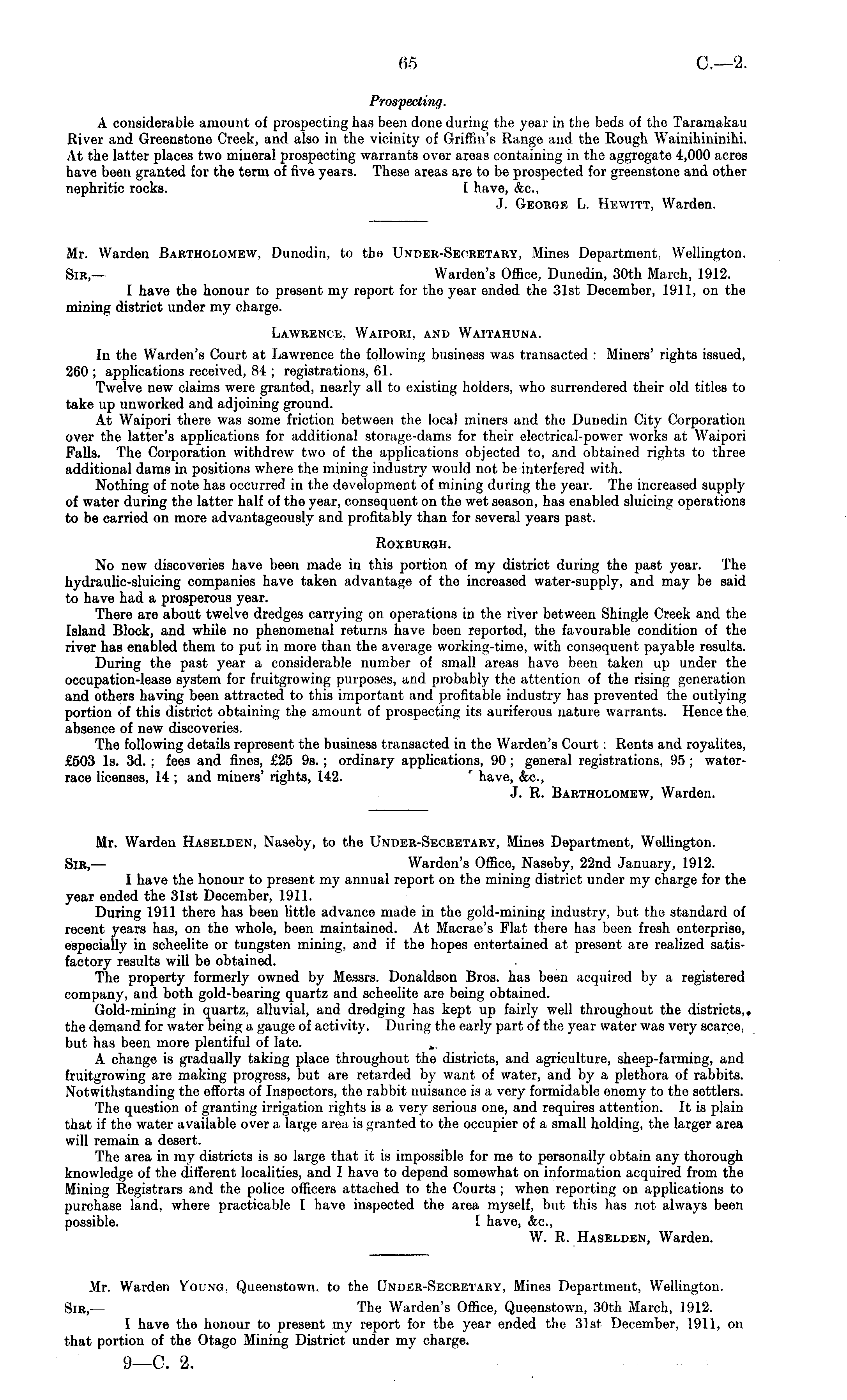 Mr. Warden Haselden, Naseby, to the Under-Secretary, Mines Department, Wellington. Sir, — Warden's Office, Naseby, 22nd January, 1912. I have the honour to present my annual report on the mining district under my charge for the year ended the 31st December, 1911. During 1911 there has been little advance made in the gold-mining industry, but the standard of recent years has, on the whole, been maintained. At Macrae's Plat there has been fresh enterprise, especially in scheelite or tungsten mining, and if the hopes entertained at present are realized satisfactory results will be obtained. The property formerly owned by Messrs. Donaldson Bros, has been acquired by a registered company, and both gold-bearing quartz and scheelite are being obtained. Gold-mining in quartz, alluvial, and dredging has kept up fairly well throughout the districts,, the demand for water being a gauge of activity. During the early part of the year water was very scarce, but has been more plentiful of late. A change is gradually taking place throughout the districts, and agriculture, sheep-farming, and fruitgrowing are making progress, but are retarded by want of water, and by a plethora of rabbits. Notwithstanding the efforts of Inspectors, the rabbit nuisance is a very formidable enemy to the settlers. The question of granting irrigation rights is a very serious one, and requires attention. It is plain that if the water available over a large area is granted to the occupier of a small holding, the larger area will remain a desert. The area in my districts is so large that it is impossible for me to personally obtain any thorough knowledge of the different localities, and I have to depend somewhat on information acquired from the Mining Registrars and the police officers attached to the Courts ; when reporting on applications to purchase land, where practicable I have inspected the area myself, but this has not always been possible. I have, &c, W. R. Haselden, Warden.