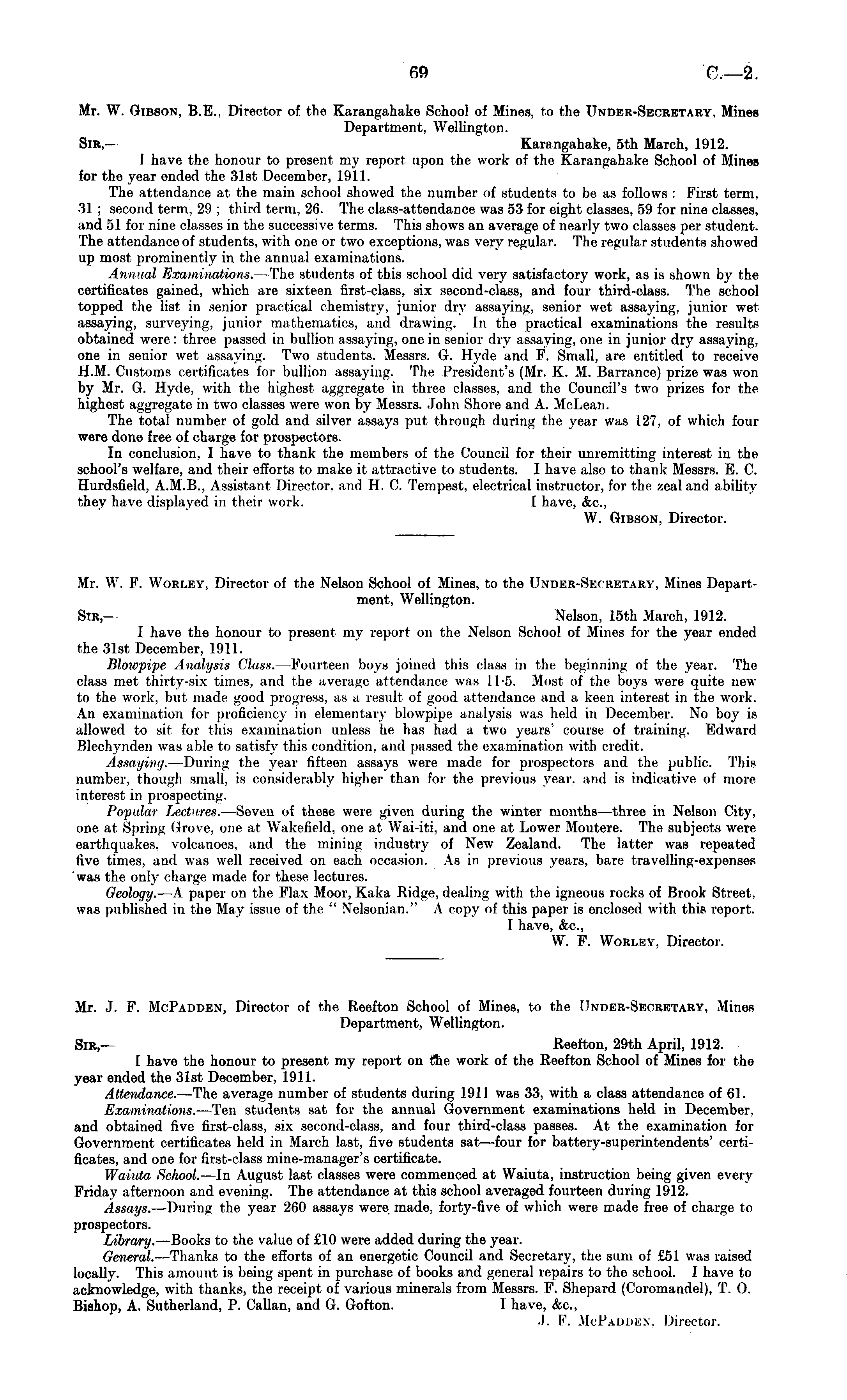 Mr. J. F. McPadden, Director of the Reefton School of Mines, to the Under-Secretary, Mines Department, Wellington. Sir,- Reefton, 29th April, 1912. I have the honour to present my report on t!he work of the Reefton School of Mines for the year ended the 31st December, 1911. Attendance. —The average number of students during 1911 was 33, with a class attendance of 61. Examinations. —Ten students sat for the annual Government examinations held in December, and obtained five first-class, six second-class, and four third-class passes. At the examination for Government certificates held in March last, five students sat —four for battery-superintendents' certificates, and one for first-class mine-manager's certificate. Waiuta School. —ln August last classes were commenced at Waiuta, instruction being given every Friday afternoon and evening. The attendance at this school averaged fourteen during 1912. Assays. —During the year 260 assays were made, forty-five of which were made free of charge to prospectors. Library. —Books to the value of £10 were added during the year. General. —Thanks to the efforts of an energetic Council and Secretary, the sum of £51 was raised locally. This amount is being spent in purchase of books and general repairs to the school. I have to acknowledge, with thanks, the receipt of various minerals from Messrs. F. Shepard (Coromandel), T. 0. Bishop, A. Sutherland, P. Callan, and G. Gofton. I have, &c, .1. F. McPadden, Director.