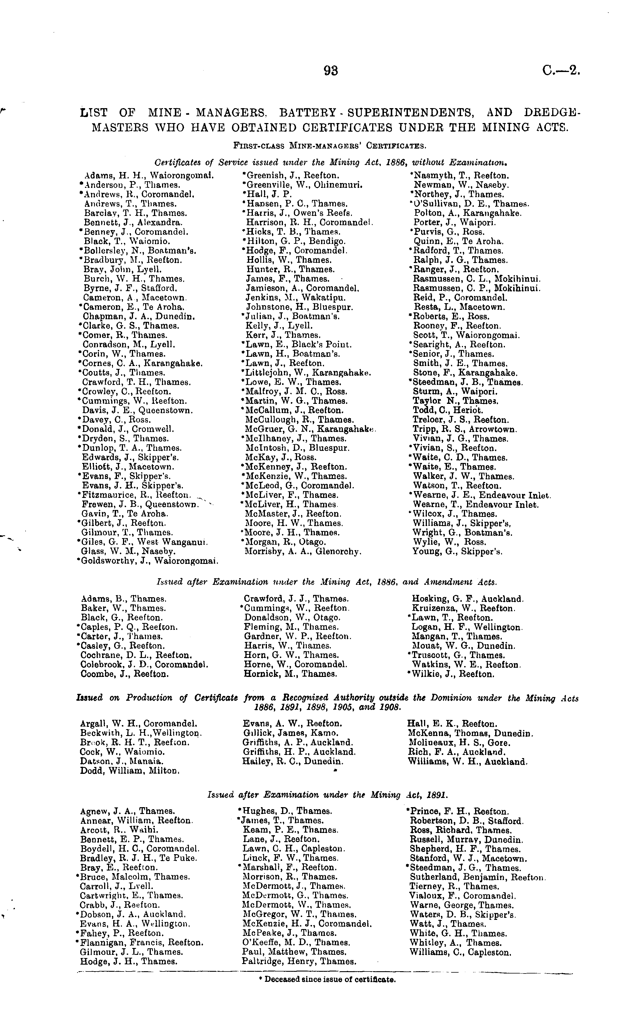LIST OF MINE - MANAGERS. BATTEEY - SUPERINTENDENTS, AND DREDGEMASTERS WHO HAVE OBTAINED CERTIFICATES UNDER THE MINING ACTS. FinsT-CLASs Mine-managers' Certificates. Certificates of Service issued under the Mining Act, 1886, without Examination. Adams, H. H., Waiorongomai. 'Greenish, J., Reefton. 'Nasmyth, T., Reefton. •Anderson, P., Thames. 'Greenville, W., Ohinemuri. Newman, W., Naseby. •Andrews, X., Coromandel. 'Hall, J. P. "Northey, J., Thames. Andrews, T., Tliames. 'Hansen, P. C, Thames. 'O'Sullivan, D. E., Thames. Barclay, T. H., Thames. "Harris, J., Owen's Reefs. Polton, A., Karangahake. Bennett, J., Alexandra. Harrison, R. H., Coromandel. Porter, J., Waipori. •Benney, J., Coromandel. 'Hicks, T. 8., Thames. "Purvis, G., Ross. Black, T., Waiomio. *Hilton, G. P., Bendigo. Quinn, E., Te Aroha. •Bollersley, N., Boatman's. "Hodge, P., Coromandel. 'Radford, T., Thames. •Bradbury, M., Reefton. Hollis, W., Thames. Ralph, J. G., Thames. Bray, Jolin, Lyell. Hunter, R., Thames. 'Ranger, J., Reefton. Burch, W. H., Thames. James, P., Thames. Rasmussen, C. L., Mokihinui. Byrne, J. F., Stafford. Jamieson, A., Coromandel. Rasmussen, C. P., Mokihinui. Cameron, A , Macetown. Jenkins, M., Wakatipu. Reid, P., Coromandel. •Cameron, E., Te Aroha. Johnstone, H., Bluespur. Resta, L., Macetown. Chapman, J. A., Dunedin. 'Julian, J., Boatman's. 'Roberts, E., Ross. •Clarke, G. S., Thames. Kelly, J., Lyell. Rooney, P., Reefton. •Comer, R., Thames. Kerr, J., Thames. Scott, T., Waiorongomai. Conradson, M., Lyell. *Lawn, E., Black's Point. "Searight, A., Reefton. *Corin, \V., Thames. 'Lawn, H., Boatman's. 'Senior, J., Tliames. •Comes, C. A., Karangahake. 'Lawn, J., Reefton. Smith, J. E., Thames. 'Coutts, J., Tliames. "Littlejohn, W., Karangahake Stone, F., Karangahake. Crawford, T. H., Thames. 'Lowe, E. W., Thames. 'Steedman, J. 8., Ttiames. •Crowley, C, Reefton. 'Malfroy, J. M. C, Ross. Sturm, A., Waipori. ♦Cummings, W., Reefton. 'Martin, W. G., Thames. Taylor N., Thamea. Davis, J. E., Queenstown. 'McCallum, J., Reefton. Todd, C, Heribt. 'Davey, C, Ross. McCullough, R., Tliames. Treloer, J. S., Reefton. •Donald, J., Cromwell. McGruer, G. N., Karangahaki' Tripp, R. S., Arrowtown. •Dryden, S., Thames. 'Mellhaney, J., Thames. Vivian, J. G., Thames. 'Dunlop, T. A., Thames. Mclntosh, D., Bluespur. 'Vivian, S., Reefton. Edwards, J., Skipper's. McKay, J., Ross. 'Waite, C. D., Thames. Elliott, J., Macetown. 'McKenney, J., Reefton. 'Waite, E., Thames. •Evans, F., Skipper's. 'McKenzie, W., Thames. Walker, J. W., Thames. Evans, J. H., Skipper's. "McLeod, G., Coromandel. Watson, T., Reefton. "Fitzmaurice, R., Reefton 'McLiver, P., Thames. 'Wearne, J. E., Endeavour Inlet. Frewen, J. 8., Queenstown. - 'McLiver, H., Thames. Wearne, T., Endeavour Inlet. Gavin, T., Te Aroha. McMaster, J., Reefton. "Wilcox, J., Thames. •Gilbert, J., Reefton. Moore, H. W., Thames. Williams, J., Skipper's, Gilmour, 1., Thames. 'Moore, J. H., Thames. Wright, G., Boatman's. •Giles, G. F., West Wanganui. 'Morgan, R., Otago. Wylie, W., Ross. Glass, W. M., Naseby. Morrisby, A. A., Glenorchy. Young, G., Skipper's. 'Goldsworthv, J., Waiorongomai. Issued after Examination under the Mining Act, 1886, and Amendment Acts. Adams, 8., Thames. Crawford, J. J., Thames. Hosking, G. F., Auckland. Baker, W., Thames. 'Camming*, W., Reefton. Kruizenza, W., Reefton. Black, G., Reefton. Donaldson, W., Otago. 'Lawn, T., Reefton. 'Caples, P. Q., Reefton. Fleming, M., Thames. Logan, H. F., Wellington. •Carter, J., Thames. Gardner, W. P., Reefton. Mangan, T., Thames. •Casley, G., Reefton. Harris, W., Thames. Mouat, W. G., Dunedin. Cochrane, D. L., Reefton. Horn, G. W., Thames. 'Truseott, G., Thames. Colebrook, J. D., Coromandel. Home, W., Coromandel. Watkins, W. E., Reefton. Coombe, J., Reefton. Hornick, M., Thames. "Wilkie, J., Reefton. Issued on Production of Certificate from a Recognised Authority outside the Dominion under the Mining Acts 1886, 1891, 1898, 1905, and 1908. Argall, W. H., Coromandel. Evans, A. W., Reefton. Hall, E. X, Reefton. Beckwith, L. H.,Wellington. Gillick, James, Kamo. McKenna, Thomas, Dunedin. Br. ok, R. H. T., Reefton. Griffiths, A. P., Auckland. Molineaux, H. S., Gore. Cock, W., Waiomio. Griffiths, H. P., Auckland. Rich, F. A., Auckland. Datson. J., Manaia. Hailey, R. C, Dunedin. Williams, W. H., Auokland. Dodd, William, Milton, Issued after Examination under the Mining Act, 1891. Agnew, J. A., Thames. 'Hughes, D., Thames. 'Prince, F. H., Reefton. Annear, William, Reefton. 'James, T., Thames. Robertson, D. 8., Stafford. Arcoit, R.. Wnihi. Keam, P. E., Thames. Ross, Richard, Thames. Bennett, E. P., Thames. Lane, J., Reefton. Russell, Murray, Dunedin. Boydell, H. C, Coromandel. Lawn, C. H., Capleston. Shepherd, H. F., Thames. Bradley, R. J. H., Te Puke. Linck, F. W., Thames. Stanford, W. J., Macetown. Bray, E., Reef too. 'Marshall, F., Reefton. 'Steedman, J. G., Thames. •Bruce, Malcolm, Thames. Morrison, R., Thames. Sutherland, Benjamin, Reefton. Carroll, J., Lvell. McDermott, J., Thames. Tierney, R., Thames. Cartwriglit., E., Thames. McDermotc, G., Thames. Vialoux, F., Coromandel. Crabb, J., Reefton. McDermott, W., Thames. Warne, George, Thames. 'Dobson, J. A., Auckland. McGregor, W. T., Thames. Waters, D. 8., Skipper's. Evans, H. A., Wellington. McKenzie, H. J., Coromandel. Watt, J., Thames. •Fahey, P., Reefton. McPeake, J., Thames. White, G. H., Thames. •Flannigan, Francis, Reefton. O'Keeffe, M. D., Thames. Whitley, A., Thames. Gilmour, J. L., Thames. Paul, Matthew, Thames. Williams, C, Capleston. Hodge, J. H., Thames. Paltridge, Henry, Thames. * Deceased since issue of certificate.