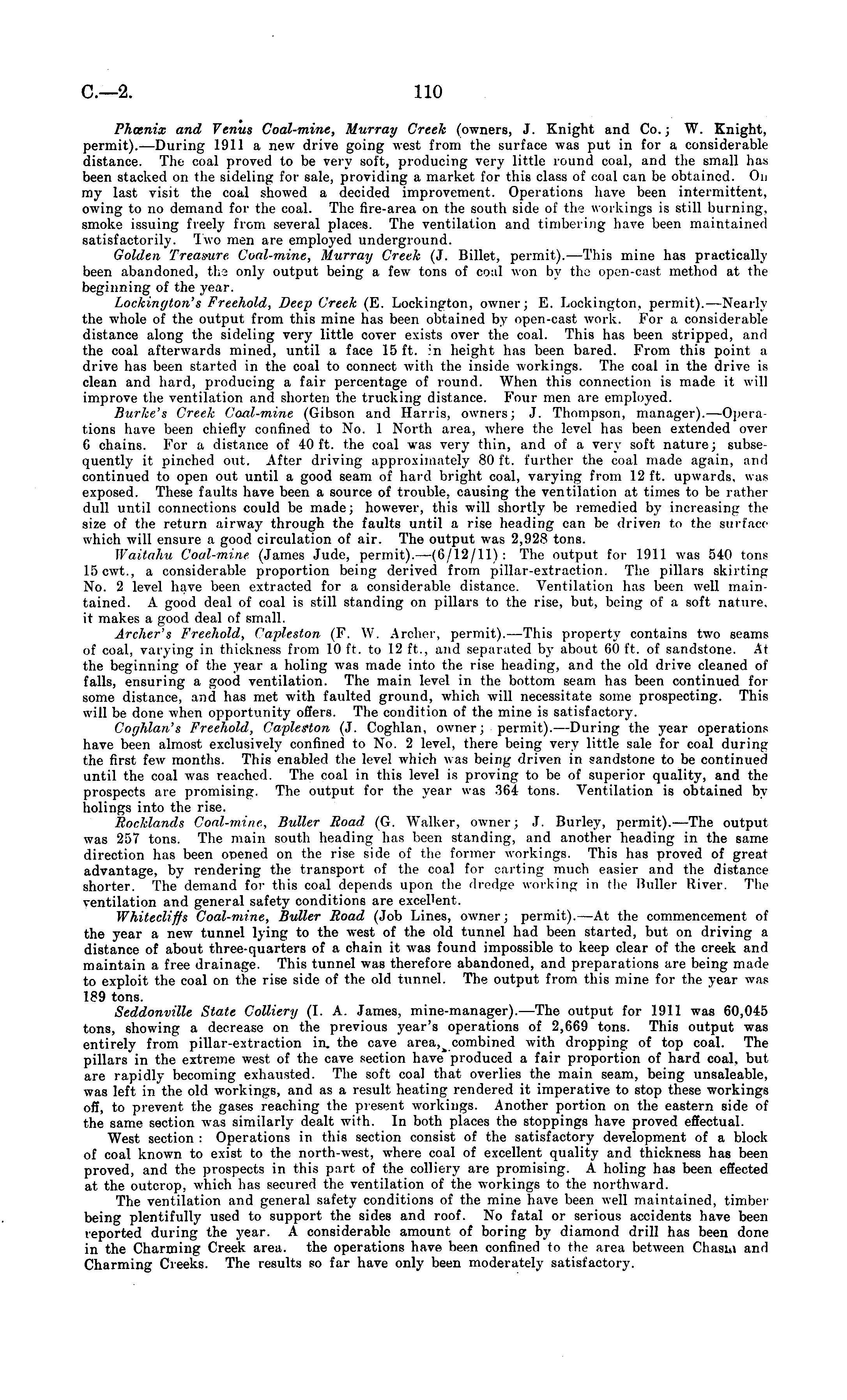 Phcenix and Venus Coal-mine, Murray Creek (owners, J. Knight and Co.; W. Knight, permit).-—During 1911 a new drive going west from the surface was put in for a considerable distance. The coal proved to be very soft, producing very little round coal, and the small has been stacked on the sideling for sale, providing a market for this class of coal can be obtained. Ou my last visit the coal showed a decided improvement. Operations have been intermittent, owing to no demand for the coal. The fire-area on the south side of the workings is still burning, smoke issuing freely from several places. The ventilation and timbering have been maintained satisfactorily. Two men are employed underground. Golden Treasure Coal-mine, Murray Creek (J. Billet, permit). —This mine has practically been abandoned, tha only output being a few tons of coal won by the open-cast method at the beginning of the year. Lockinyton's Freehold, Deep Creek (E. Lockington, owner; E. Lockington, permit).—Nearly the whole of the output from this mine has been obtained by open-cast work. For a considerable distance along the sideling very little cover exists over the coal. This has been stripped, and the coal afterwards mined, until a face 15 ft. :'n height has been bared. From this point a drive has been started in the coal to connect with the inside Avorkings. The coal in the drive is clean and hard, producing a fair percentage of round. When this connection is made it will improve the ventilation and shorten the trucking distance. Four men are employed. Burkes Creek Coal-mine (Gibson and Harris, owners; J. Thompson, manager).—Operations have been chiefly confined to No. 1 North area, where the level has been extended over 6 chains. For a distance of 40 ft. the coal was very thin, and of a very soft nature; subsequently it pinched out. After driving approximately 80 ft. further the coal made again, and continued to open out until a good seam of hard bright coal, varying from 12 ft. upwards, was exposed. These faults have been a source of trouble, causing the ventilation at times to be rather dull until connections could be made; however, this will shortly be remedied by increasing the size of the return airway through the faults until a rise heading can be driven to the surface which will ensure a good circulation of air. The output was 2,928 tons. Waitahu Coal-mine (James Jude, permit). —(6/12/11) : The output for 1911 was 540 tons loewt., a considerable proportion being derived from pillar-extraction. The pillars skirting No. 2 level have been extracted for a considerable distance. Ventilation has been well maintained. A good deal of coal is still standing on pillars to the rise, but, being of a soft nature, it makes a good deal of small. Archer's Freehold, Capleston (F. W. Archer, permit).—This property contains two seams of coal, varying in thickness from 10 ft. to 12 ft., and separated by about 60 ft. of sandstone. At the beginning of the year a holing was made into the rise heading, and the old drive cleaned of falls, ensuring a good ventilation. The main level in the bottom seam has been continued for some distance, and has met with faulted ground, which will necessitate some prospecting. This will be done when opportunity offers. The condition of the mine is satisfactory. Coghlan's Freehold, Capleston (J. Coghlan, owner; permit). —During the year operations have been almost exclusively confined to No. 2 level, there being very little sale for coal during the first few months. This enabled the level which was being driven in sandstone to be continued until the coal was reached. The coal in this level is proving to be of superior quality, and the prospects are promising. The output for the year was •'564 tons. Ventilation is obtained by holings into the rise. Rocklands Coal-mine, Butter Road (G. Walker, owner; J. Burley, permit).—The output was 257 tons. The main south heading has lieen standing, and another heading in the same direction has been opened on the rise side of the former workings. This has proved of great advantage, by rendering the transport of the coal for carting much easier and the distance shorter. The demand for this coal depends upon the dredge working in the Buller River. The ventilation and general safety conditions are excellent. Whitecliffs Coal-mine, Buller Road (Job Lines, owner; permit). —At the commencement of the year a new tunnel lying to the west of the old tunnel had been started, but on driving a distance of about three-quarters of a chain it was found impossible to keep clear of the creek and maintain a free drainage. This tunnel was therefore abandoned, and preparations are being made to exploit the coal on the rise side of the old tunnel. The output from this mine for the year was 189 tons. Seddonville State Colliery (I. A. James, mine-manager). —The output for 1911 was 60,045 tons, showing a decrease on the previous year's operations of 2,669 tons. This output was entirely from pillar-extraction in. the cave combined with dropping of top coal. The pillars in the extreme west of the cave section have produced a fair proportion of hard coal, but are rapidly becoming exhausted. The soft coal that overlies the main seam, being unsaleable, was left in the old workings, and as a result heating rendered it imperative to stop these workings off, to prevent the gases reaching the present workings. Another portion on the eastern side of the same section was similarly dealt with. In both places the stoppings have proved effectual. West section : Operations in this section consist of the satisfactory development of a block of coal known to exist to the north-west, where coal of excellent quality and thickness has been proved, and the prospects in this part of the colliery are promising. A holing has been effected at the outcrop, which has secured the ventilation of the workings to the northward. The ventilation and general safety conditions of the mine have been well main