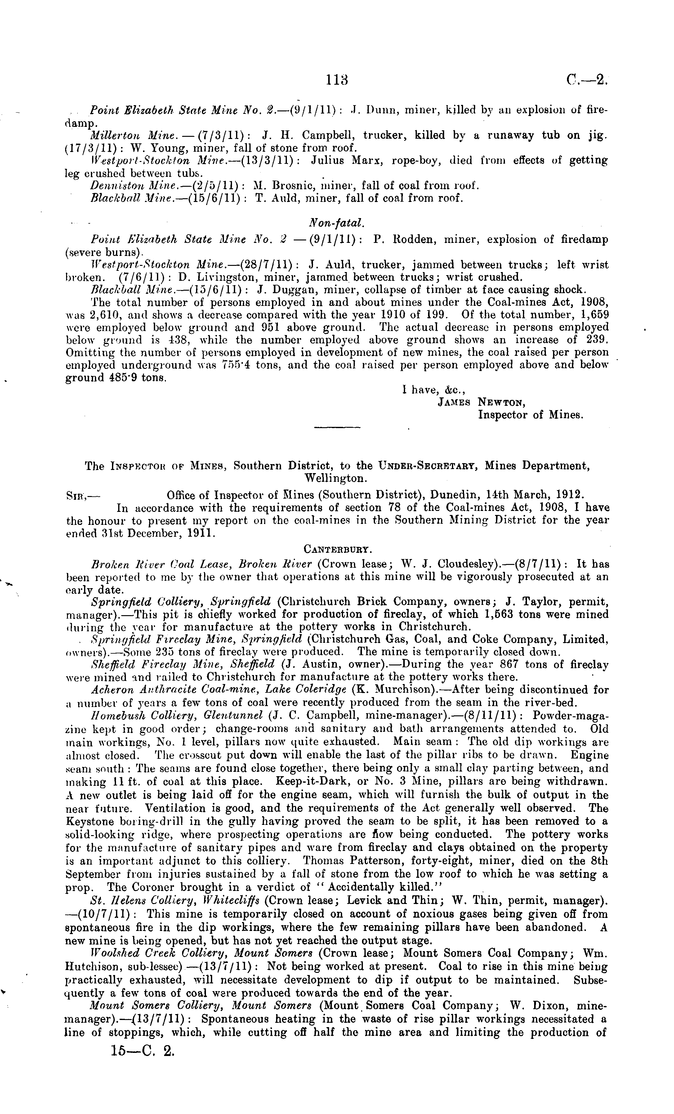 The Inspbotob of Minks, Southern District, to the Under-Secretary, Mines Department, Wellington. Sift', — Office of Inspector of Klines (Southern District), Dunedin, 14th March, 1912. In accordance with the requirements of section 78 of the Coal-mines Act, 1908, I have the honour to present my report on the coal-mines in the Southern Mining District for the year ended 31st December, 1911. Canterbury. Broken River Coal Lease, Broken Hirer (Crown lease; W. J. Cloudesley). —(8/7/11) : It has been reported to me by the owner that operations at this mine will be vigorously prosecuted at an early date. S/iringfield Colliery, Springfield (Christchuroh Brick Company, owners; J. Taylor, permit, manager). —This pit is chiefly worked for production of fireclay, of which 1,563 tons were mined .luring the year for manufacture at the pottery works in Christchurch. . Springfield Fireclay Mine, Springfield (Christchurch Gas, Coal, and Coke Company, Limited, owners).—Some 235 tons of fireclay were produced. The mine is temporarily closed down. Sheffield Fireclay Mine, Sheffield (J. Austin, owner). —Dining the year 867 tons of fireclay were mined 'ind railed to Christchurch for manufacture at the pottery works there. Acheron Anthracite Coal-mine, Lake Coleridge (K. Murchison). —After being discontinued for a number of years a few tons of coal were recently produced from the seam in the river-bed. Homebush Colliery, Glentunnel (J. C. Campbell, mine-manager). —(8/11/11) : Powder-maga-zine kept in good order; change-rooms and sanitary and bath arrangements attended to. Old main workings, No. 1 level, pillars now quite exhausted. Main seam : The old dip workings almost closed. The crosscut put down will enable the last of the pillar ribs to be drawn. Engine seam south : The seams are found close together, there being only a small clay parting between, and making 11 ft. of coal at this place. Keep-it-Dark, or No. 3 Mine, pillars are being withdrawn. A new outlet is being laid off for the engine seam, which will furnish the bulk of output in the near future. Ventilation is good, and the requirements of the Act generally well observed. The Keystone boring-drill in the gully having proved the seam to be split, it has been removed to a solid-looking ridge, where prospecting operations are now being conducted. The pottery works for the manufacture of sanitary pipes and ware from fireclay and clays obtained on the property is an important adjunct to this colliery. Thomas Patterson, forty-eight, miner, died on the 8th September from injuries sustained by a fall of stone from the low roof to which he was setting a prop. The Coroner brought in a verdict of "Accidentally killed." St. Helens Colliery, Whitecliffs (Crown lease; Levick and Thin; W. Thin, permit, manager). —(10/7/11): This mine is temporarily closed on account of noxious gases being given off from spontaneous fire in the dip workings, where the few remaining pillars have been abandoned. A new mine is being opened, but has not yet reached the output stage. Woohhed Creek Colliery, Mount Somers (Crown lease; Mount Somers Coal Company; Wm. Hutchison, sub-lessee) —(13/7/11) : Not being worked at present. Coal to rise in this mine being practically exhausted, will necessitate development to dip if output to be maintained. Subsequently a few tons of coal were produced towards the end of the year. Mount Somen Colliery, Mount Somers (Mount Somers Coal Company; W. Dixon, minemanager).—(13/7/11) : Spontaneous heating in the waste of rise pillar workings necessitated a line of stoppings, which, while cutting off half the mine area and limiting the production of 15—C. 2.