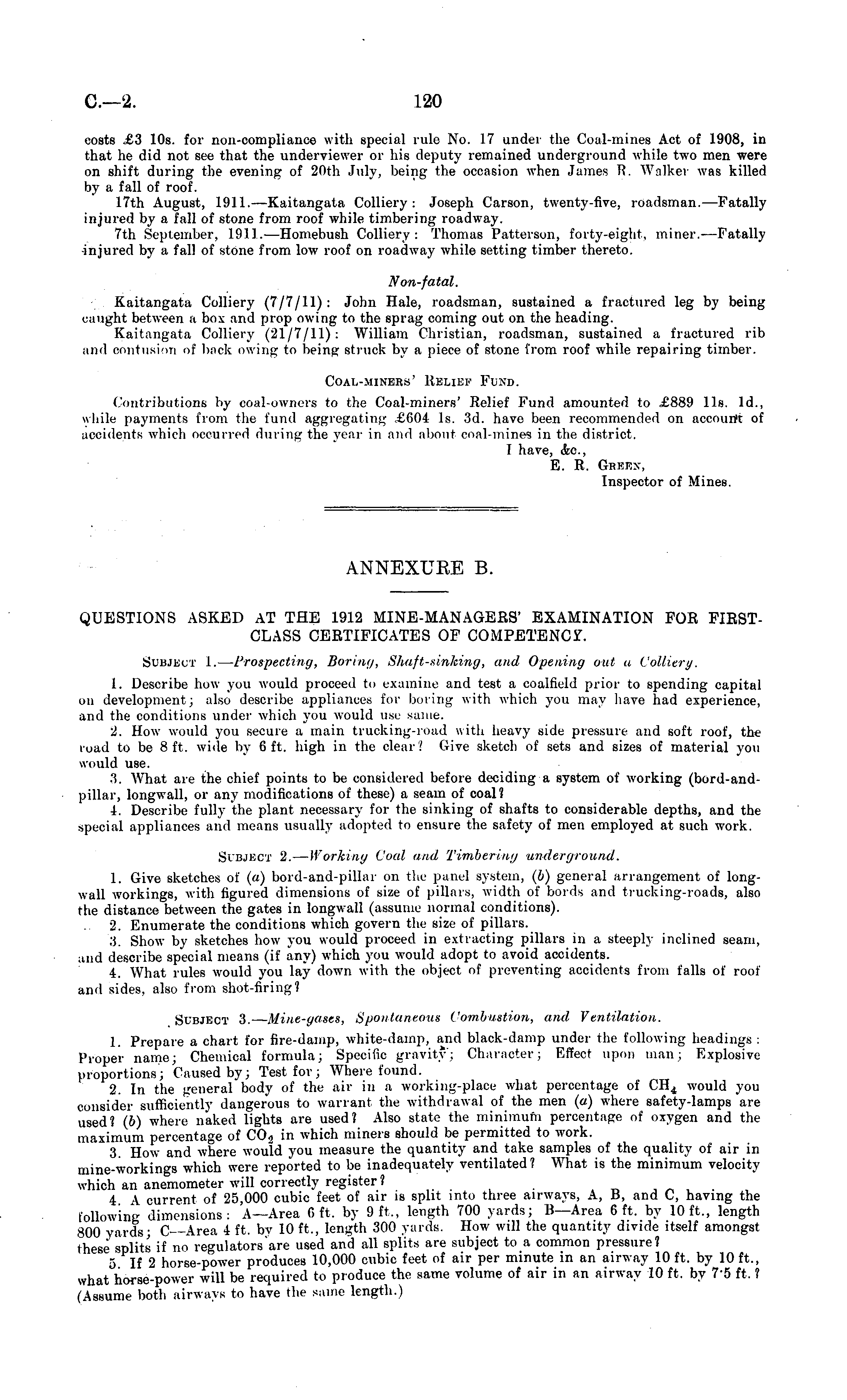 ANNEXUEE B. QUESTIONS ASKED AT THE 1912 MINE-MANAGERS' EXAMINATION FOE FIESTCLASS CEETIFICATES OF COMPETENCE. Subject I.— Prospecting, Boring, Shaft-sinking, and Opening m<l << Colliery. 1. Describe how you would proceed to examine and test a coalfield prior to spending capital on development; also describe appliance.-; for boring with which you may have had experience, ami the conditions under which you would use same. 2. How would you secure a main trucking-road with heavy side pressure- and soft roof, the road to be 8 ft. wide by 6 ft. high in the clear.' (Jive sketch of sets and sizes of material you would use. 3. What are the chief point- to he considered before deciding a system of working (bord-and-pillar, longwall, or any modifications of these) a seam of coal? + . Describe fully the plant necessary for the sinking of shafts to considerable depths, and the special appliances and means usually adopted to ensure the safety of men employed at such work. Subject 2. — Working Goal ami Timbering underground. 1. Give sketches of (a) bord-and-pillar on the panel system, (b) general arrangement of longwall workings, with figured dimensions of size, of pillars, width of bords and trucking-roads, also the distance between the gates in longwall (assume normal conditions). 2. Enumerate the conditions which govern the size of pillars. .!. Show by sketches how you would proceed in extracting pillars in a steeply inclined seam, and describe special means (if any) which you would adopt to avoid accidents. 4. What rules would you lay down with the object of preventing accidents from falls of roof and sides, also from shot-firing? Subject 3. — Mine-gases, Spontaneous Combustion, ami Ventilation. 1. Prepare a chart for fire-damp, white-damp, and black-damp under the following headings : Proper name; Chemical formula; Specific gravity; Character; Effect upon man; Explosive proportions; Caused by; Test for; Where found. 2. In the general body of the air in a working-place what percentage of CH 4 would you consider sufficie'iitly dangerous to warrant the withdrawal of the men (a) where safety-lamps are used? (b) where naked lights are used? Also state the minimum percentage of oxygen and the maximum percentage of CO 2 in which miners should be permitted to work. 3. How and where would you measure the quantity and take samples of the quality of air in mine-workings which were reported to be inadequately ventilated? What is the minimum velocity which an anemometer will correctly register ? 4 k current of 25,000 cubic feet of air is split into three airways, A, B, and C, having the following dimensions: A—Area 6ft. by 9ft., length 700 yards; I?— Area 6ft. by 10ft., length 800 yards , C Area 4 ft. by 10 ft., length 300 yards. How will the quantity divide itself amongst these splits if no legulators'are used and all splits are subject to a common pressure? ', If 2 horse-power produces 10,000 cubic feet of air per minute in an airway 10 ft. by 10 ft., what'horse-power will be required to produce the same volume of air in an airway 10 ft, by 75 ft. ? (Assume both airways to have the same length.)