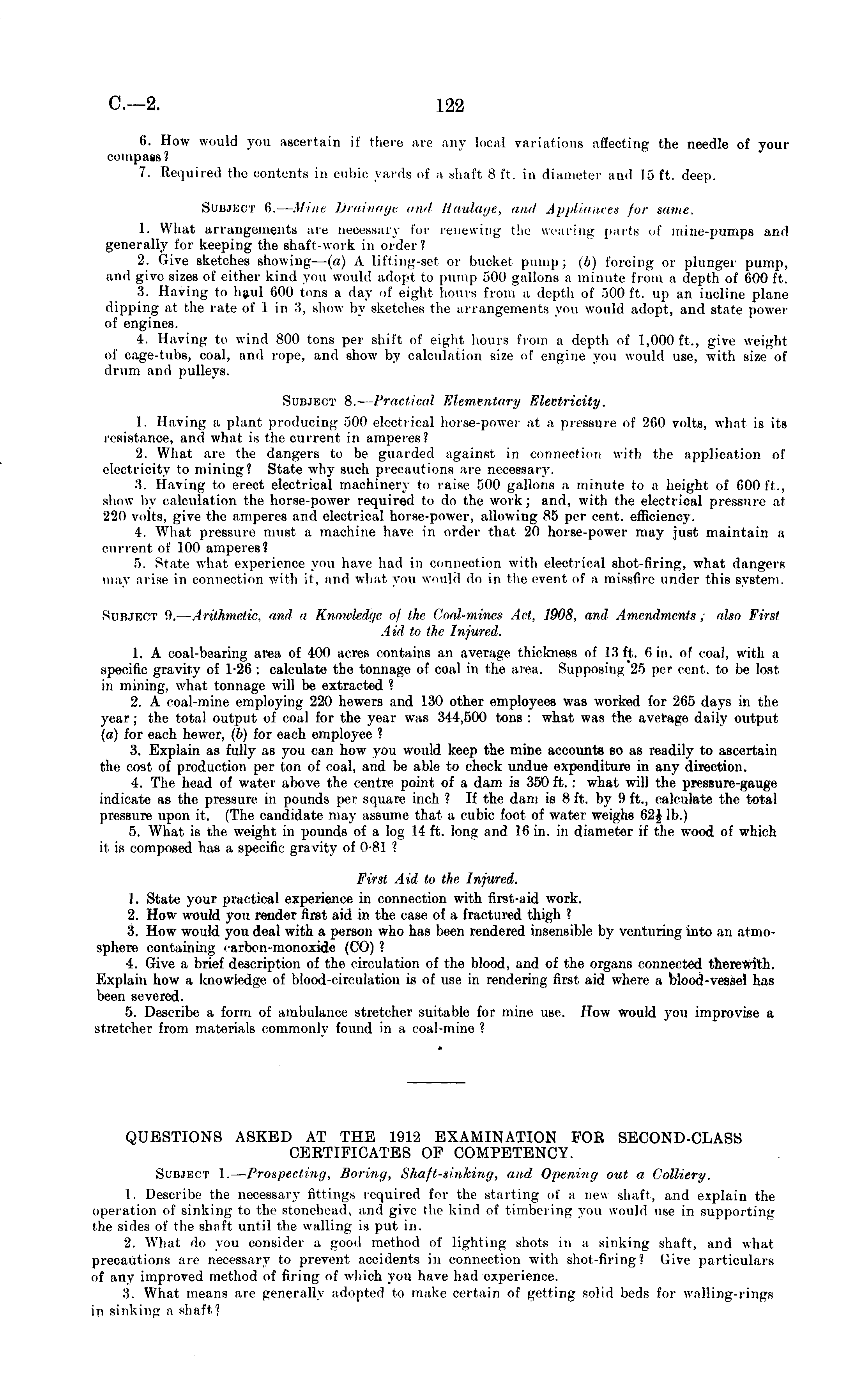 6. How would you ascertain if there are any local variations affecting the needle of your compass? 7. Required the contents in oubic yards of a shaft 8 ft. in diameter and 15 ft. deep. Subject 6. — Mine Drain-age and Haulage, ami Appliances for name. 1. What arrangements are necessary for renewing the wearing pails of mine-pumps and generally for keeping the shaft-work in order? 2. Give sketches showing —(a) A lifting-set or bucket pump; (6) forcing or plunger pump, and give sizes of either kind you would adopt to pump 500 gallons a minute from a depth of 600 ft. 3. Having to haul 600 tons a day of eight hours from a depth of 500 ft. up an incline plane (lipping at the rate of 1 in •'!, show by sketches the arrangements you would adopt, and state power of engines. 4. Having to wind 800 tons per shift of eight hours from a depth of 1,000 ft., give weigh) of cage-tubs, coal, and rope, and show by calculation size of engine you would use, with size of drum and pulleys. Subject 8. — Practical Elementary Electricity. 1. Having a plant producing 500 electrical horse-power at a pressure of 260 volts, what is its resistance, and what is the current in amperes? 2. What are the dangers to be guarded against in connection with the application of electricity to mining? State why such precautions are necessary. ■"i. Having to erect electrical machinery to raise 500 gallons a minute to a height of 600 ft., show by calculation the horse-power required to do the work; and, with the electrical pressure at 220 volts, give the amperes and electrical horse-power, allowing 85 per cent, efficiency. 4. What pressure must a machine have in order that 20 horse-power may just maintain a current of 100 amperes? 5. State what experience you have had in connection with electrical Rhot-firing, what dangers may arise in connection with it. and what you would do in the event of n missfire under this system. Subject o.— Arithmetic, and a Knowledge of the Coal-mines Act, 1908, and Amendments; also First Aiil to the Injured. 1. A coal-bearing area of 400 acres contains an average thickness of 13 ft. 6 in. of coal, with a specific gravity of 1-26 : calculate the tonnage of coal in the area. Supposing 25 per cent. to be lost. in mining, what tonnage will be extracted ? 2. A coal-mine employing 220 hewers and 130 other employees was worked for 265 days in the year ; the total output of coal for the year was 344,500 tons : what was the average daily output (a) for each hewer, (6) for each employee ? 3. Explain as fully as you can how you would keep the mine accounts so as readily to ascertain the cost of production per ton of coal, and be able to check undue expenditure, in any direction. 4. The head of water above the centre point of a dam is 350 ft. : what will the pressure-gauge indicate as the pressure in pounds per square inch ? If the dam is 8 ft. by 9 ft., calculate the total pressure upon it. (The candidate may assume that a cubic foot of water weighs 624 lb.) 5. What is the weight in pounds of a log 14 ft. long and 16 in. in diameter if the wood of whii-h it is composed has a specific gravity of 0-81 ? First Aid to the Injured. 1. State your practical experience in connection with first-aid work. 2. How would you render first aid in the case of a fractured thigh ? 3. How would you deal with a person who has been rendered insensible by venturing into an atmosphere containing < arbcn-monoxide (CO) ? 4. Give a brief description of the circulation of the blood, and of the organs connected therewith. Explain how a knowledge of blood-circulation is of use in rendering first aid where a blood-vessel has been severed. 5. Describe a form of ambulance stretcher suitable for mine use. How would you improvise a stretcher from materials commonly found in a, coal-mine ?